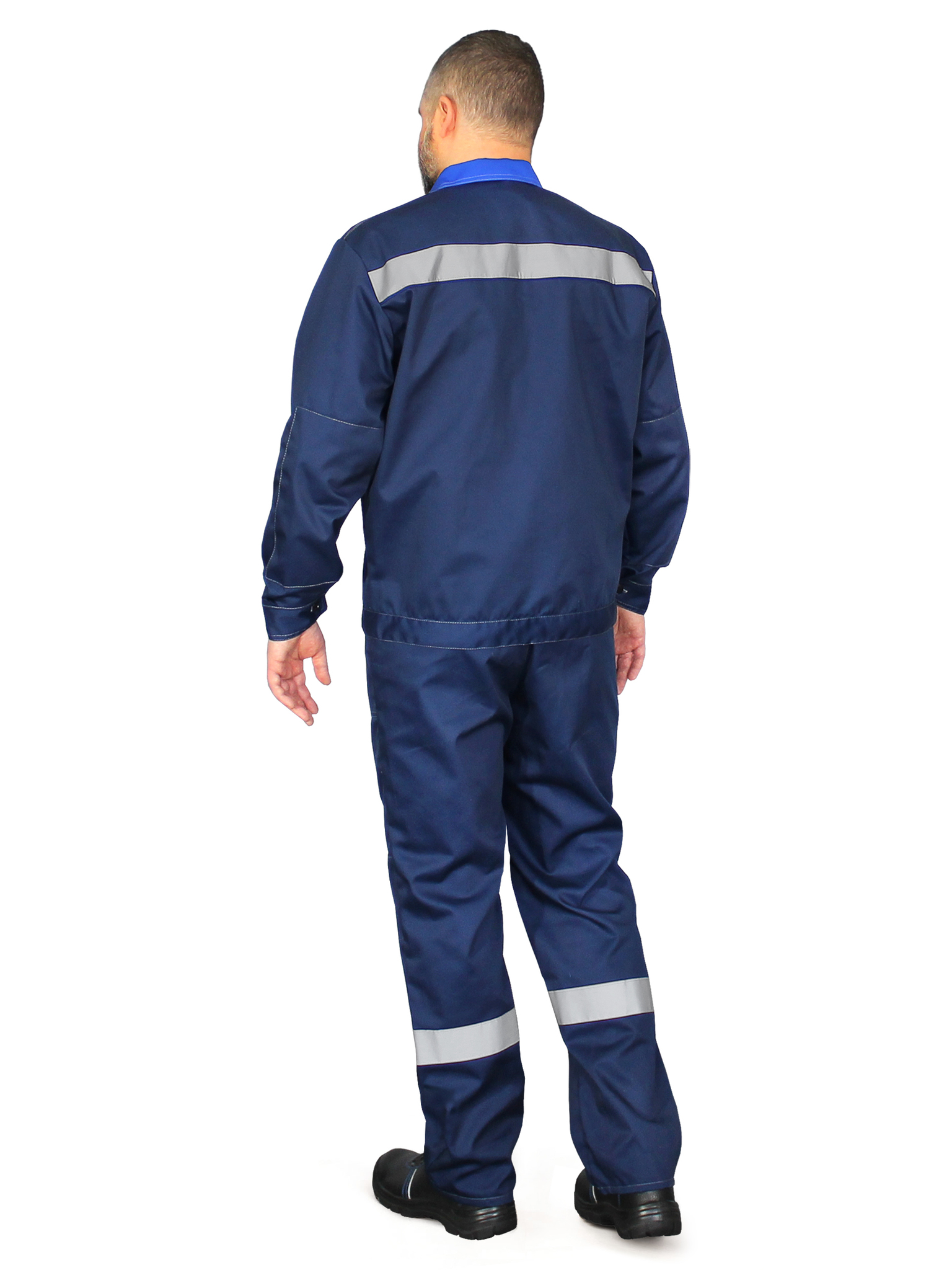 Куртка прямого силуэта c притачным поясом и отложным воротником. Центральная бортовая супатная застёжка на пуговицы. На куртке имеются два нагрудных, где левый карман с клапаном на текстильной застёжке, и два нижних накладных кармана. В области локтей имеются усиления. Манжеты рукавов застёгиваются на пуговицу. На кокетках полочки и спинки, расположена световозвращающая лента шириной 50 мм. Полукомбинезон с регулируемыми бретелями с застежкой на фастексы. По талии спинки - резинка. Объём полукомбинезона регулируется при помощи пуговиц, расположенных с правой стороны. Имеется один центральный карман с клапаном и боковые карманы с косым входом. По нижней части полукомбинезона расположена световозвращающая лента шириной 50 мм. В области коленей имеются усиления.