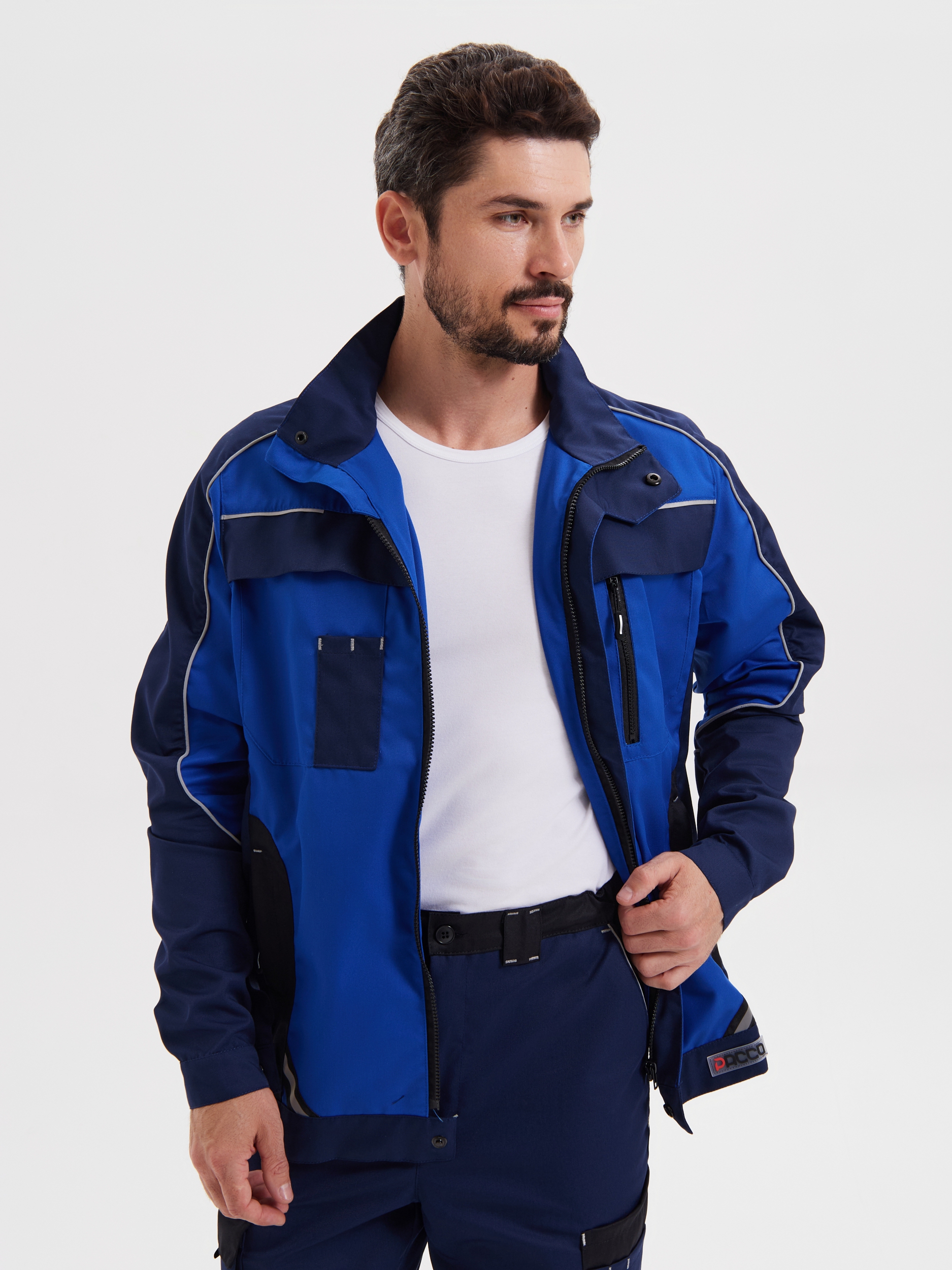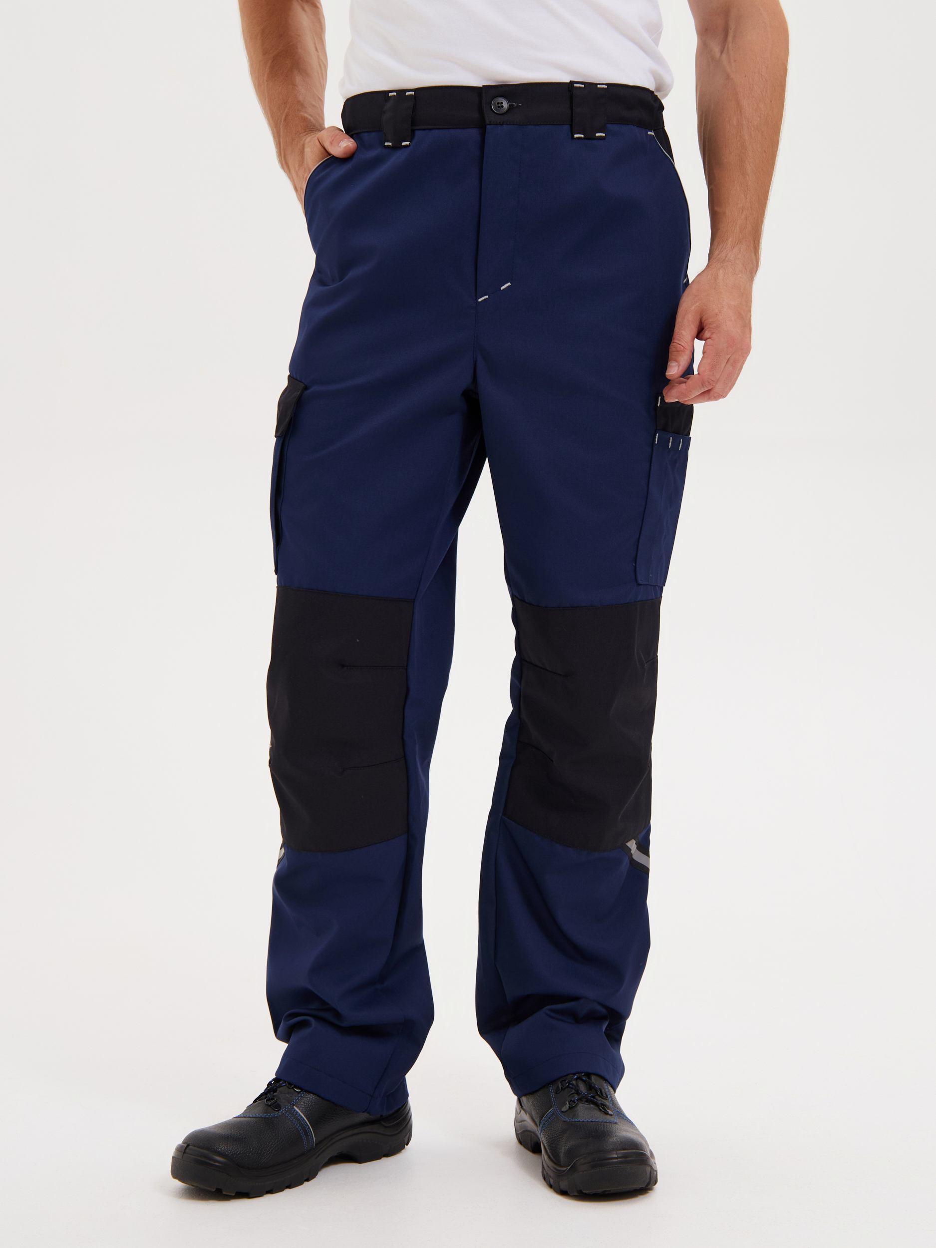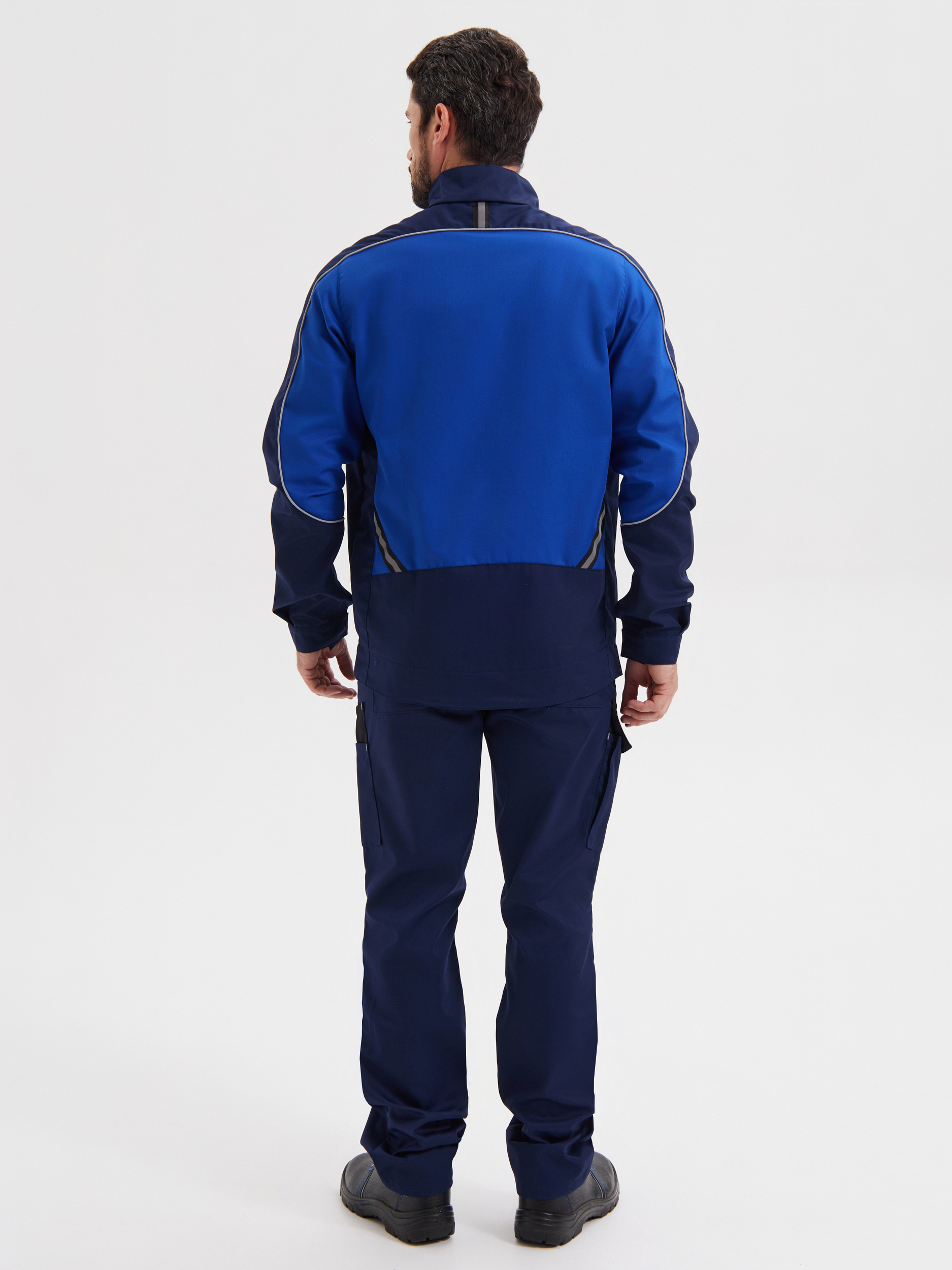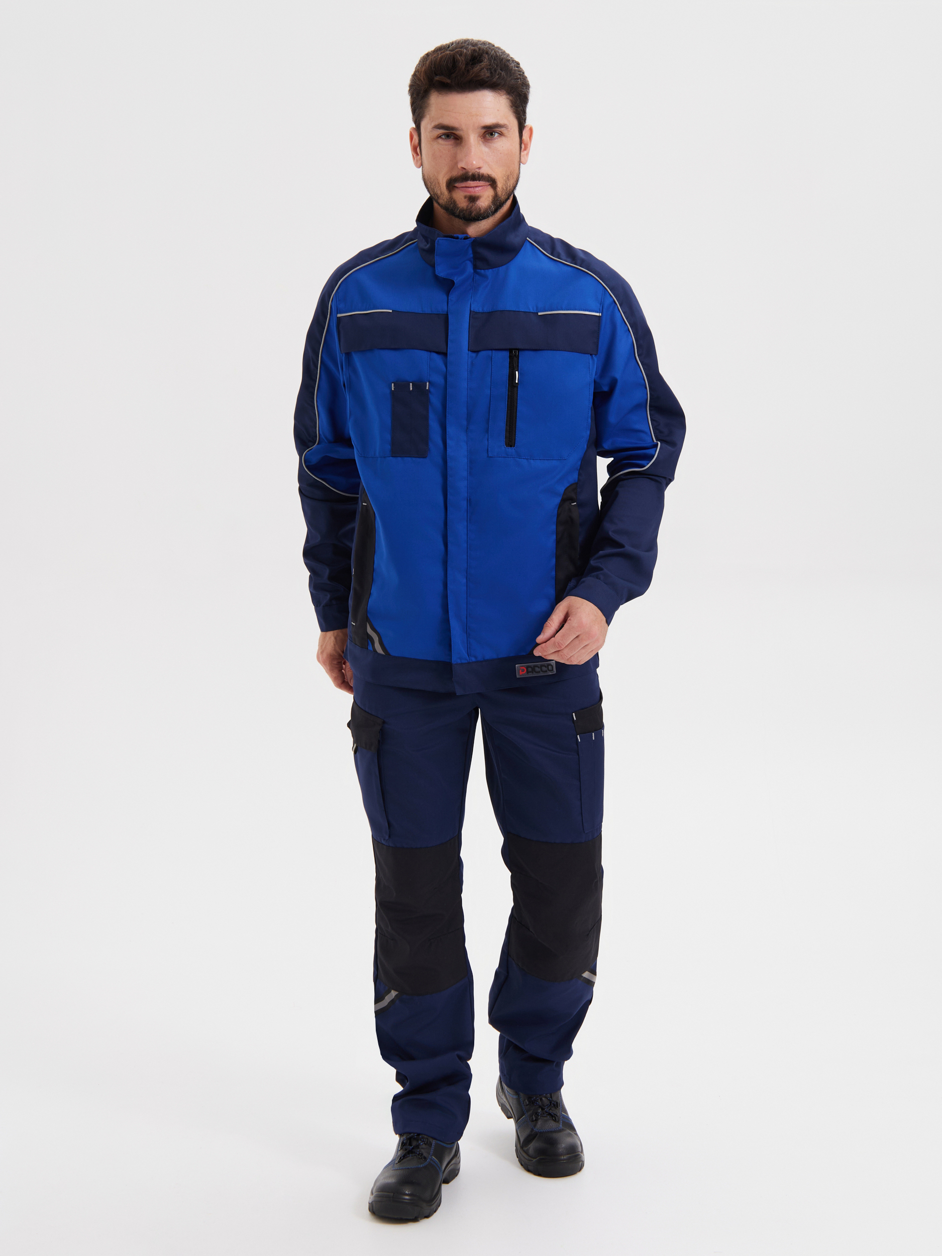 Куртка прямого силуэта с воротником-стойкой, с центральной застёжкой на молнию и ветрозащитный клапан застёгивающийся на две потайные кнопки. Два нагрудных и два боковых кармана. Верхний левый карман накладной с дополнительным накладным отделом для карандаша. Верхний правый карман накладной с застёжкой - “молнией”. Нижние боковые карманы вертикальные с застёжкой на молнию. Брюки с центральной застежкой на молнию с резинкой по боковым сторонам пояса. Пояс со шлевками. Функциональные карманы по бокам. Усилительные объемные наколенники из ткани КАРДУРА предохраняют от протирания.