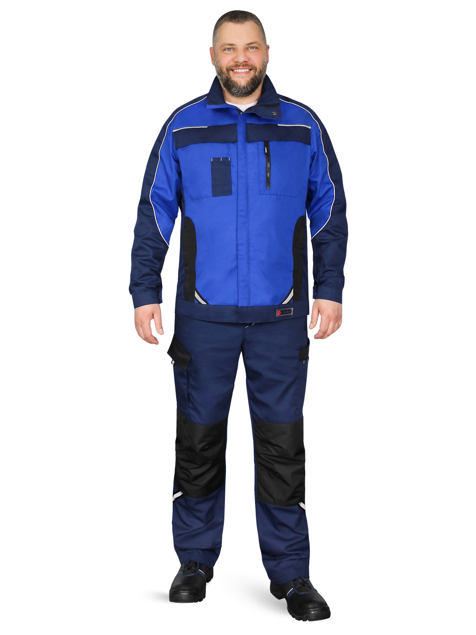 Куртка прямого силуэта с воротником-стойкой, с центральной застёжкой на молнию и ветрозащитный клапан застёгивающийся на две потайные кнопки. Два нагрудных и два боковых кармана. Верхний левый карман накладной с дополнительным накладным отделом для карандаша. Верхний правый карман накладной с застёжкой - “молнией”. Нижние боковые карманы вертикальные с застёжкой на молнию. Брюки с центральной застежкой на молнию с резинкой по боковым сторонам пояса. Пояс со шлевками. Функциональные карманы по бокам. Усилительные объемные наколенники из ткани КАРДУРА предохраняют от протирания.