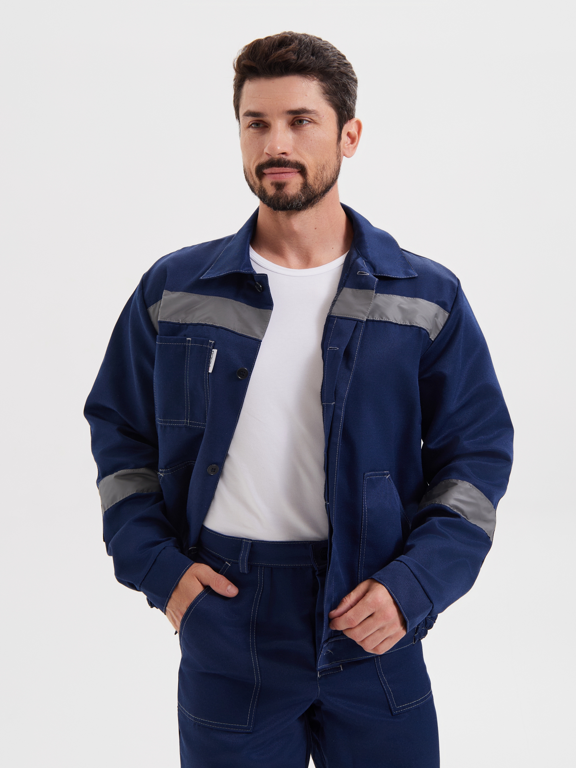 - широкие световозвращающие полосы по низу кокеток, в области локтей и колен,