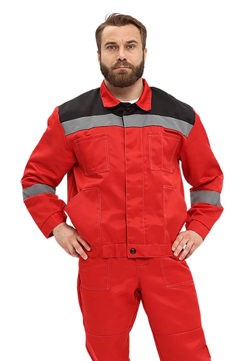 Костюм мужской, летний, прямого силуэта, состоит из куртки и полукомбинезона. Куртка: - центральная супатная застежка на пуговицы - отложной воротник - кокетки полочек и спинки выделены световозвращающей лентой СОП - нагрудные накладные карманы с отделением под ручку - нижние объемные накладные карманы - рукав на притачной манжете с застежкой на пуговицу, выделены световозвращающей лентой СОП, в области локтя-усилительные накладки - притачной, регулируемый по ширине за счет эластичной тесьмы “резинка” по боковым сторонам, пояс Полукомбинезон: - отрезная грудка на притачном поясе; - регулируемые по длине бретели; - нагрудный карман с защитным клапаном на контактной ленте “липучка” - объемные боковые накладные карманы; - центральная застежка гульфик на молнии - дополнительная застежка на пуговицу в правом боковом шве - линия талии спинки регулируется по ширине за счет эластичной тесьмы “резинка” - нижняя часть выделена световозвращающей лентой СОП