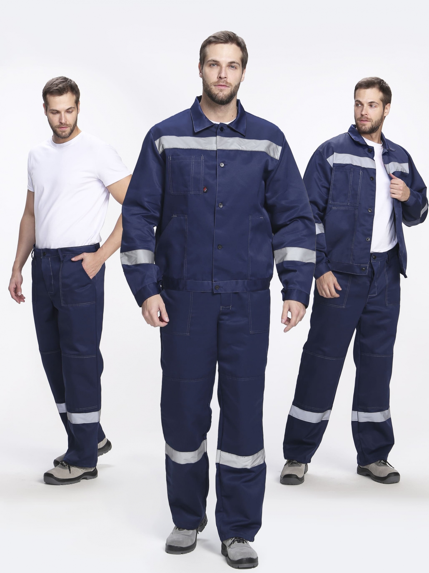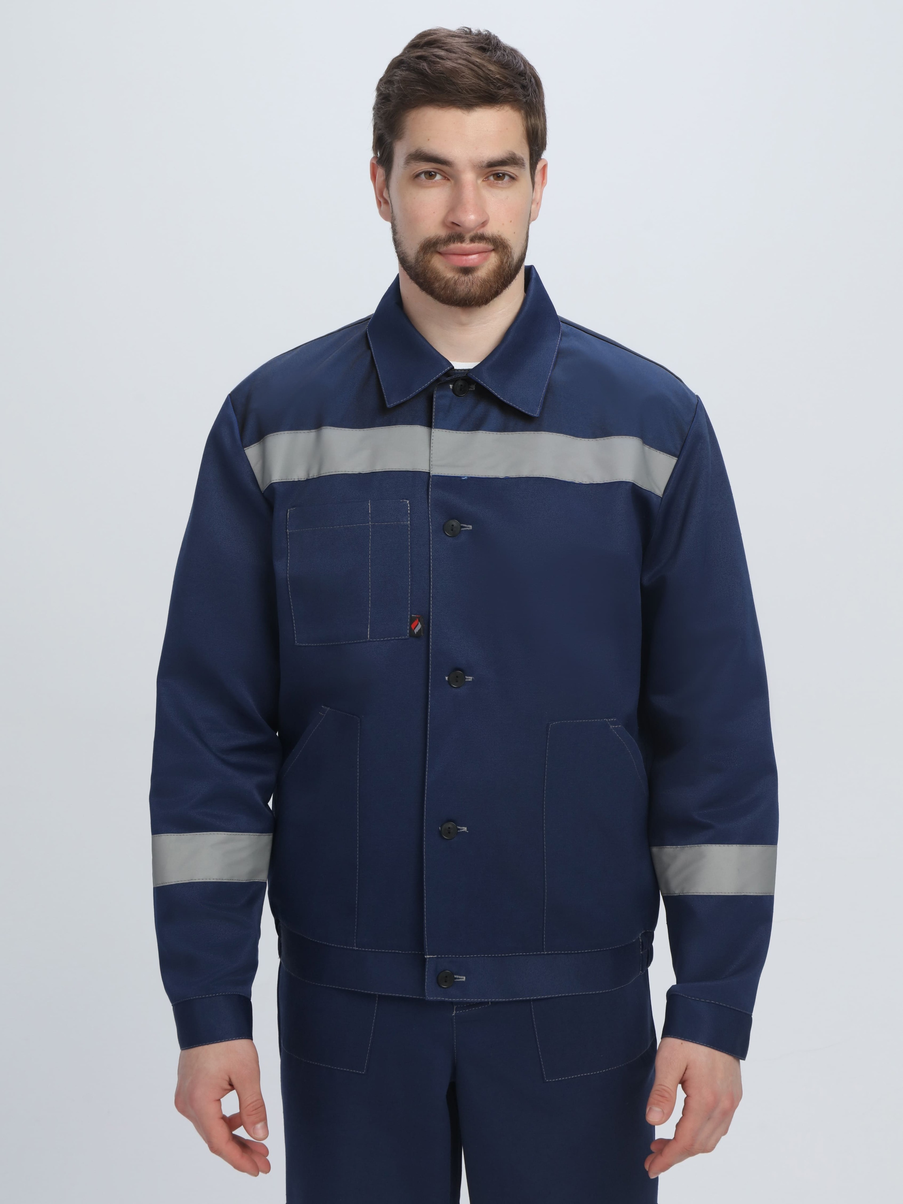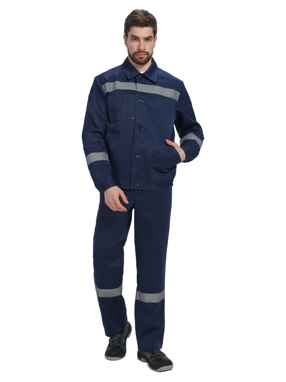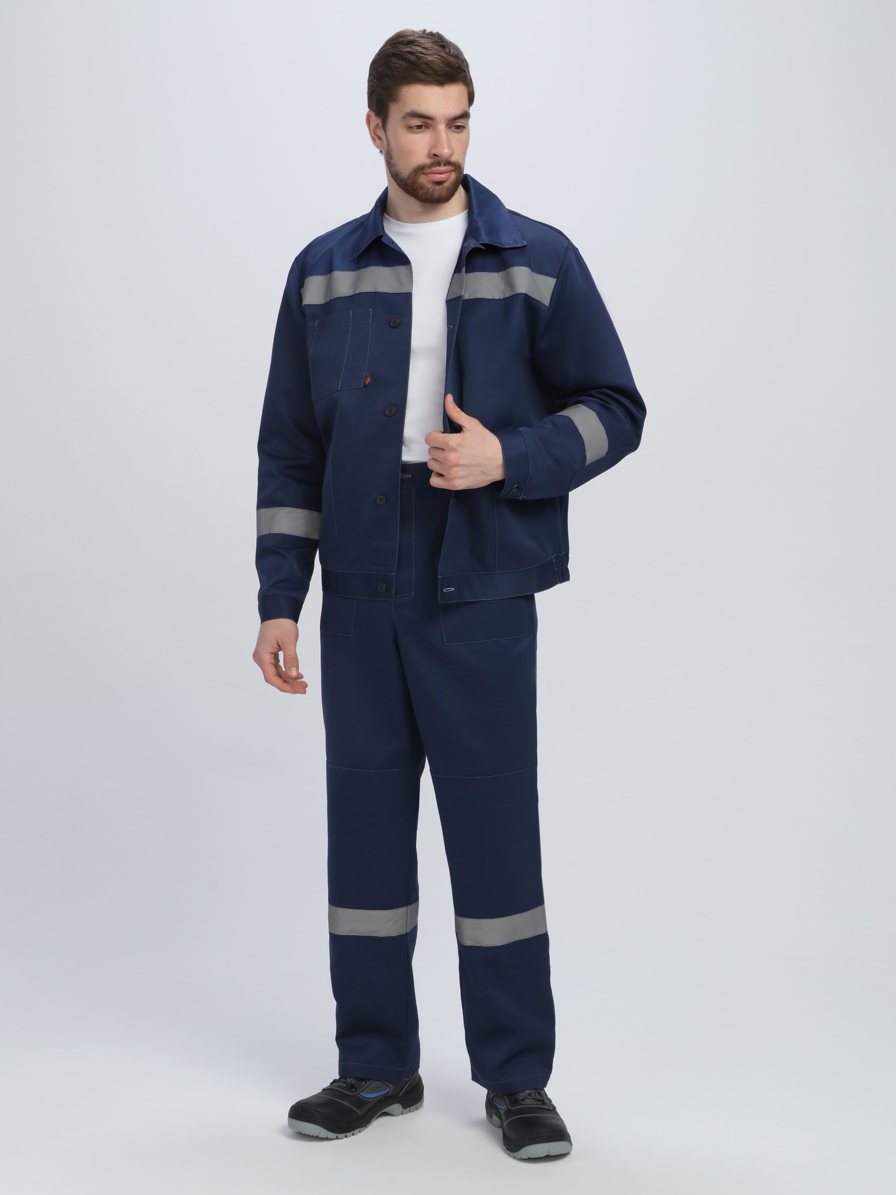 Рабочий костюм «Легион-1 СОП», состоящий из двух предметов (рабочая мужская куртка на пуговицах и рабочие брюки), оснащен широкими светоотражающими полосами 50 мм для безопасной работы в местах с плохим освещением. Благодаря усилению плечевого и шагового шва, а также усилительным накладкам в области колен и локтей униформа отличается повышенной надежностью, износостойкостью и длительным периодом эксплуатации. Костюм рабочий изготовлен по ГОСТ, с изнаночной стороны брюк и куртки расположены этикетки для указания ФИО. Летняя рабочая куртка прямого кроя с регулировкой по объему на поясе не стесняет движения, очень удобна в работе. Для хранения записей предусмотрен нагрудный карман с лентой для фиксации бейджа и отделением под ручку. Рабочие брюки с карманами застегиваются на пуговицы, а также могут фиксироваться ремнем для дополнительного удобства.