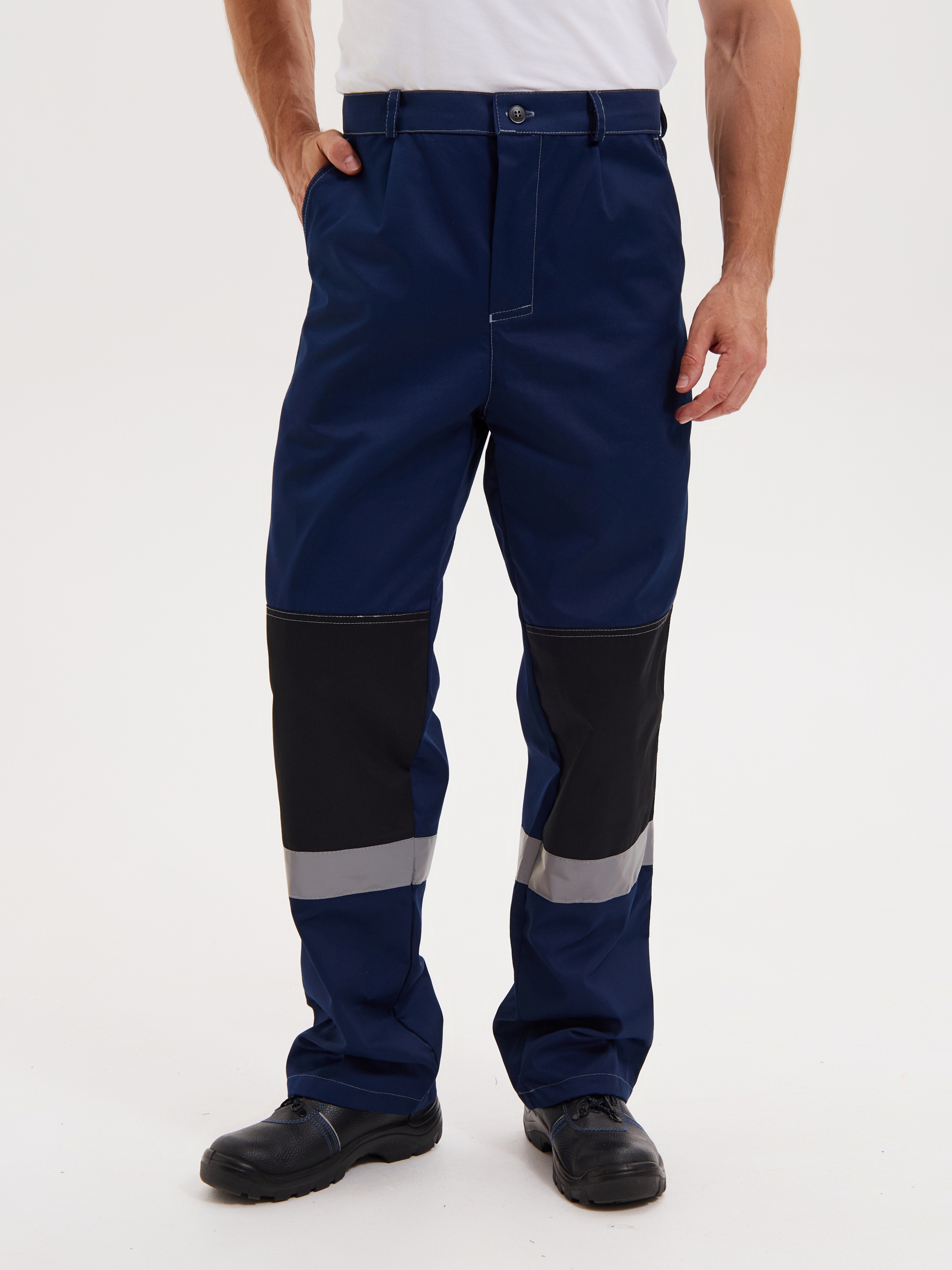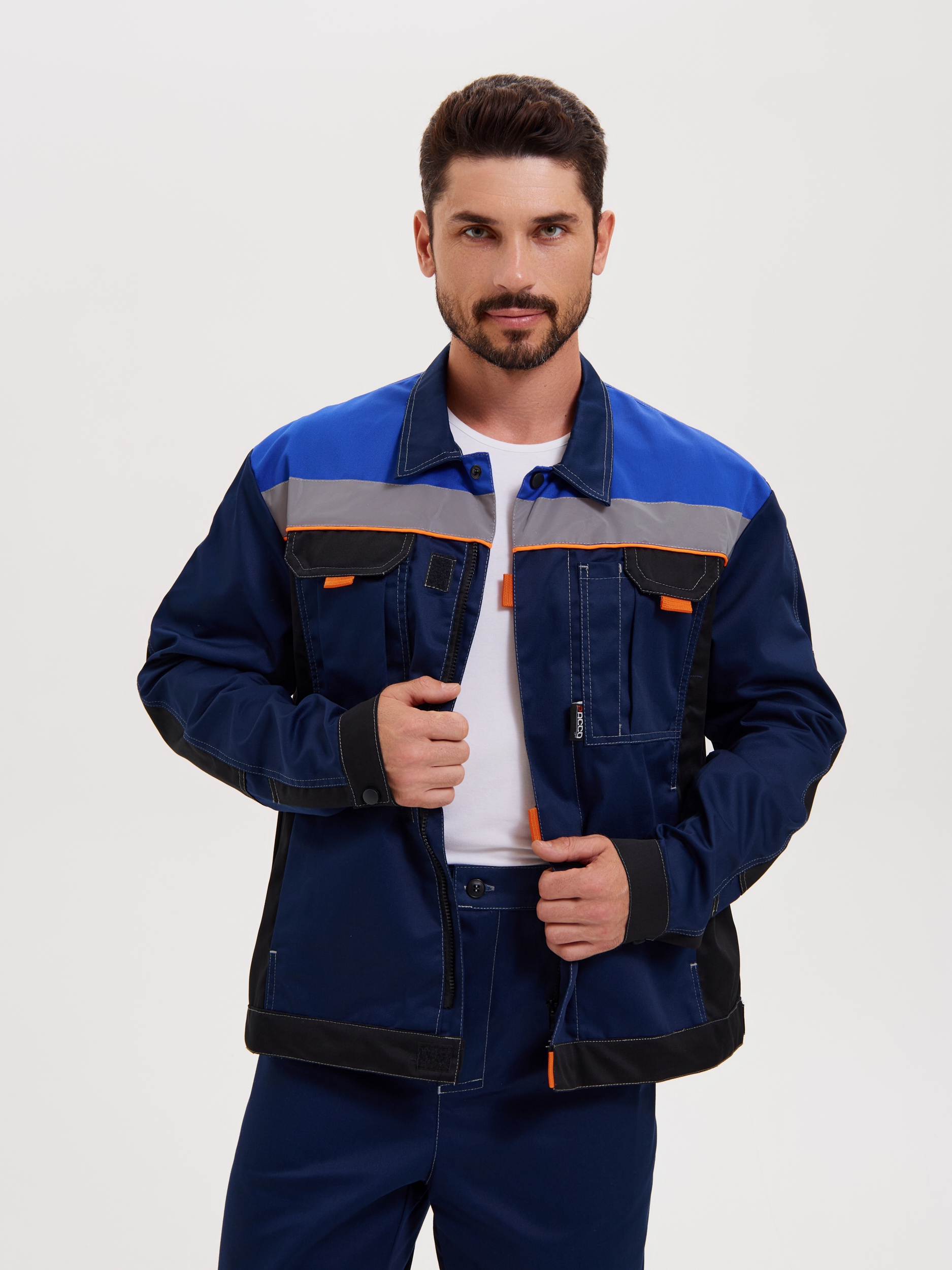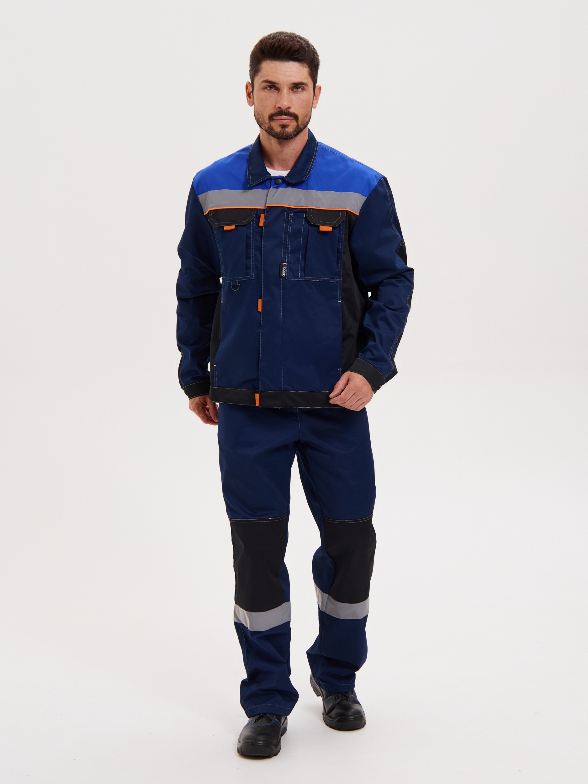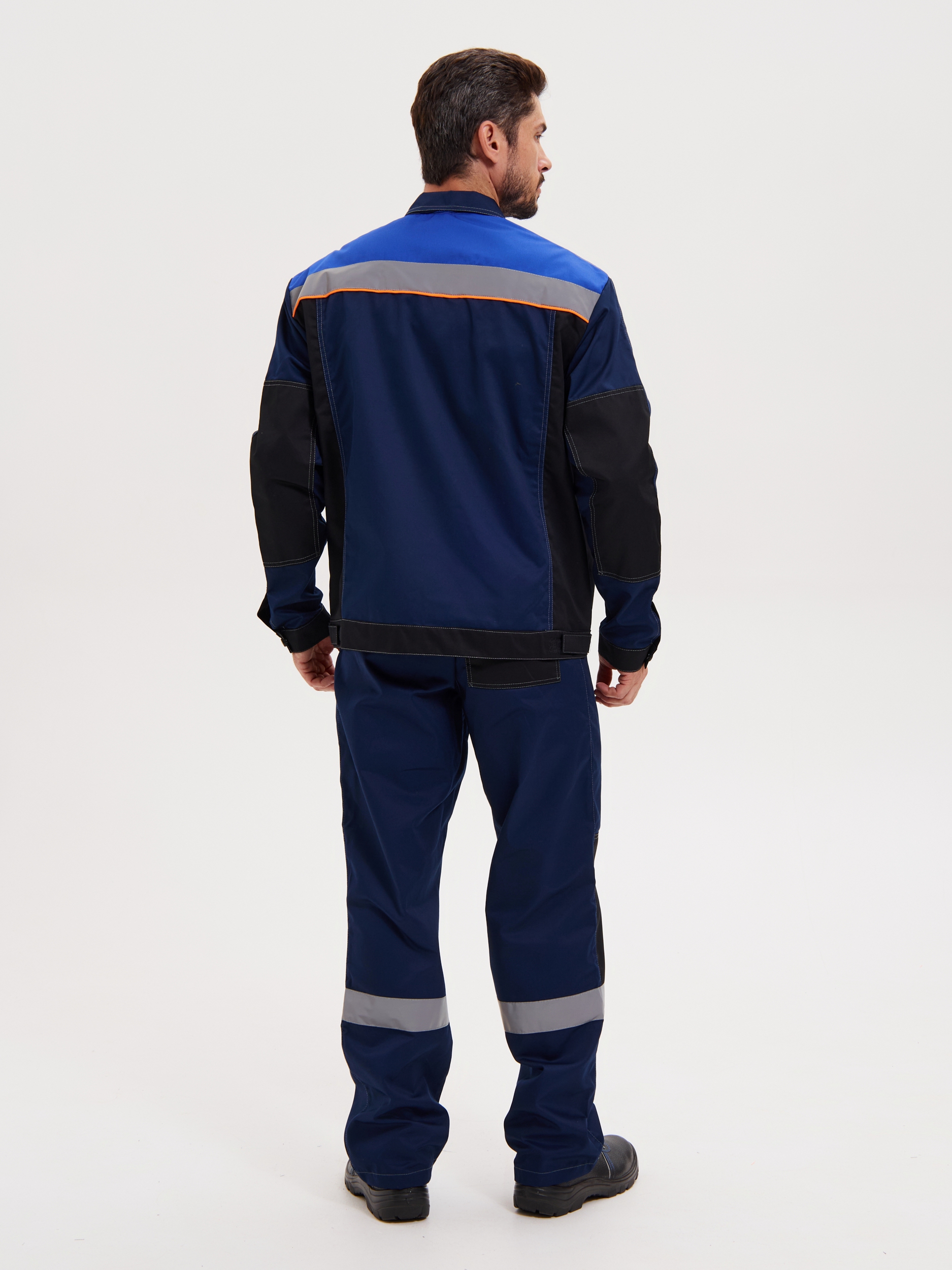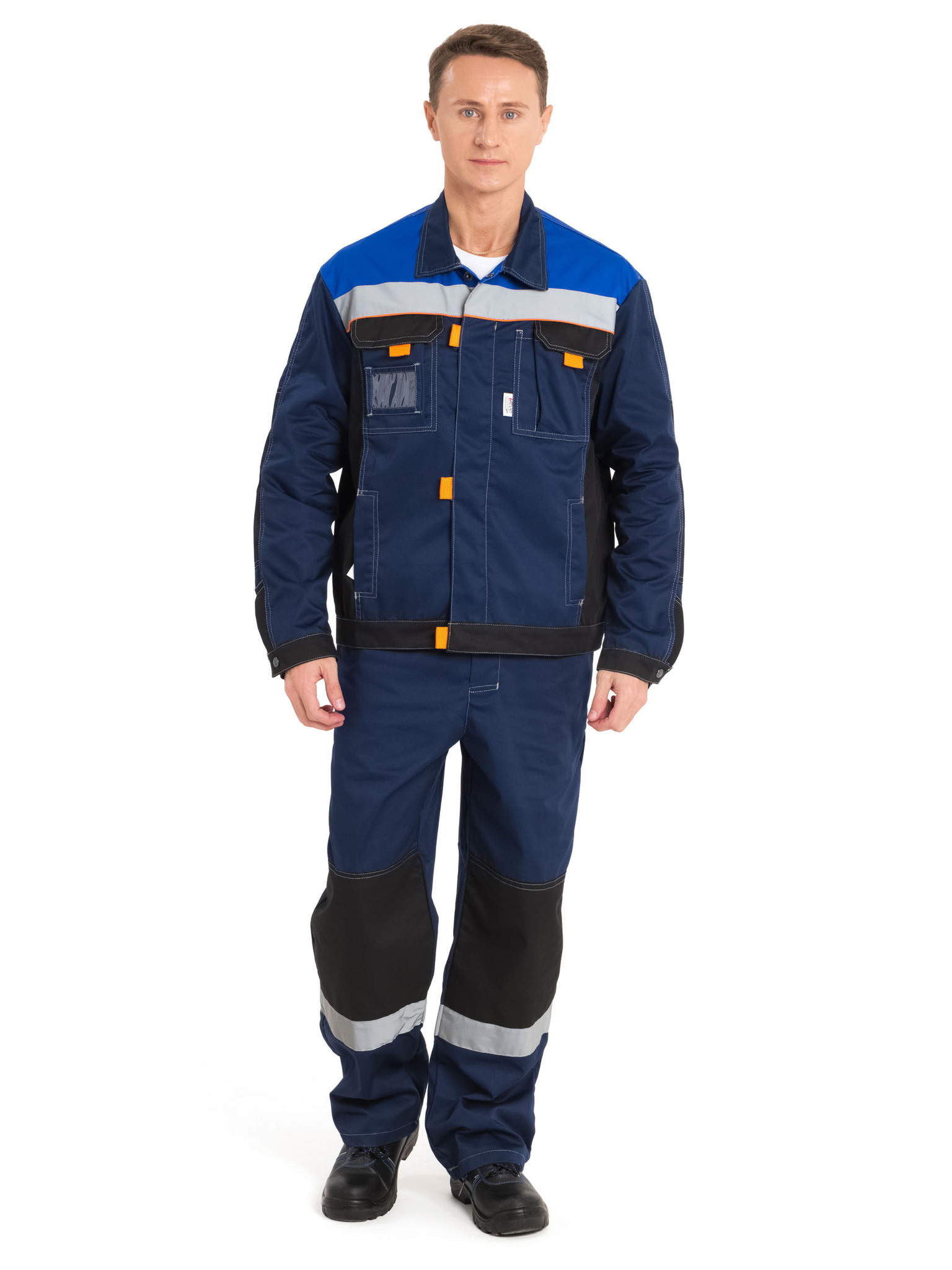 Костюм состоит из куртки и брюк. Куртка укороченная с центральной супатной застежкой на молнию и контактную ленту, с притачным поясом, с втачными рукавами и отложным воротником. Усиления в области локтей. Куртка оснащена двумя боковыми врезными и двумя нагрудными накладными много- функциональными карманами. На левом кармане имеется отделение для ручек. На правом кармане расположена рамка с пленкой с боковым входом для бейджа. В подмышечных впадинах – люверсы. Светоотражающие полосы шириной 50 мм расположены: спереди в верхней части кокетки, что позволяет обеспечить видимость работника как спереди, так и с верху; на спине - по линии кокетки на полочке. Брюки на притачном поясе. Гульфик на молнии. На передних половинках брючин имеются боковые накладные карманы с косым входом. Усиления в области коленей. На спинке объем талии регулируется при помощи резинки. Светоотражающая полоса расположена ниже колен.