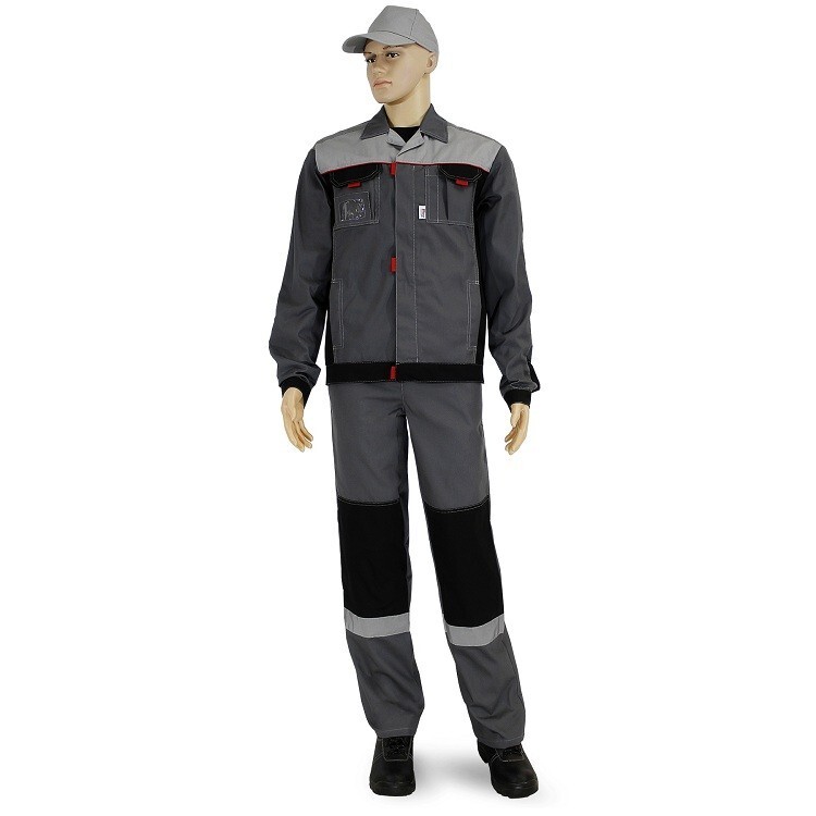 Куртка укороченная с центральной супатной застежкой на молнию и контактную ленту, с притачным поясом, с втачными рукавами и отложным воротником. Усиления в области локтей и коленей. Куртка оснащена двумя боковыми внутренними и двумя нагрудными накладными многофункциональными карманами. На левом кармане имеется отделение для ручек. На правом кармане расположена рамка с пленкой с боковым входом для бейджа. В подмышечных впадинах – люверсы для дополнительной вентиляции и комфортной работы. Светоотражающие полосы шир.50мм расположены - спереди в верхней части кокетки, что позволяет обеспечить видимость работника как спереди так и с верху; на спине по линии кокетки на полочке.