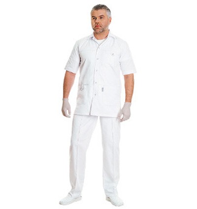 Блуза прямого силуэта с короткими рукавами, накладными карманами с хлястиками на кнопках. Центральная застежка на кнопках. Брюки прямые, пояс регулируется эластичной лентой.