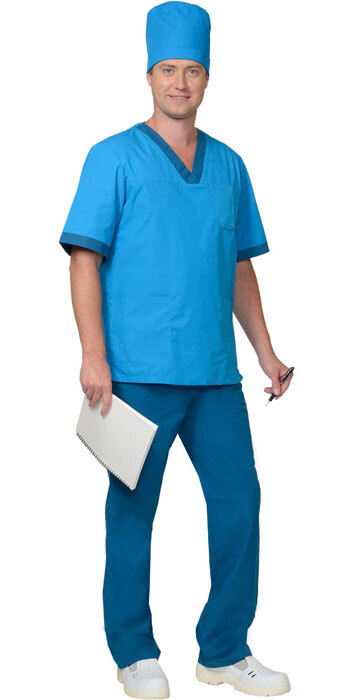 Куртка прямого покроя с V-образным вырезом горловины. На полочке один верхний и два нижних накладных кармана. Рукава короткие. Вырез горловины и манжеты рукавов из контрастной ткани.