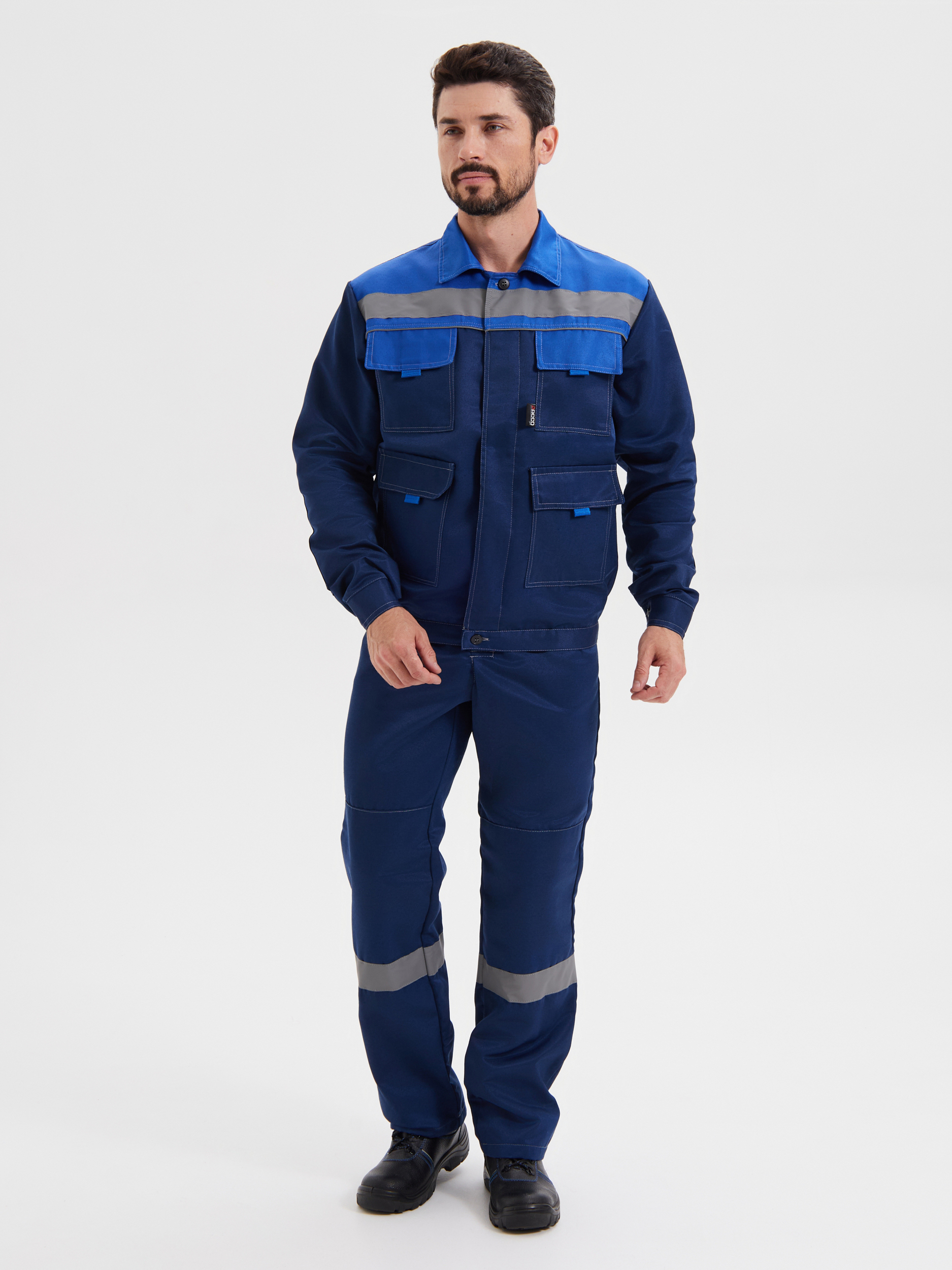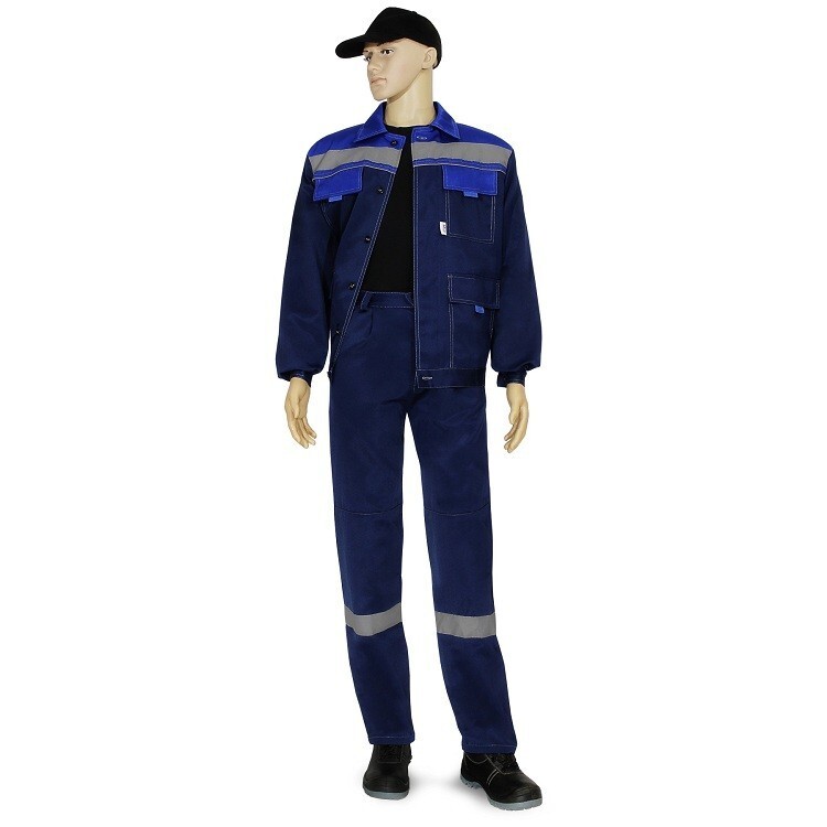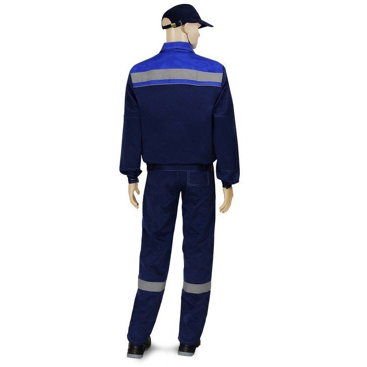 Световозвращающая полоса по линии кокетки на полочках, на спине и по нижней части брюк, шириной 50 мм. Все швы с контрастной отстрочкой. В области локтей и коленей усиления.