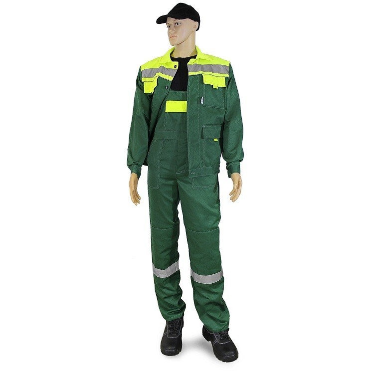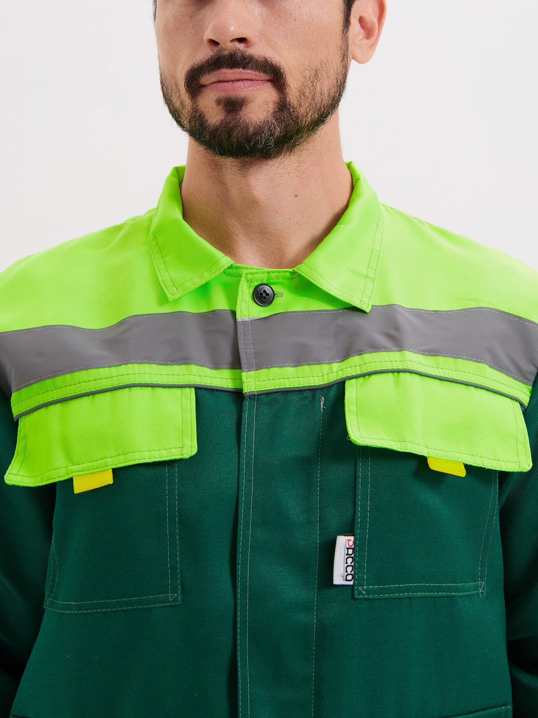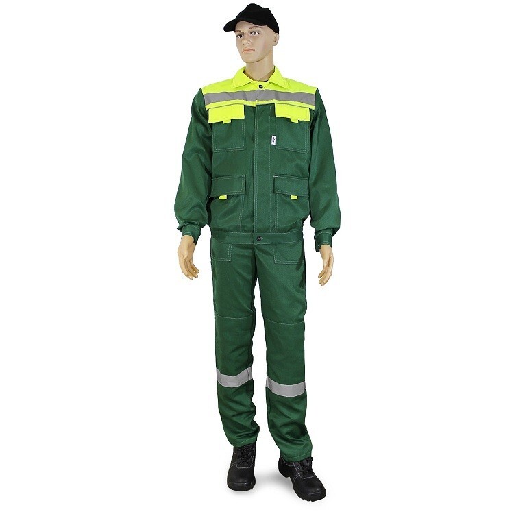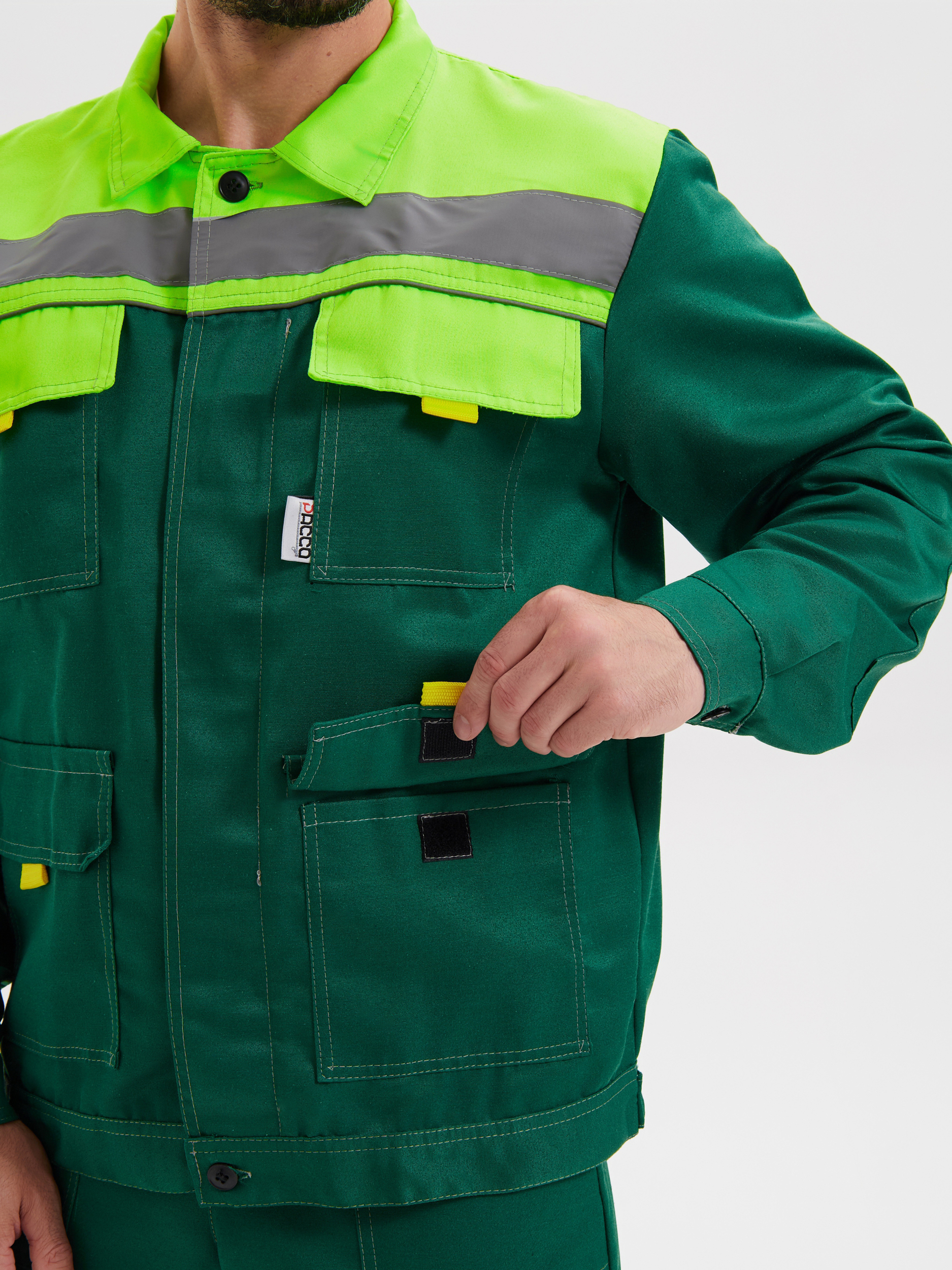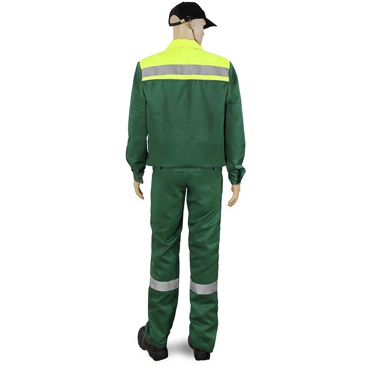 Куртка прямого силуэта с супатной застежкой на пуговицы, с притачным поясом. Объём по бокам регулируется при помощи ленты велькро. Отложной воротник. Световозвращающая полоса по линии кокетки на полочках, на спине и по нижней части брюк, шириной 50 мм. На куртке имеются накладные карманы с клапанами : два нагрудных и два нижних. Манжеты рукавов застёгиваются на пуговицу.
