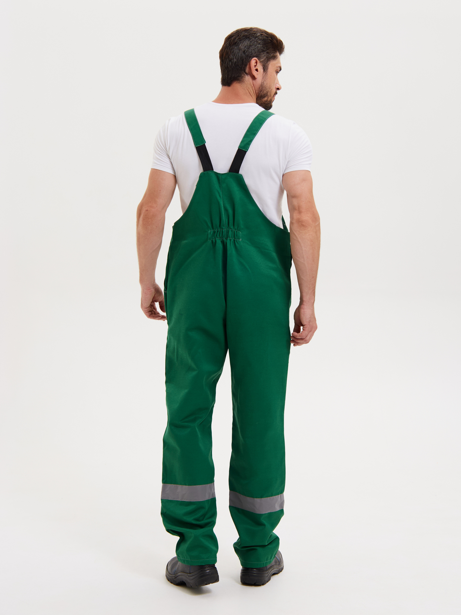 Полукомбинезон с регулируемыми бретелями с застежкой на фастексы. По талии спинки - резинка. Объём полукомбинезона регулируется при помощи пуговиц, расположенных с правой стороны. Имеется один центральный карман с клапаном и боковые карманы с косым входом. Все швы с контрастной отстрочкой. В области локтей и коленей усиления.