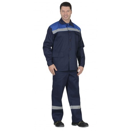 Куртка длинная, с центральной застежкой на пуговицы. отложным воротником, верхним и нижними накладными карманами с клапанами. Рукава с манжетами на пуговицах. Брюки прямого покроя, с застежкой гульфика на пуговицы, боковыми накладными карманами. В костюме предусмотрены СО полосы.
