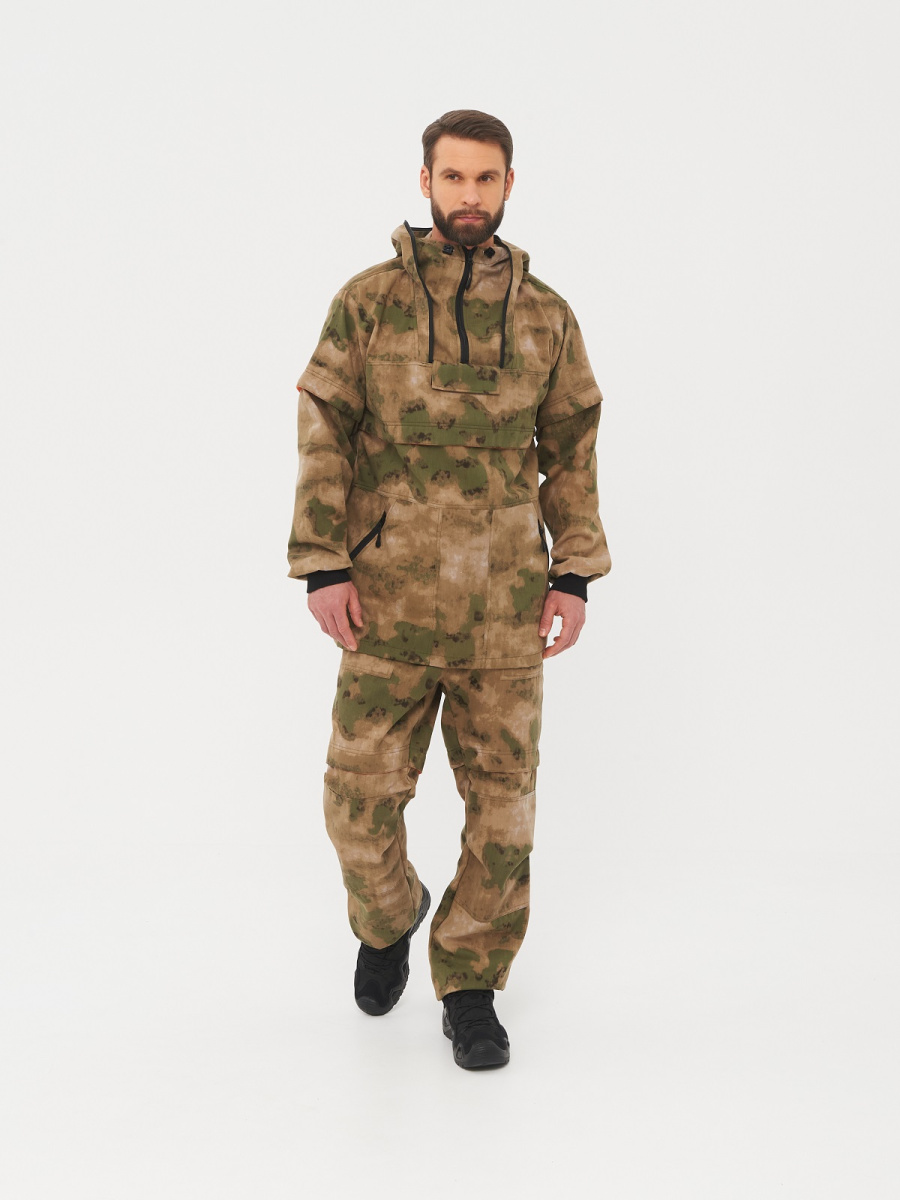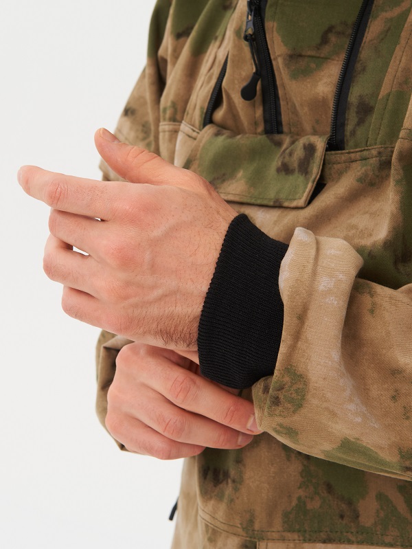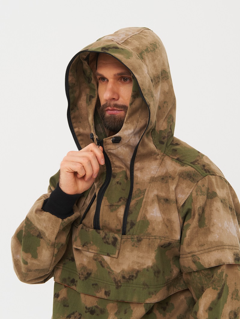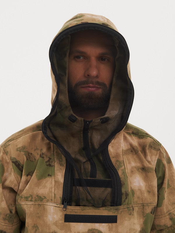 Куртка анорак прямого силуэта с противомоскитной сеткой, убираемой в нагрудный кармашек на липучке. Высокое горло на молнии, капюшон с возможностью регулирования объема. Защитные ловушки на груди и рукавах. Внутренняя сторона ловушек отделана мягким флисом контрастного цвета, чтобы клещ зацепился за ворсинки флиса и был более заметен. Два удобных накладных кармана на молнии, на рукавах трикотажные манжеты, по низу куртки утяжка, внутри куртки бязевая «юбка» для дополнительной защиты от насекомых (ее необходимо заправлять в брюки).