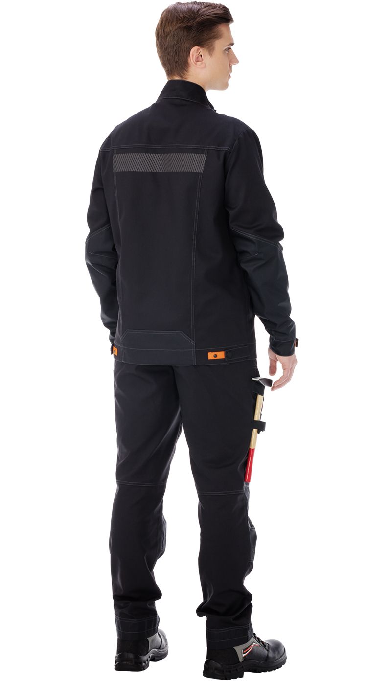 Спинка с кокеткой и рельефами. Регулировка куртки по низу - с помощью хлястиков и кнопок. На центральной части спинки - световозвращающие термотрансферы, по низу куртки - усилительная накладка.