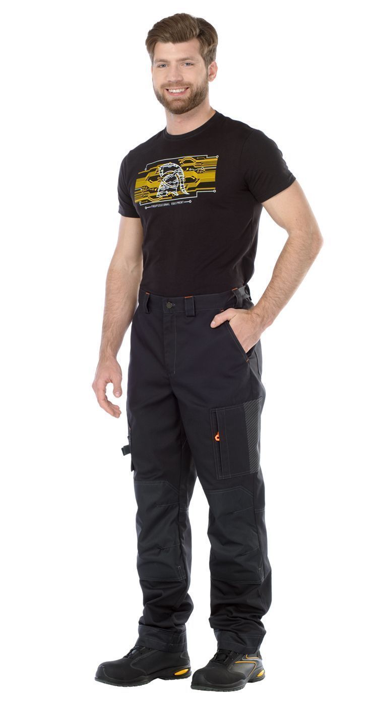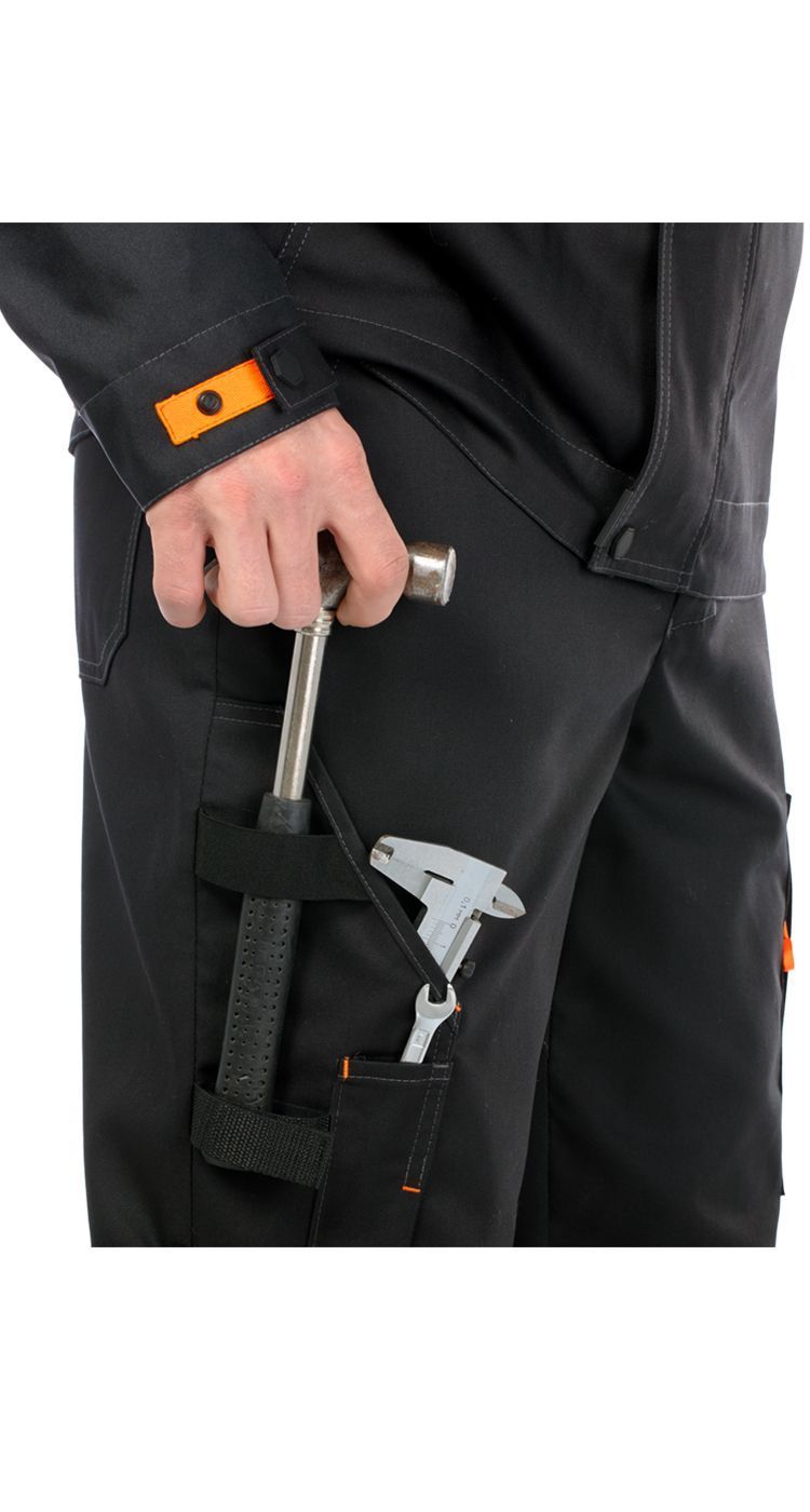 В области боковых швов брюк на уровне середины бедер расположены карманы на молнии и для инструментов. На левом кармане - световозвращающий термотрансфер.