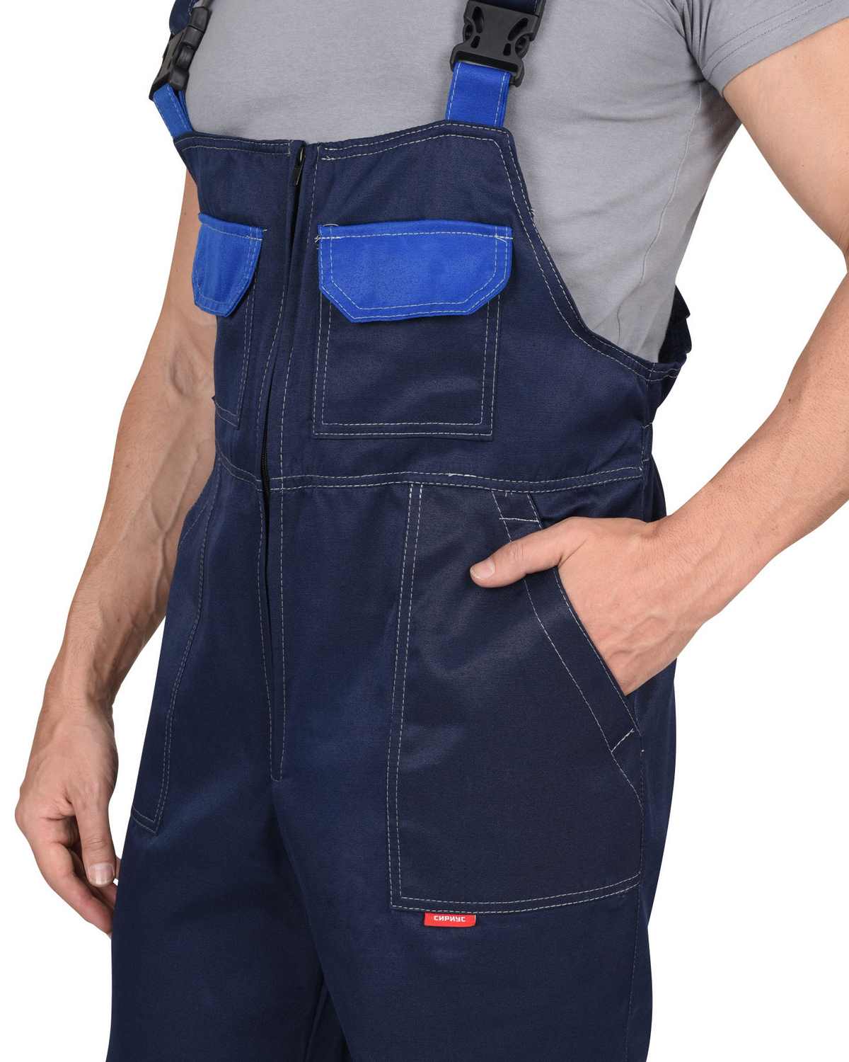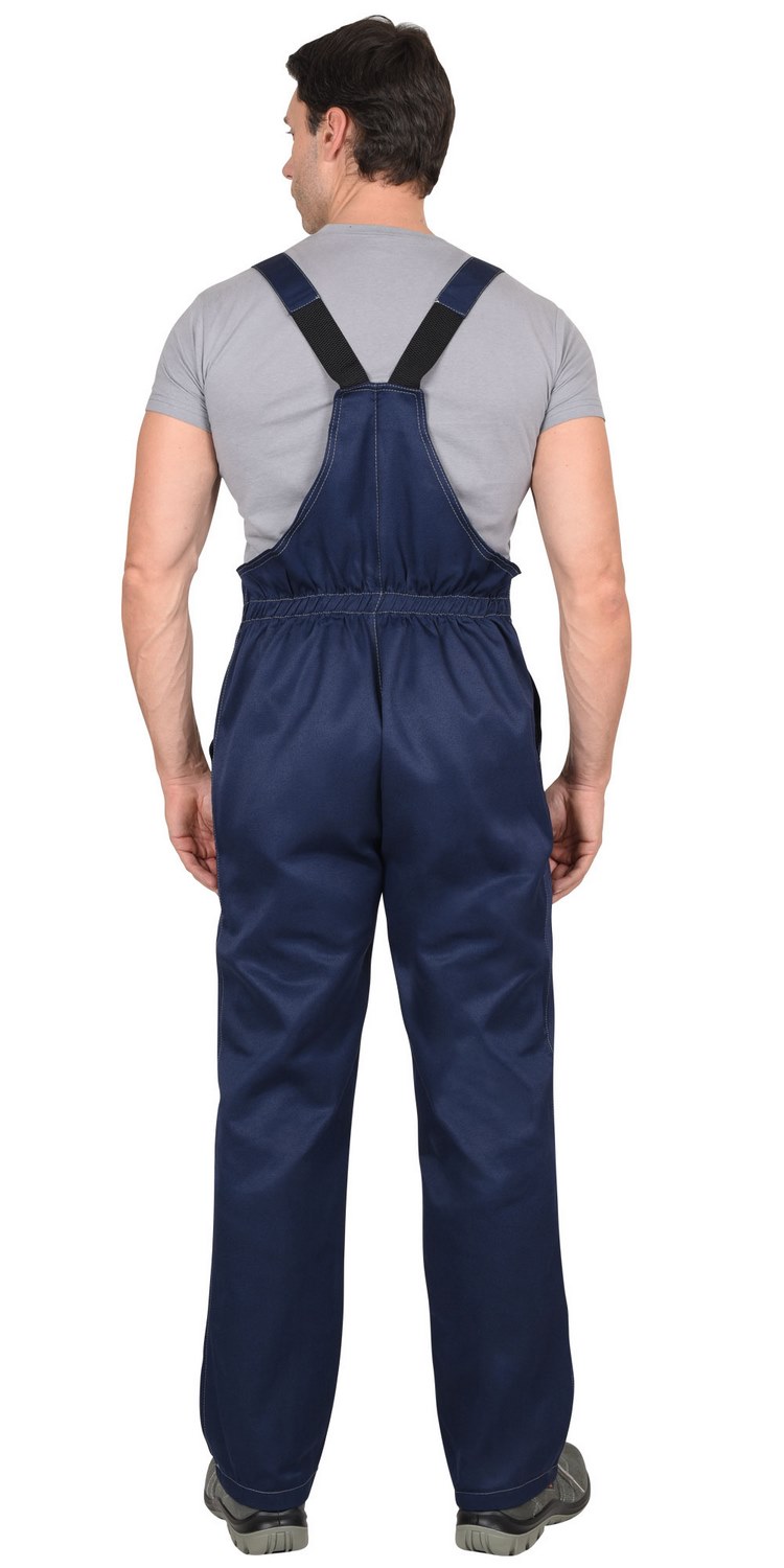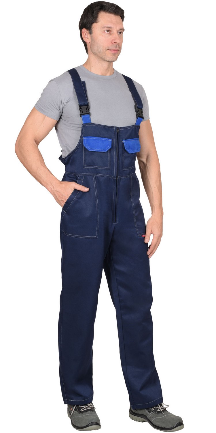 Полукомбинезон с центральной закрытой застежкой на тесьму-«молнию»; притачным нагрудником; боковыми накладными карманами с наклонным входом.