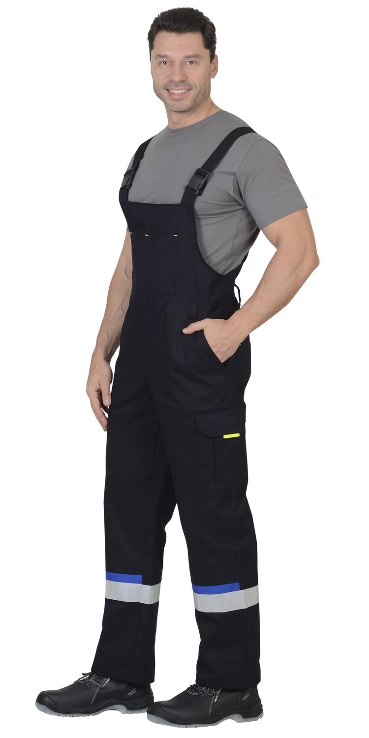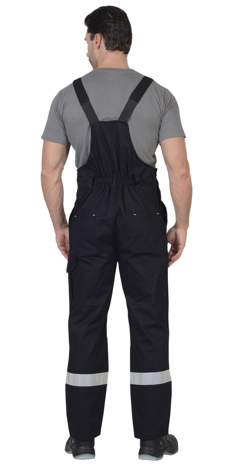 Полукомбинезон с застёжкой гульфика и застёжкой в правом боковом шве на пуговицы, верхним накладным карманом и нижними внутренними боковыми карманами, с наколенниками, с накладным карманом на левом боковом шве с клапаном на липучке, с патой, с двумя задними и карманами для инструментов, по спинке вставлена резинка.