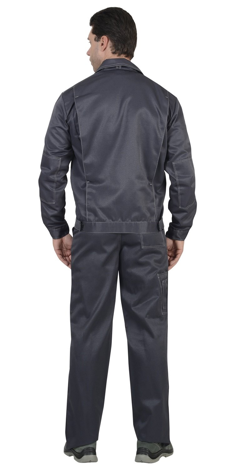 Куртка укороченная с центральной потайной застежкой на молнию, застежкой борта и пояса на липучку. Верхние карманы с клапанами и хлястиком, застегивающимися на липучку. Боковые карманы в вертикальных швах. Пояс регулируется хлястиком на липучке. Воротник отложной. Вертикальные складки спинки увеличивают свободу движения. Контрастная отстрочка швов придает костюму оригинальность.