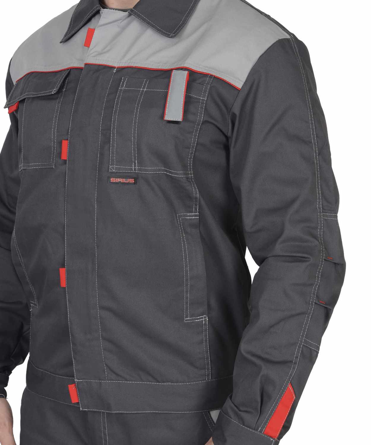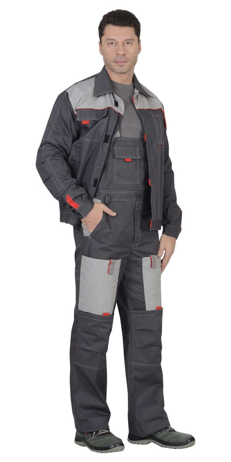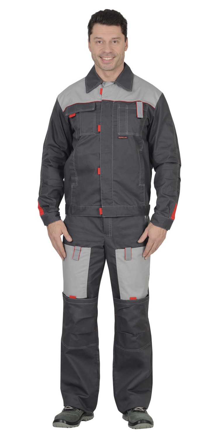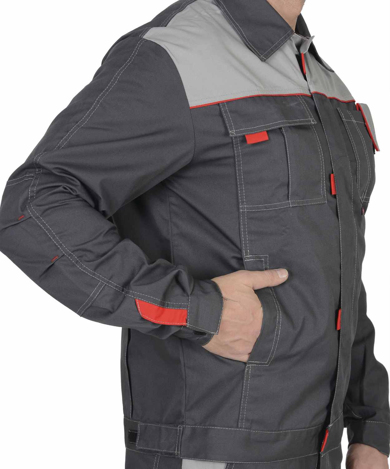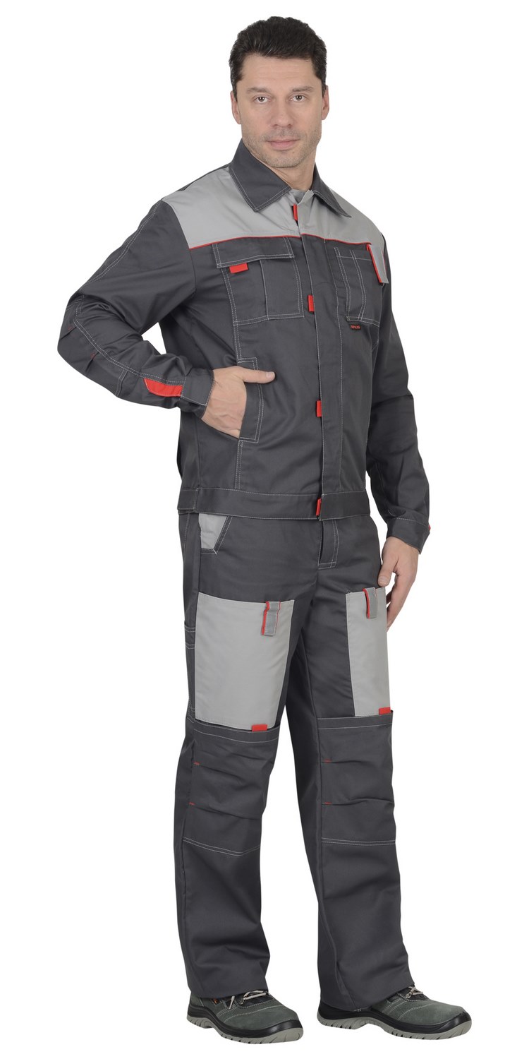 Куртка укороченная с центральной потайной застежкой на молнию, застежкой борта и пояса на липучку. Верхние карманы с клапанами и хлястиком, застегивающимися на липучку. Боковые карманы в вертикальных швах. Пояс регулируется хлястиком на липучке. Воротник отложной. Вертикальные складки спинки увеличивают свободу движения. Контрастная отстрочка швов придает костюму оригинальность.