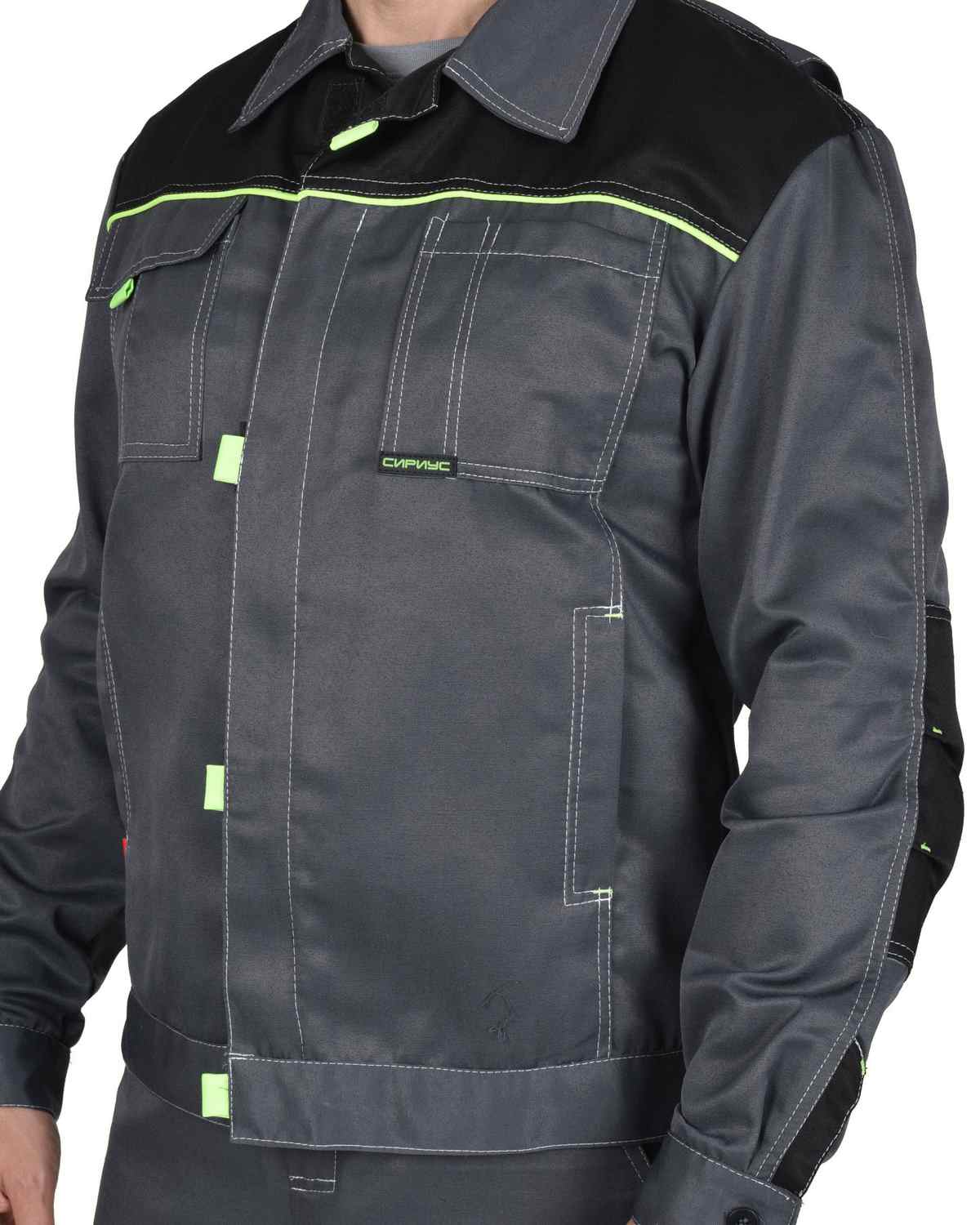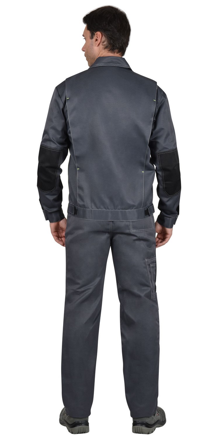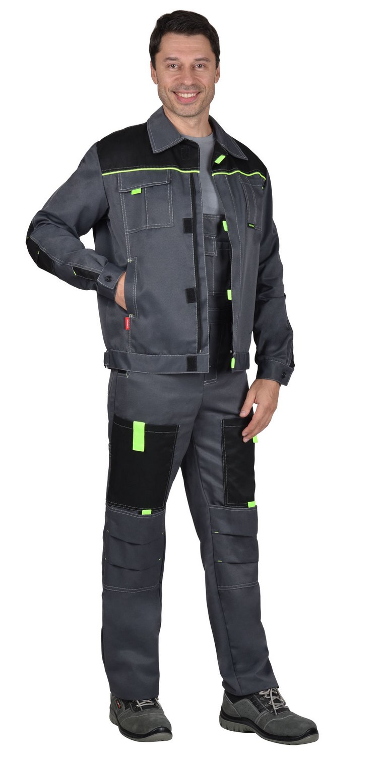 Куртка укороченная с центральной потайной застежкой на молнию, застежкой борта и пояса на липучку. Верхние карманы с клапанами и хлястиком, застегивающимися на липучку. Боковые карманы в вертикальных швах. Пояс регулируется хлястиком на липучке. Воротник отложной. Вертикальные складки спинки увеличивают свободу движения. Контрастная отстрочка швов придает костюму оригинальность.