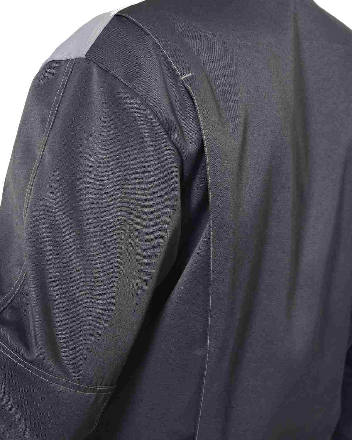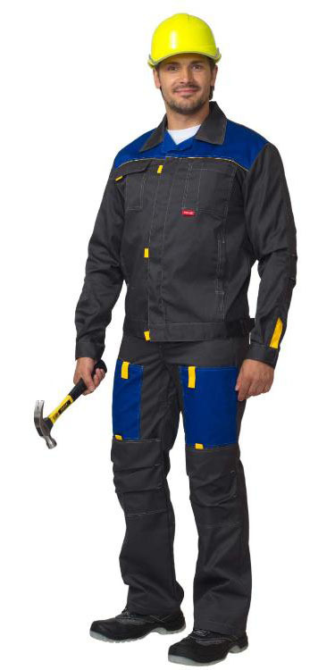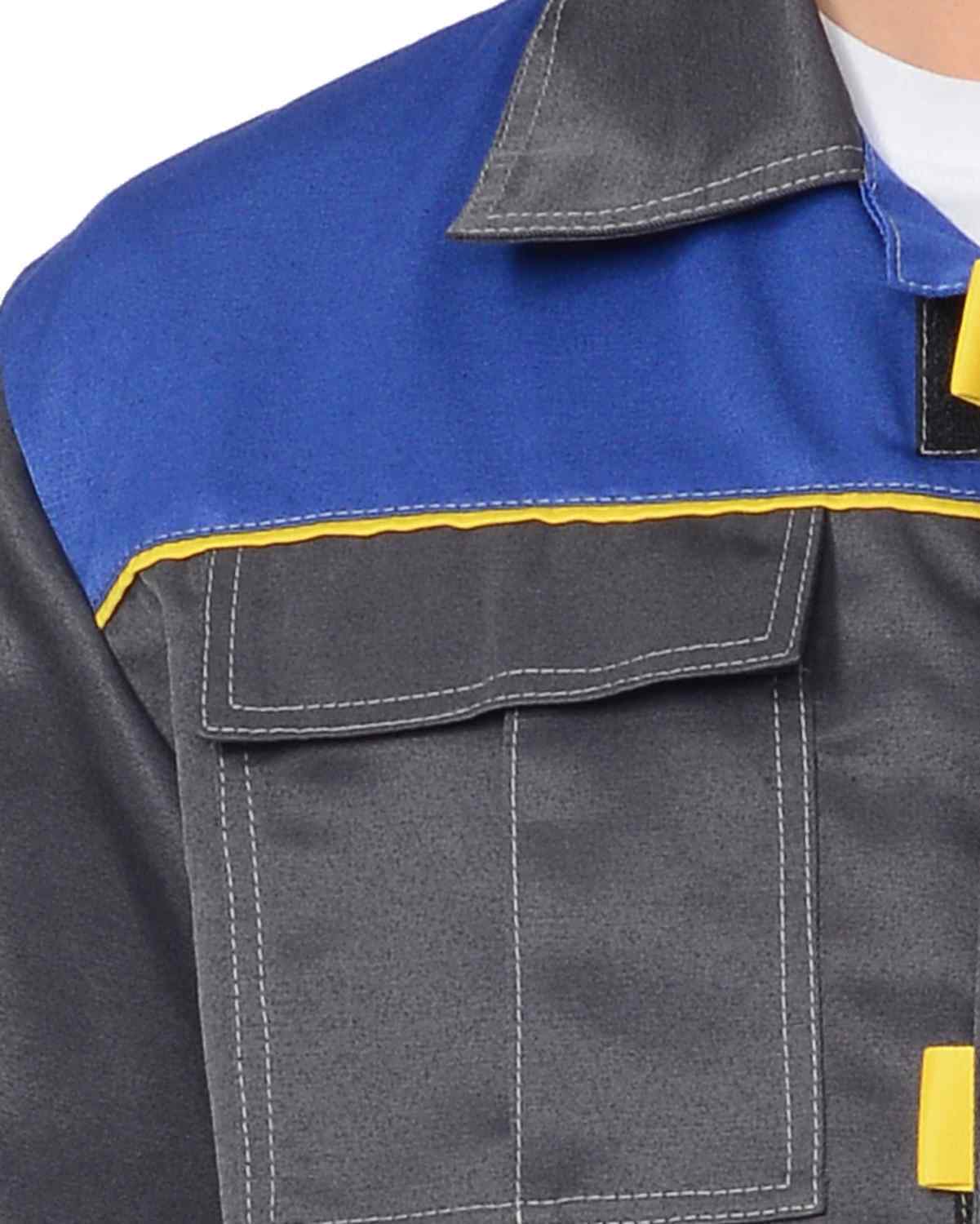 Куртка укороченная с центральной потайной застежкой на молнию, застежкой борта и пояса на липучку. Верхние карманы с клапанами и хлястиком, застегивающимися на липучку. Боковые карманы в вертикальных швах. Пояс регулируется хлястиком на липучке. Воротник отложной. Вертикальные складки спинки увеличивают свободу движения. Контрастная отстрочка швов придает костюму оригинальность.