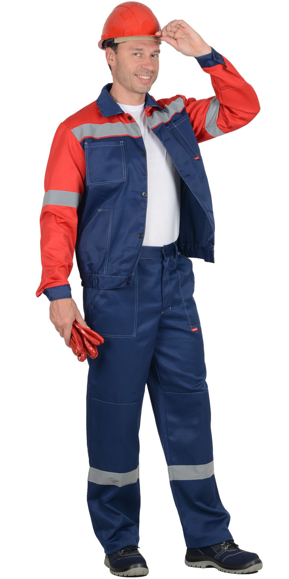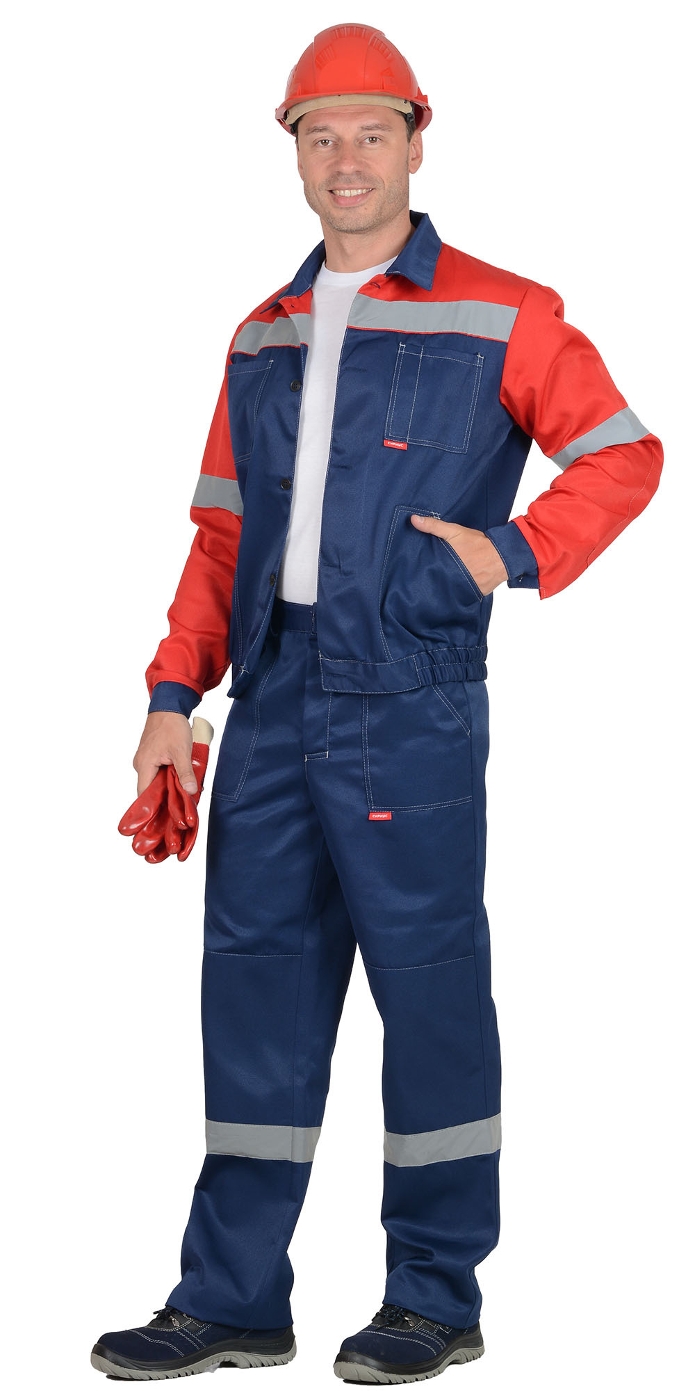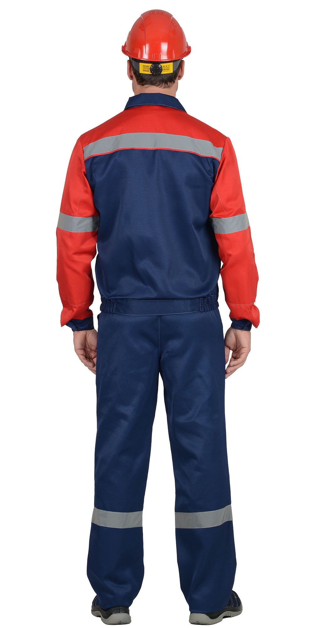 Куртка короткая, с налакотниками, с центральной застежкой на пуговицы, с верхними и нижними накладными карманами, с притачным поясом застегивающийся на пуговицу. Брюки с наколенниками, с застежкой гульфика на пуговицы, с притачным поясом, застегивающимся на пуговицу, с наколенниками. На костюме распологается СОП 50 мм.