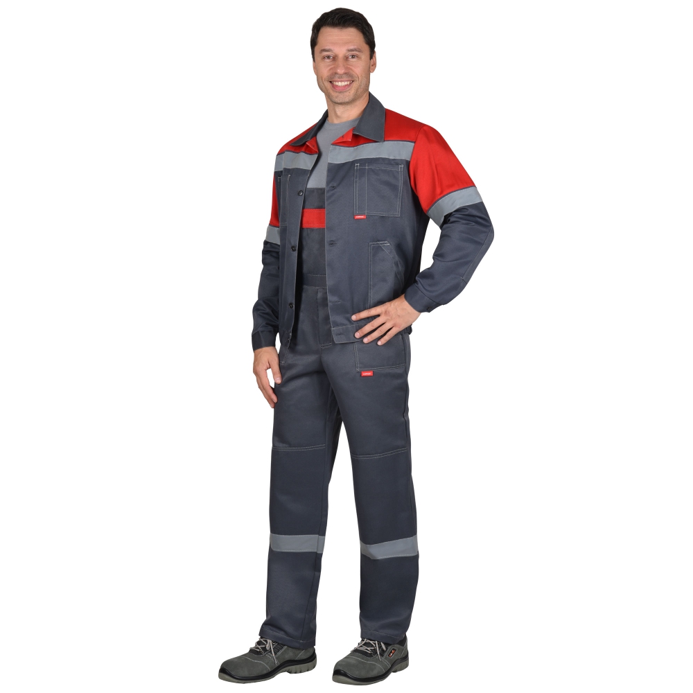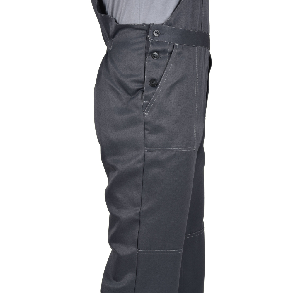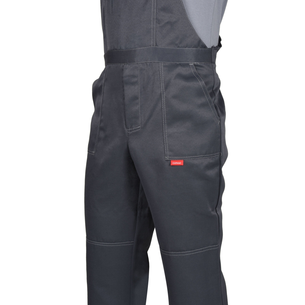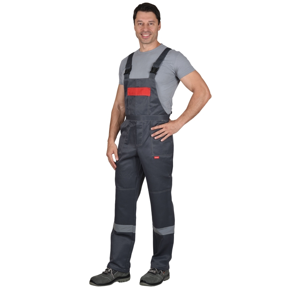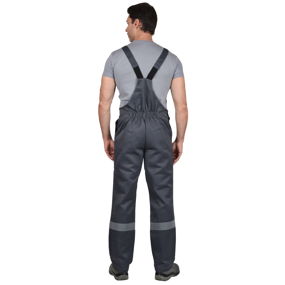 Полукомбинезон с застёжкой гульфика на тесьму «молния», застёжкой в правом боковом шве на 3 петли и пуговицы, отрезной грудкой, верхним и нижними боковыми карманами, с наколенниками, с эластичной лентой по спинке. На нижних частях под наколенниками настрочен лента светоотражающая 50мм.