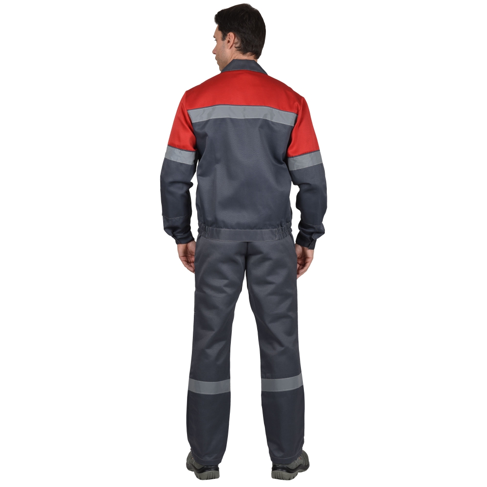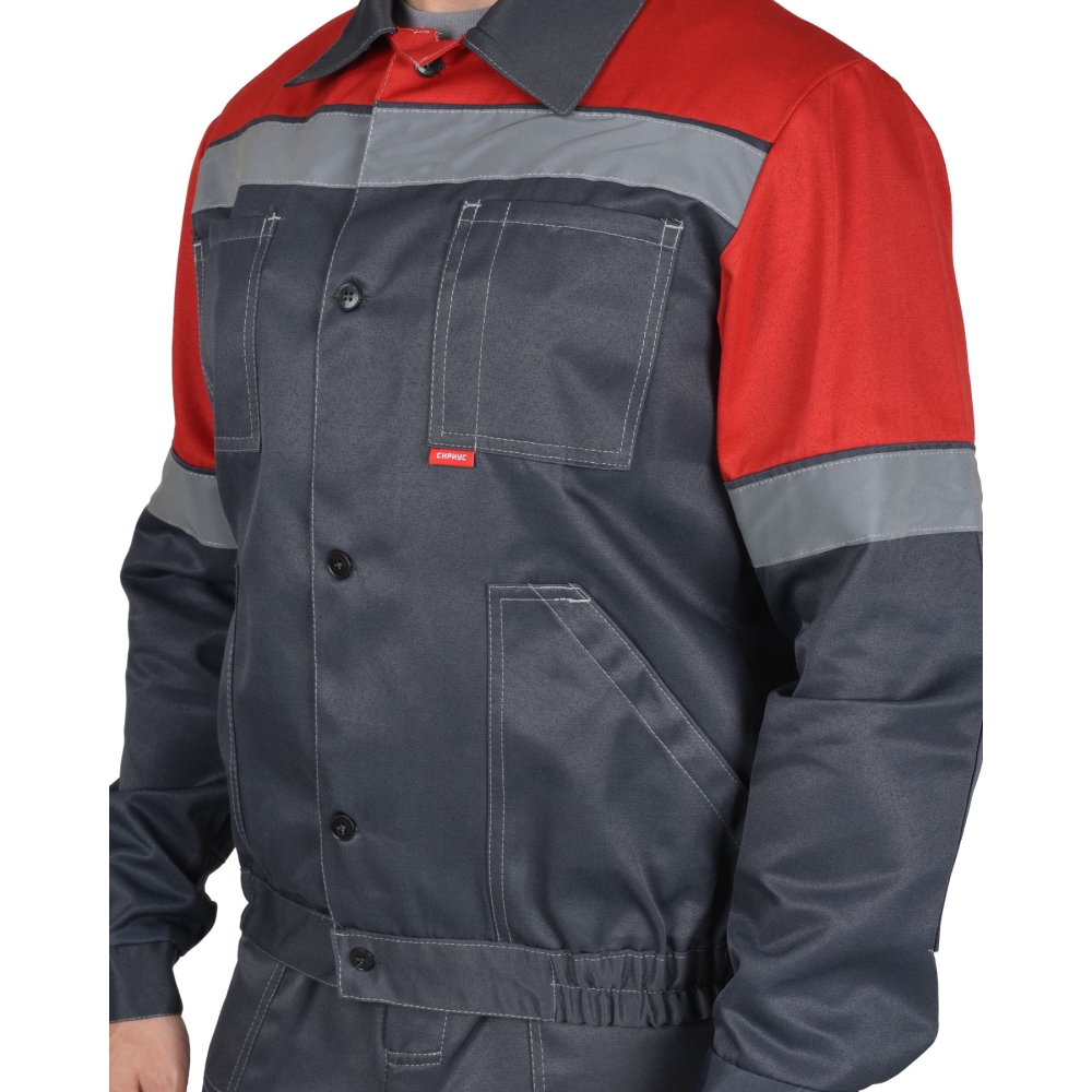Куртка укороченная, прямого силуэта, с отложным воротником, с центральной застёжкой на 5 петель и пуговиц, с притачным поясом с эластичной лентой по боковым швам, накладными верхними и нижними карманами, рукавами с манжетами на пуговицах и с налокотниками. В куртке предусмотрена лента светоотражающая 50мм.