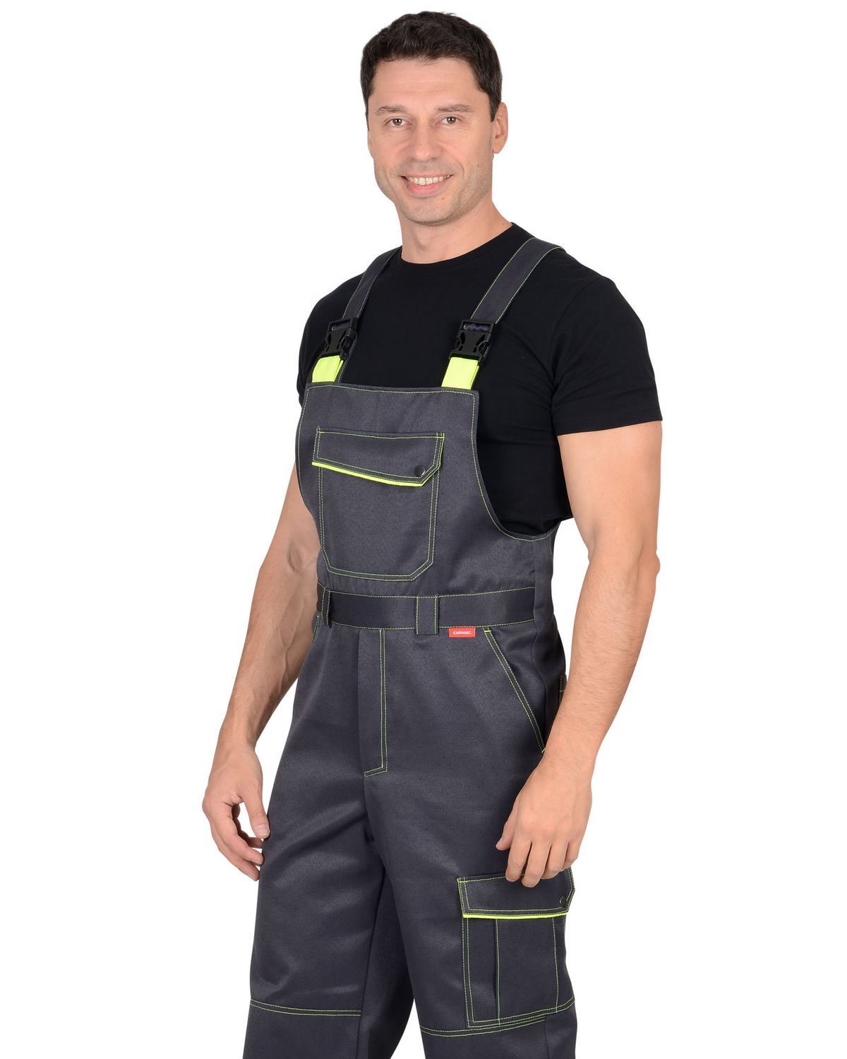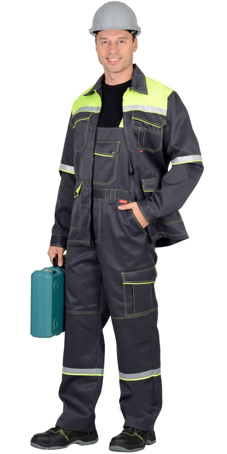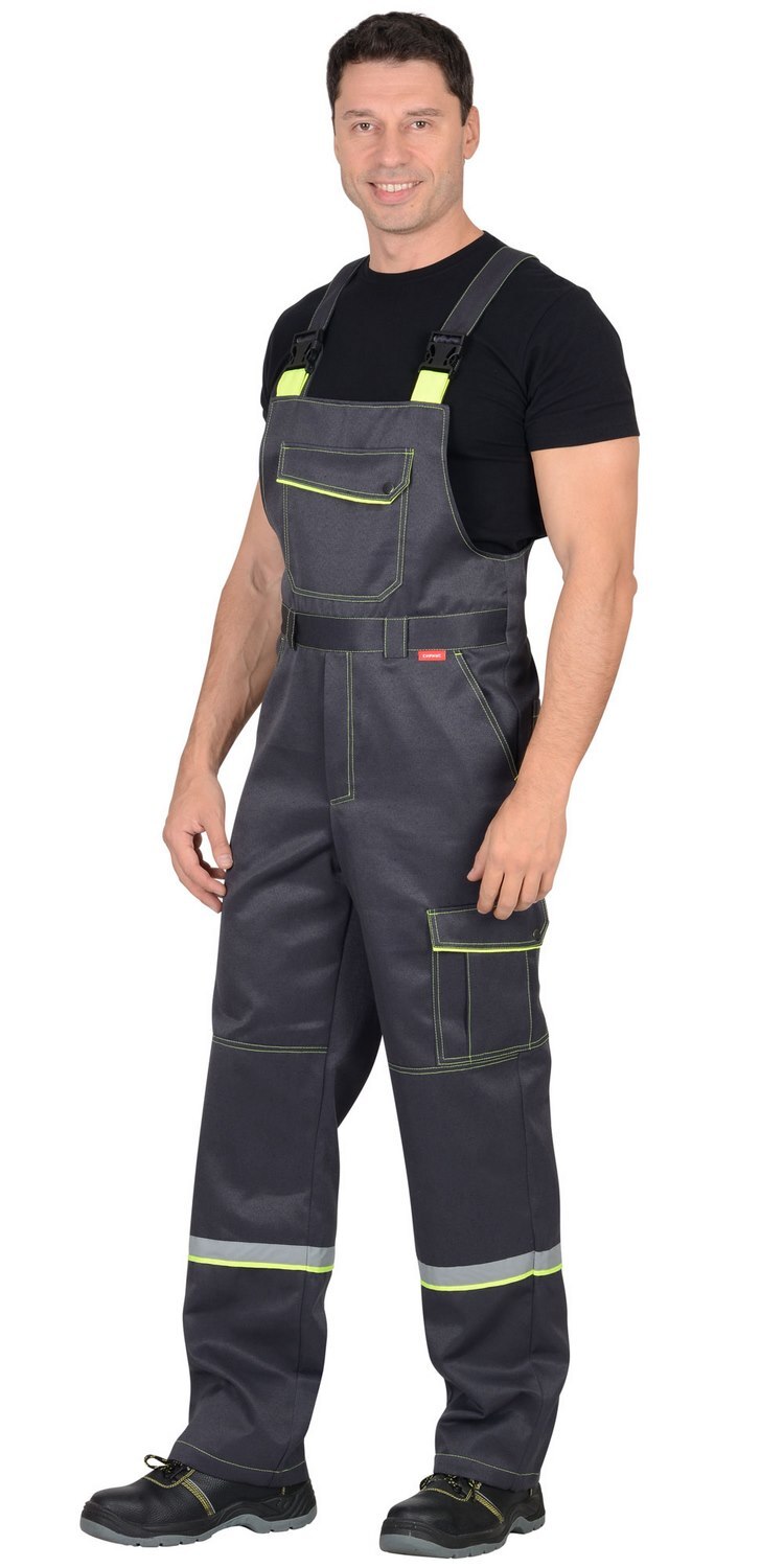 Полукомбинезон с застежкой гульфика на тесьму - "молния", с застежкой в боковом шве на петли и три пуговицы, с накладным фигурным карманом с фигурным клапаном застегивающийся на кнопку на нагруднике, с боковыми карманами с наклонным входом на передних половинках, с накладным карманом со встречной складкой и фигурным клапаном застегивающийся на кнопку на боковом шве, с четырьмя шлевками, с эластичной резинкой в области спинки для лучшего прилегания, с бретелями, с наколенниками. По низу полукомбинезона настрачивается светоотражающая лента СОП - 25 мм. для обозначения сигнальной видимости.