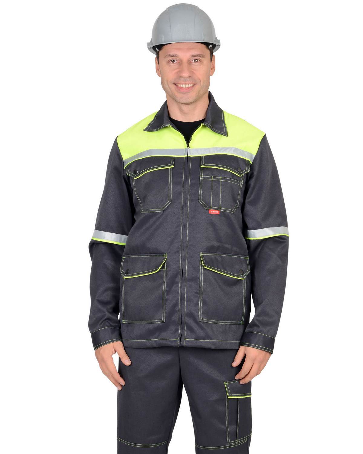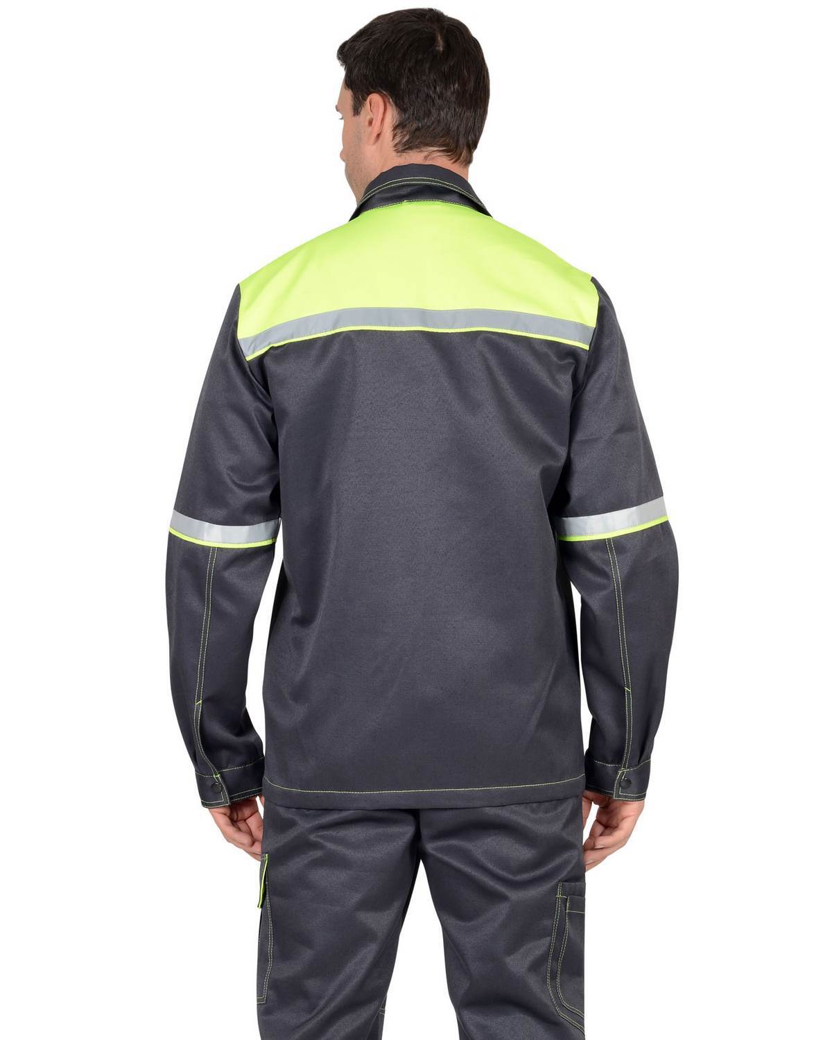 Куртка длинная прямого силуэта, с центральной бортовой скрытой застежкой на тесьму - "молния", с верхними фигурными карманами с фигурными клапанами на кнопках, с нижними полу объёмными накладными карманами, фигурными клапанами на кнопках. Рукава с притачными манжетами, с застежкой на одну кнопку, с отложным воротником. В куртку вшивается светоотражающая лента СОП 25 мм. для обозначения сигнальной видимости.