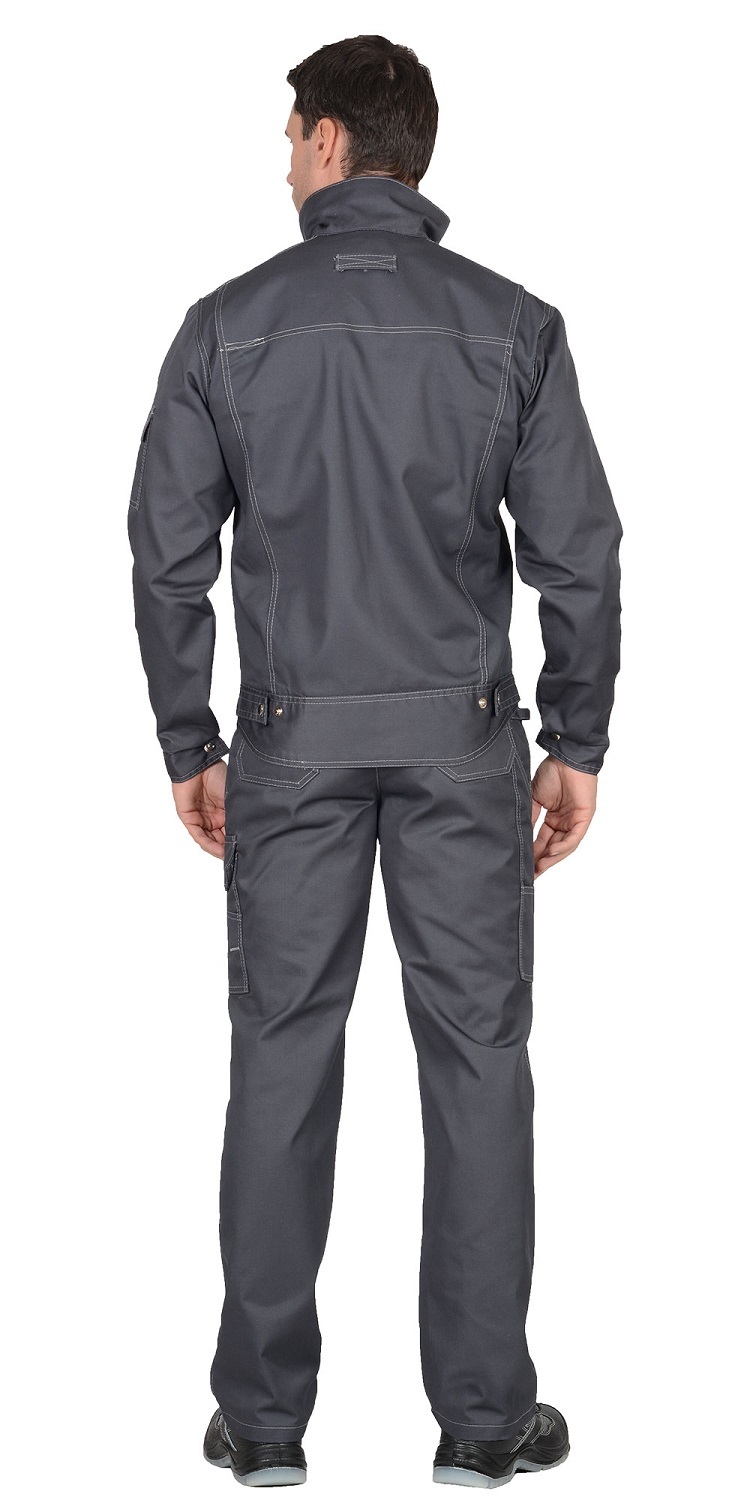 Куртка укороченная, с потайной застежкой на "молнии", воротник стойка, различными накладными карманами. Пояс куртки фигурный по спинке, регулируется патами и кнопками, манжеты рукавов на кнопках.