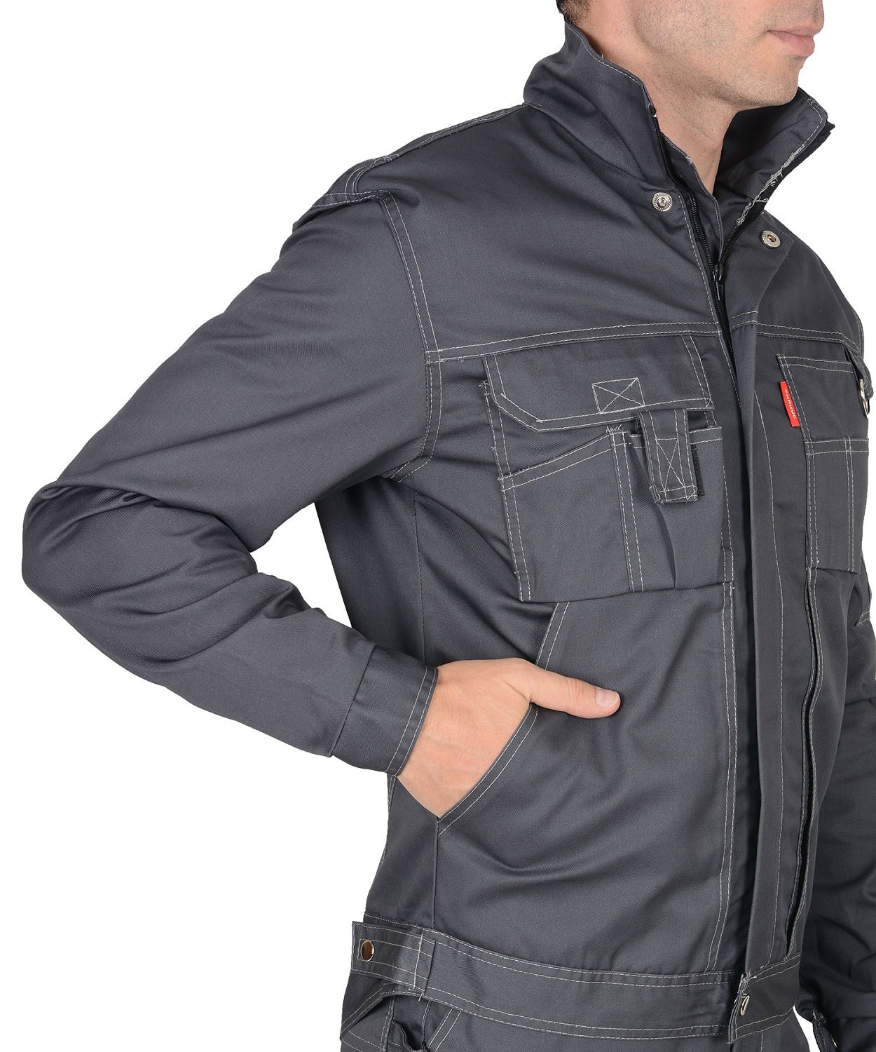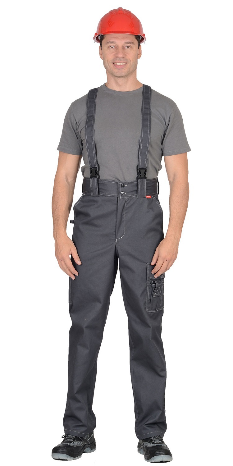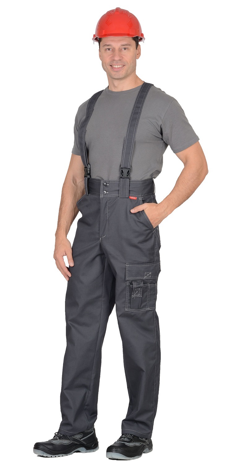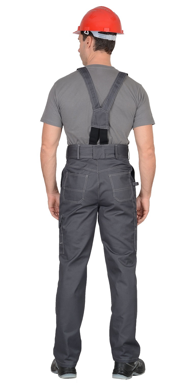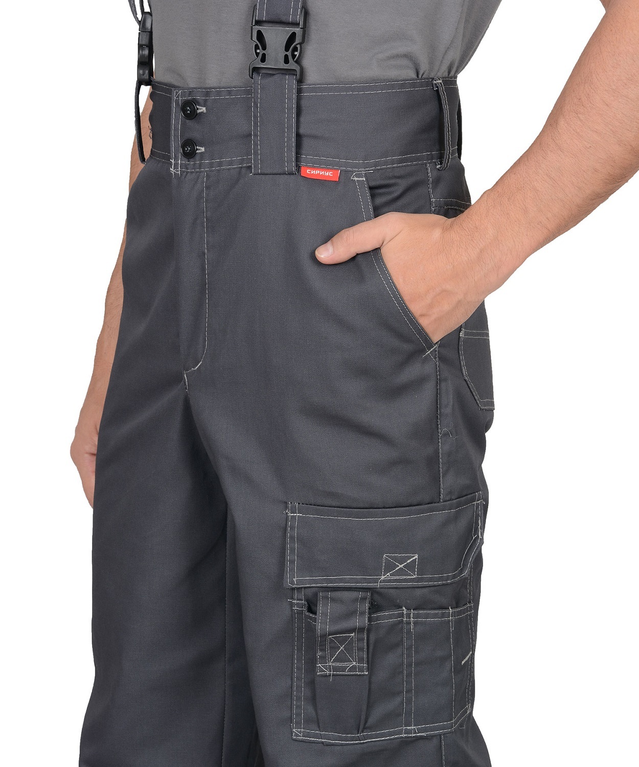 Брюки с пристегивающимися бретелями и гульфиком на "молнии", боковыми внутренними карманами и карманами на боковых швах. Задняя часть брюк с фигурной кокеткой, с накладными карманами с усиленной нижней частью и накладными карманами для инструментов.