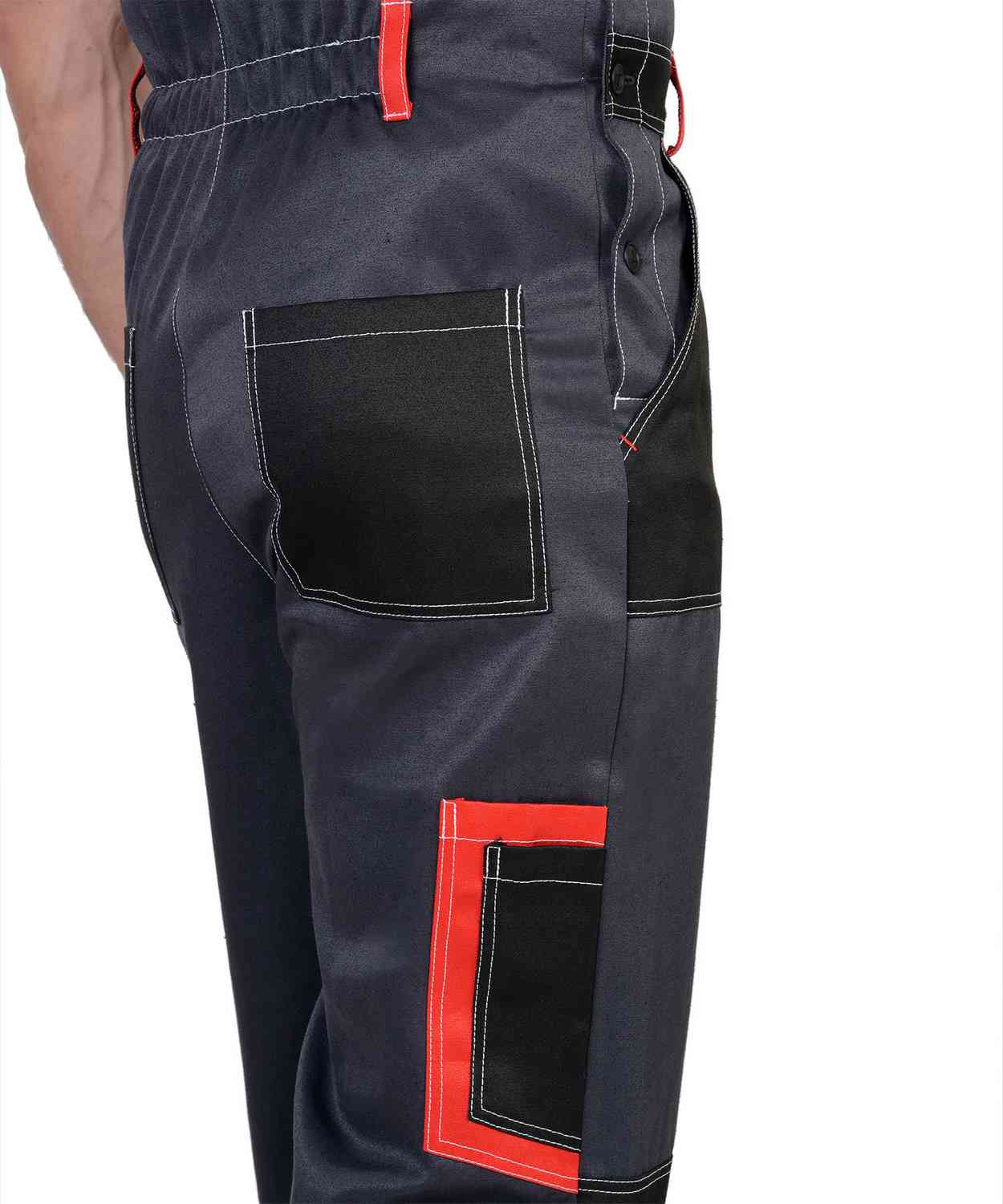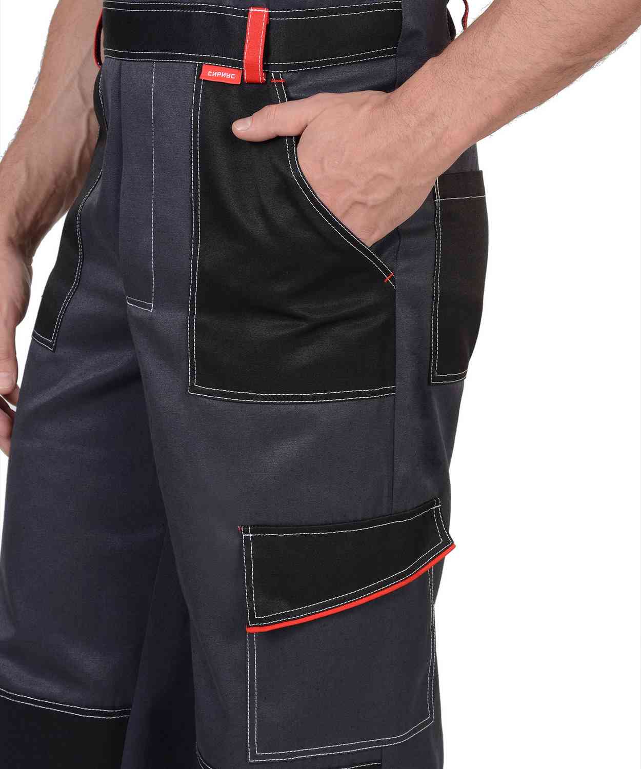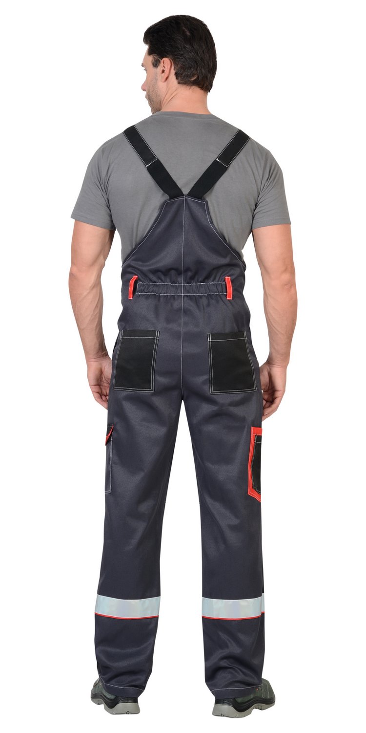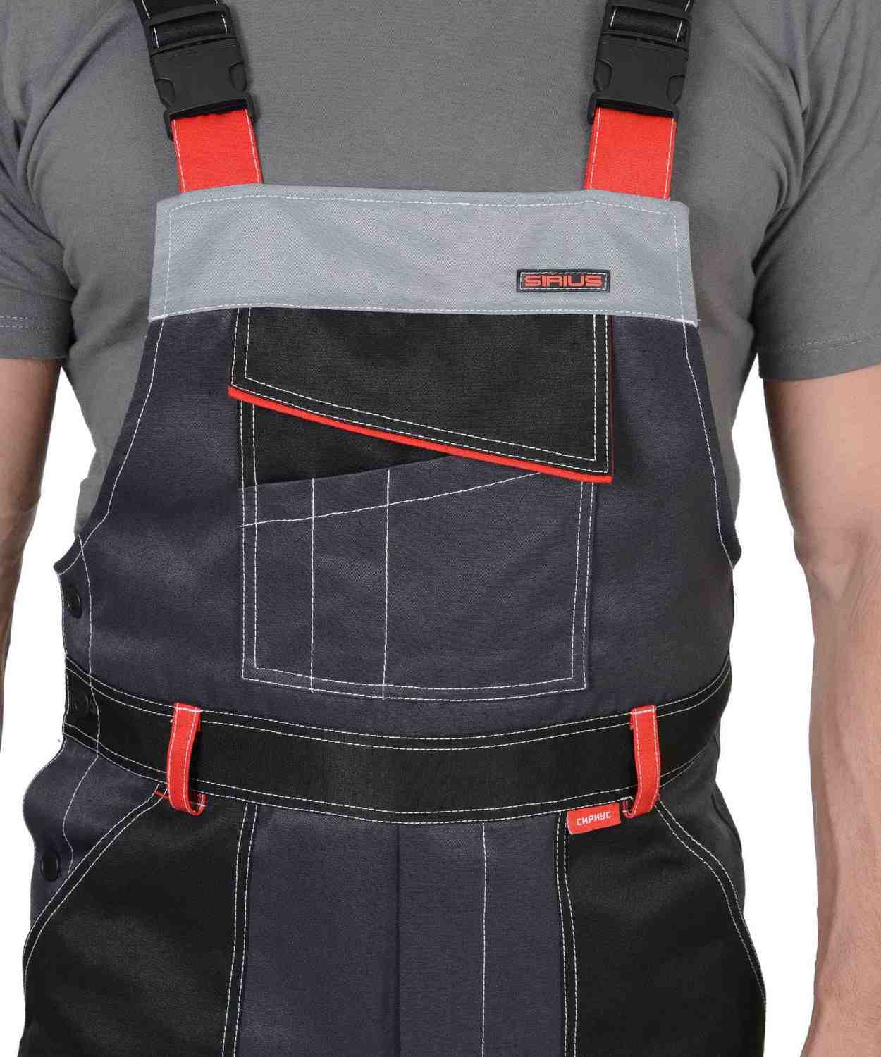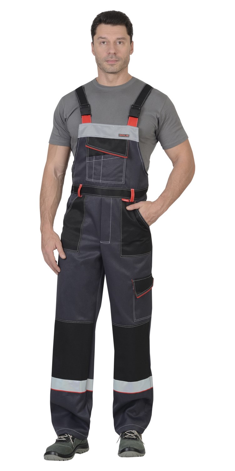 Полукомбинезон прямого силуэта, с карманами на нагруднике , с застежкой гульфика и застежкой в правом боковом шве на пуговицы, с боковыми накладными карманами на передних половинках, с карманом на боковом шве, с наколенниками, с карманами на задних половинках, с карманами для инструментов, с резинкой по спинке для лучшего прилегания.