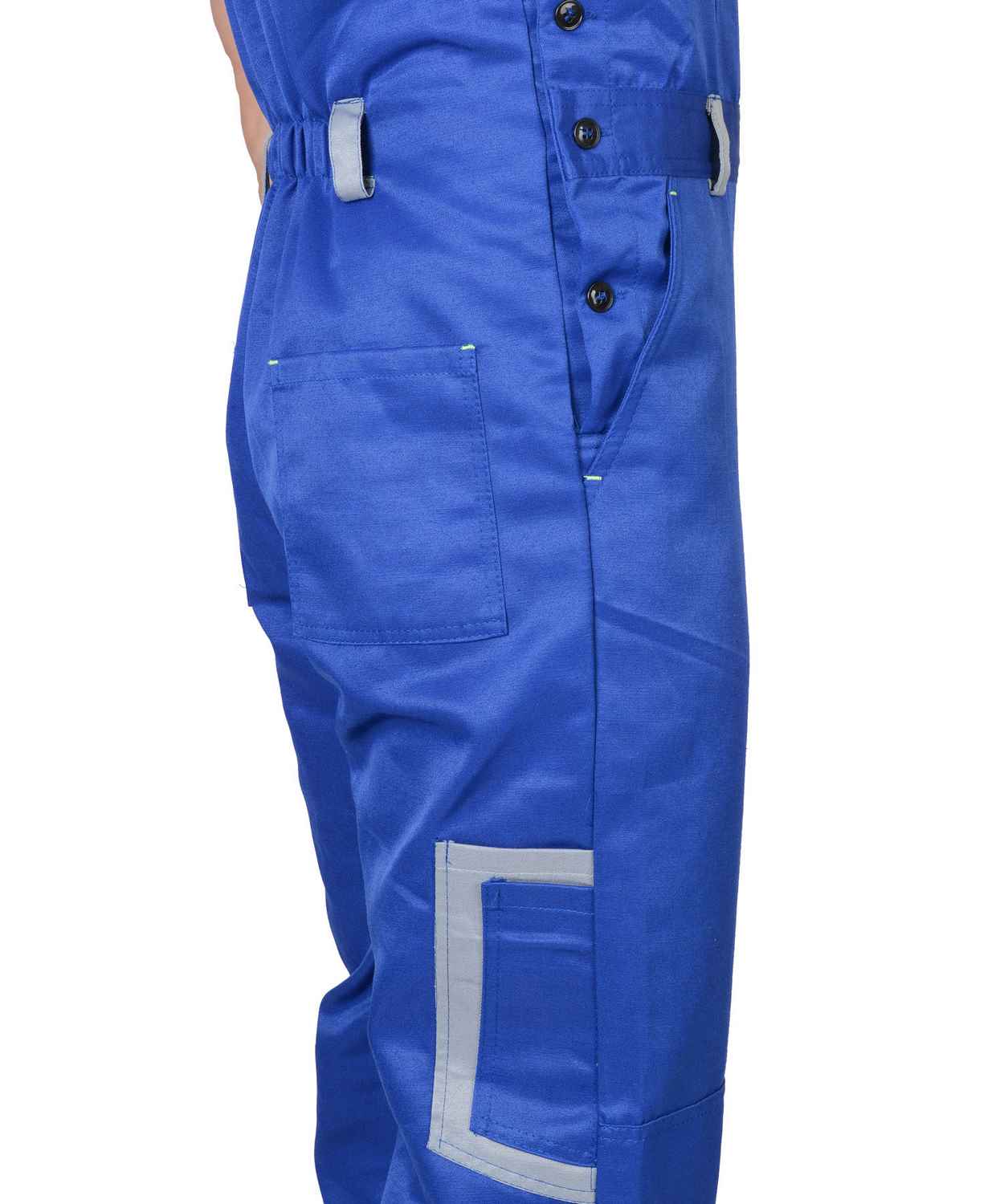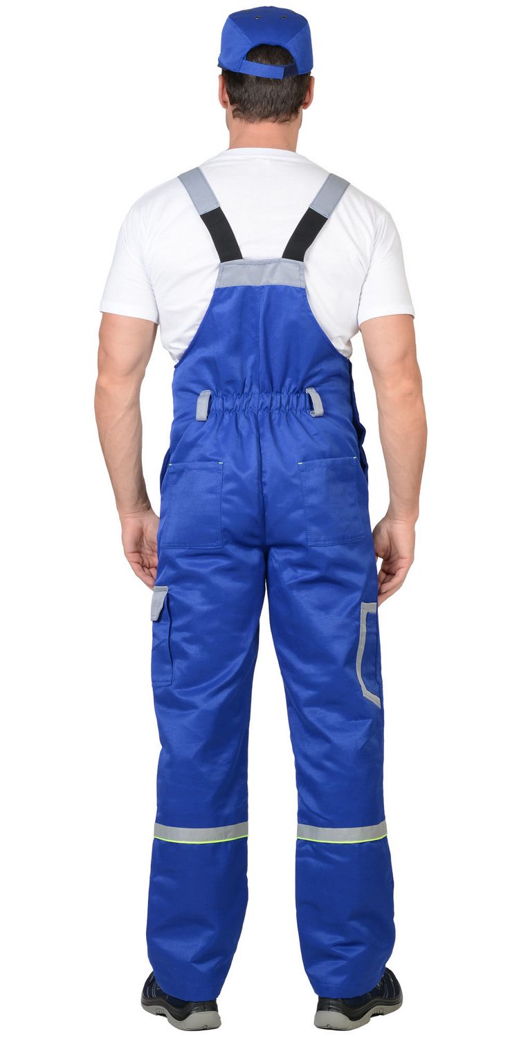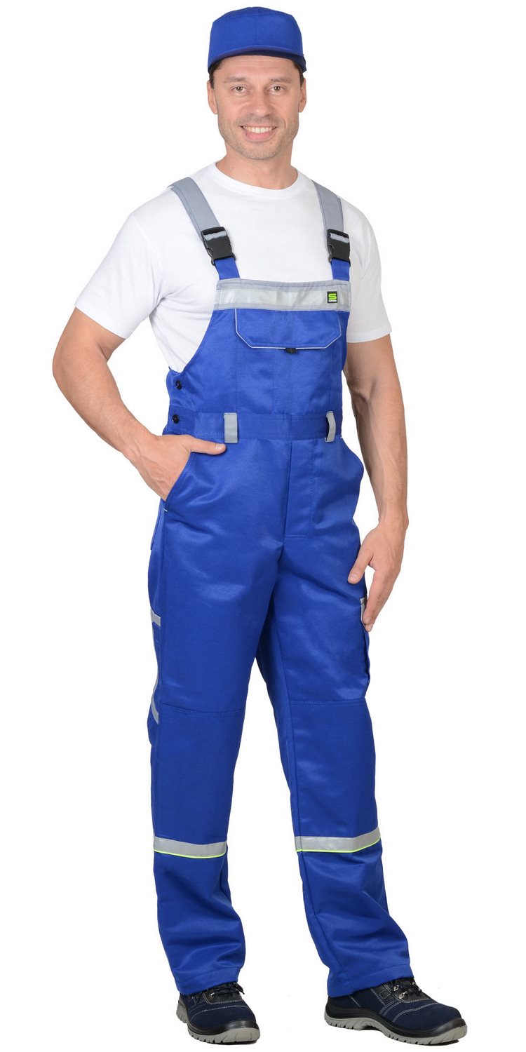 Полукомбинезон с застёжкой гульфика и застёжкой в правом боковом шве на три петли и пуговицы, верхним накладным карманом и нижними внутренними боковыми карманами, с наколенниками, с накладным карманом на левом боковом шве с клапаном на кнопке с патой, с двумя задними и карманами для инструментов, по спинке вставлена резинка.