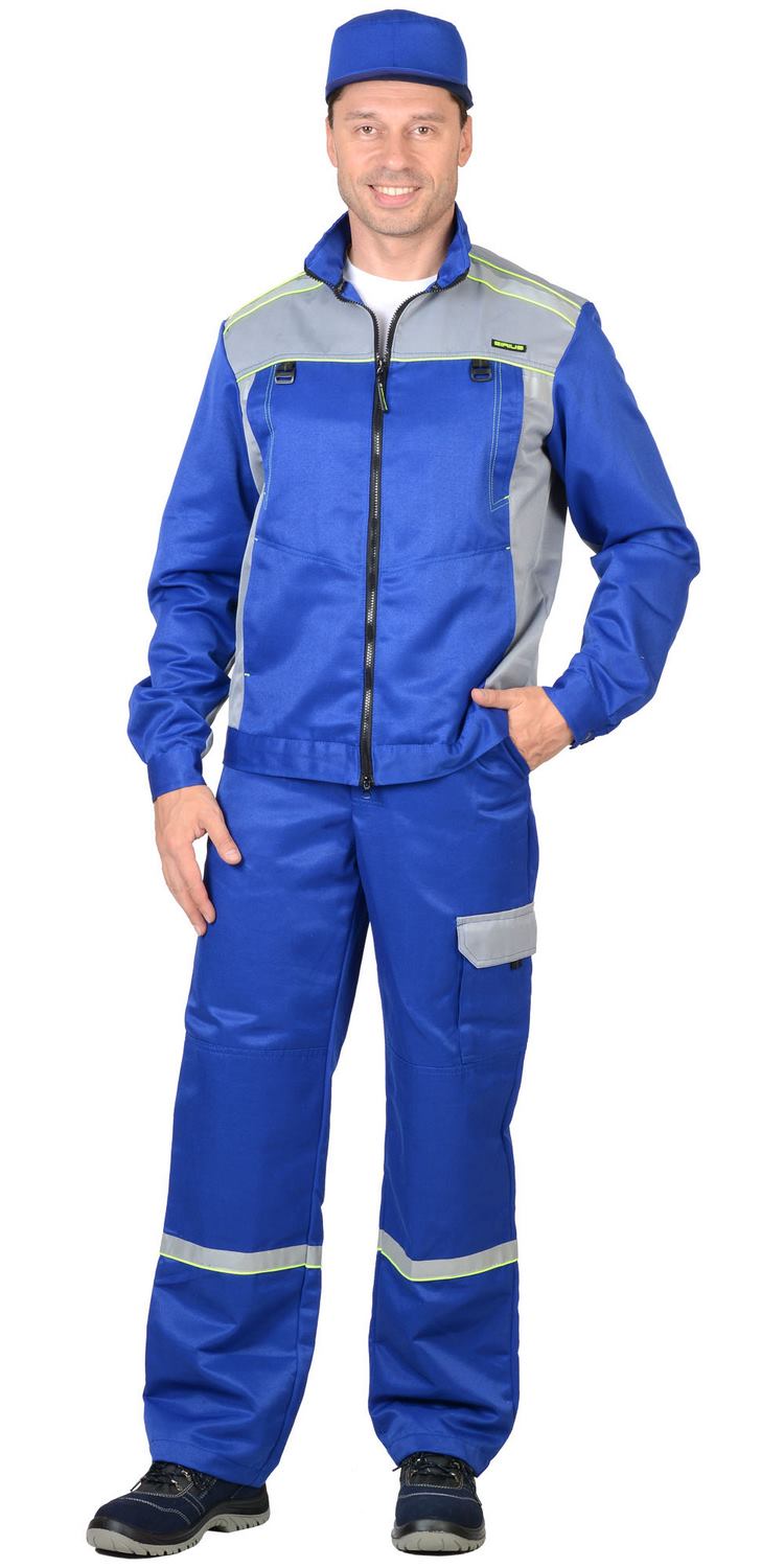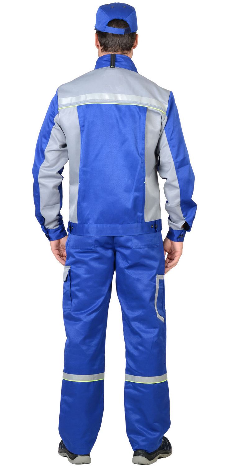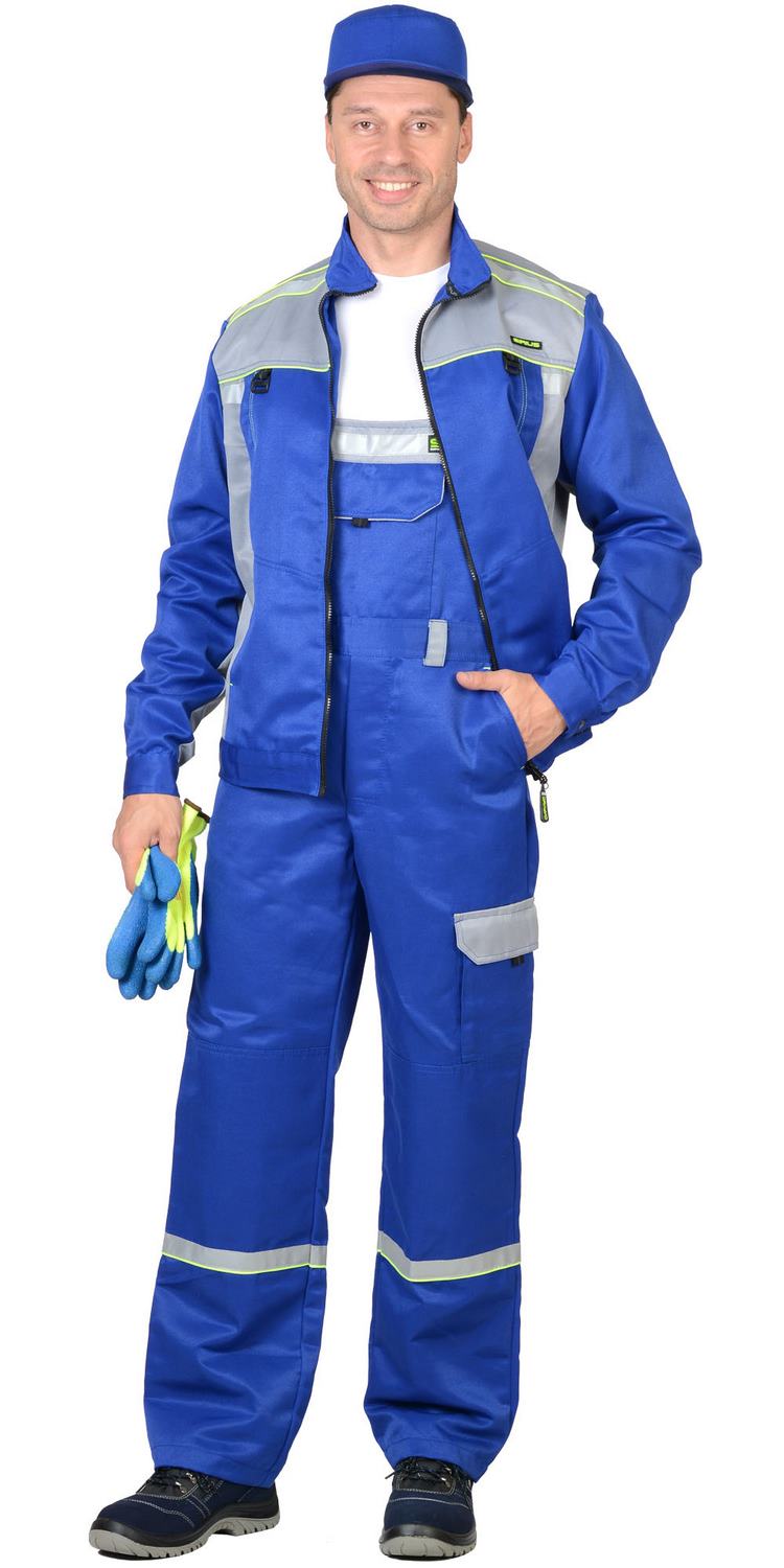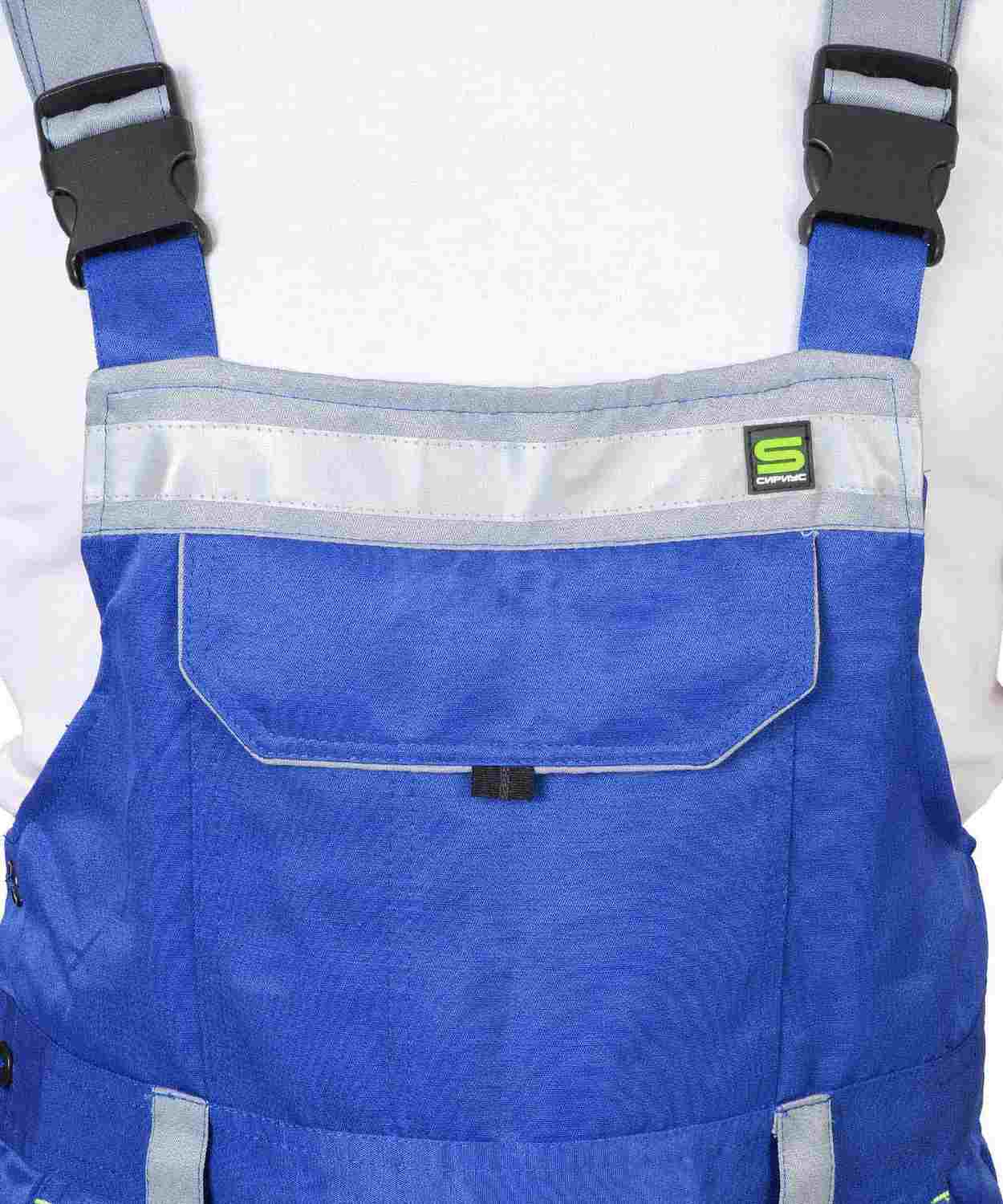 Полукомбинезон с застёжкой гульфика и застёжкой в правом боковом шве на три петли и пуговицы, верхним накладным карманом и нижними внутренними боковыми карманами, с наколенниками, с накладным карманом на левом боковом шве с клапаном на кнопке с патой, с двумя задними и карманами для инструментов, по спинке вставлена резинка.