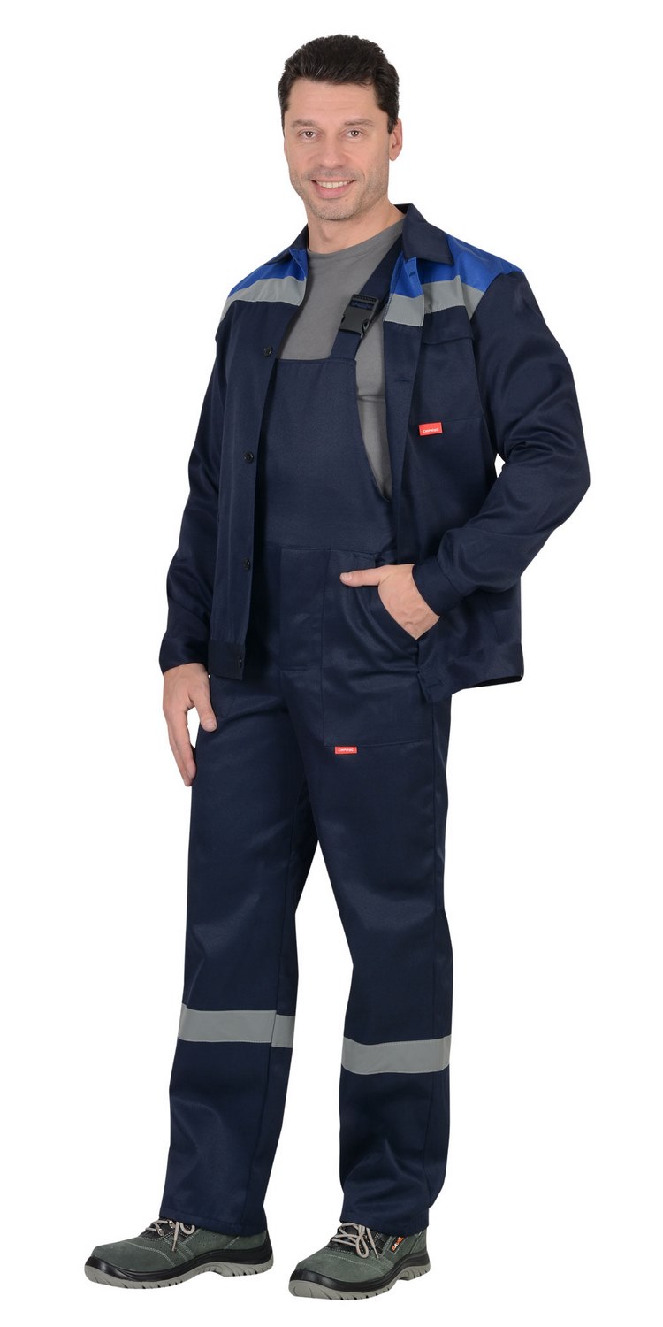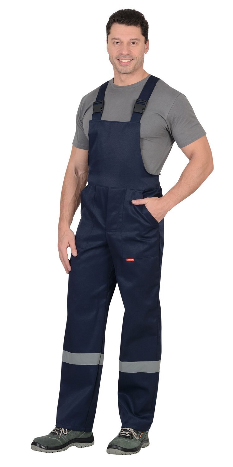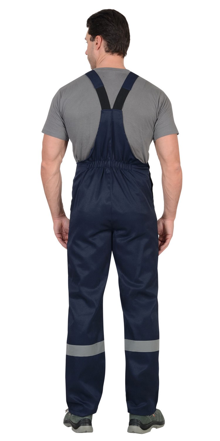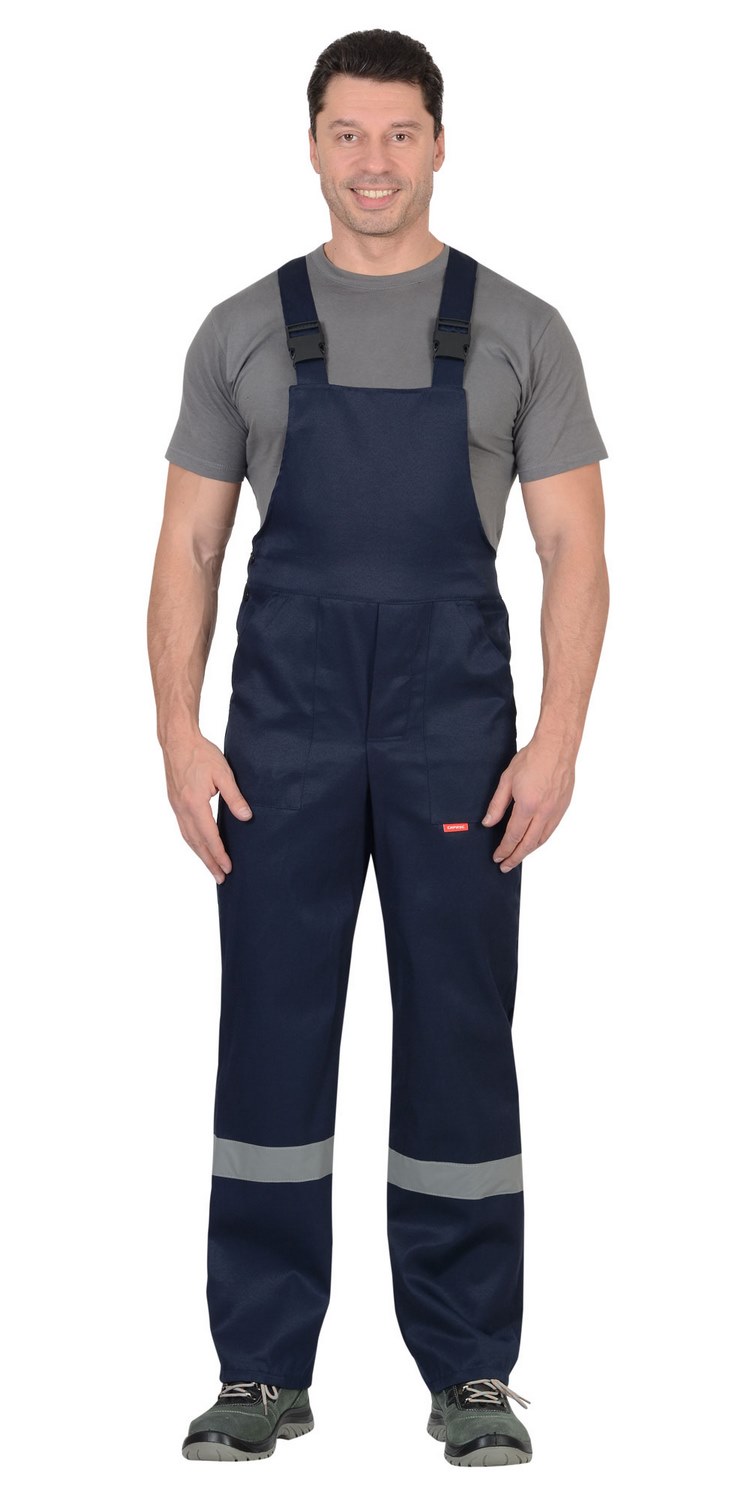 Полукомбинезон прямого покроя, с застежкой гульфика и застежкой в правом боковом шве на пуговицы, с накладными карманами.