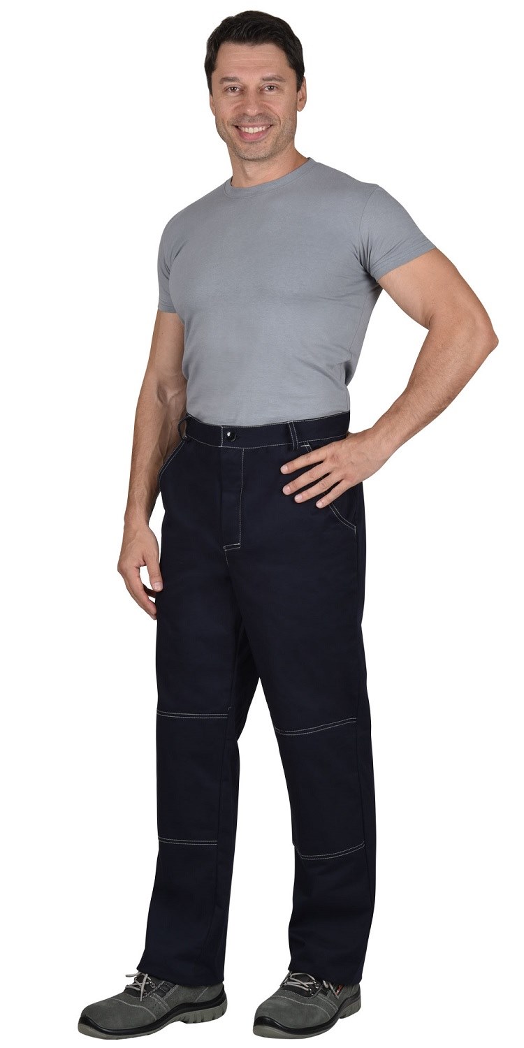 Брюки прямые, на притачном поясе; с внутренними карманами с фигурным входом; с наколенниками.
