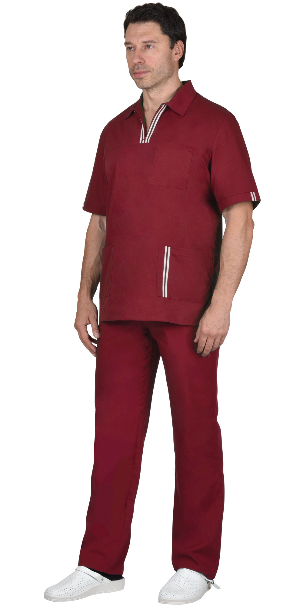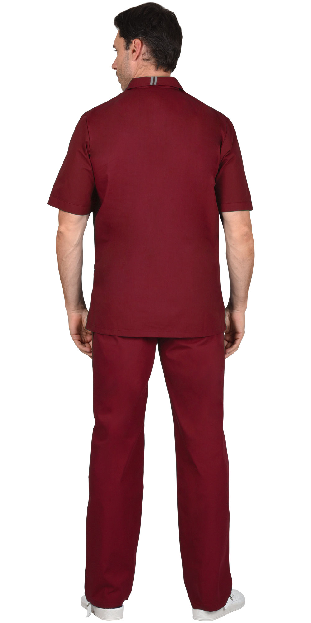 Костюм состоит из куртки и брюк. Куртка прямого силуэта с боковыми разрезами, с застежкой на тесьму - "молния" в области кокетки. Отложенный воротник. Нагрудный левый и два нижних накладных кармана. Рукава втачные, короткие.