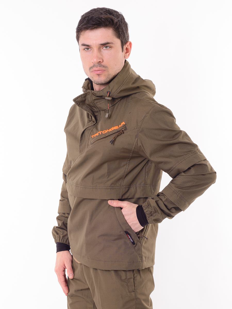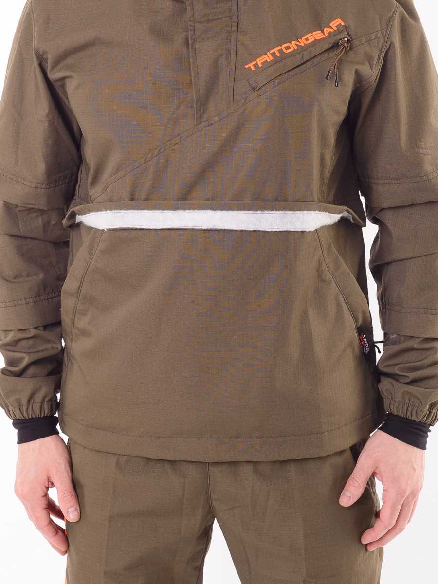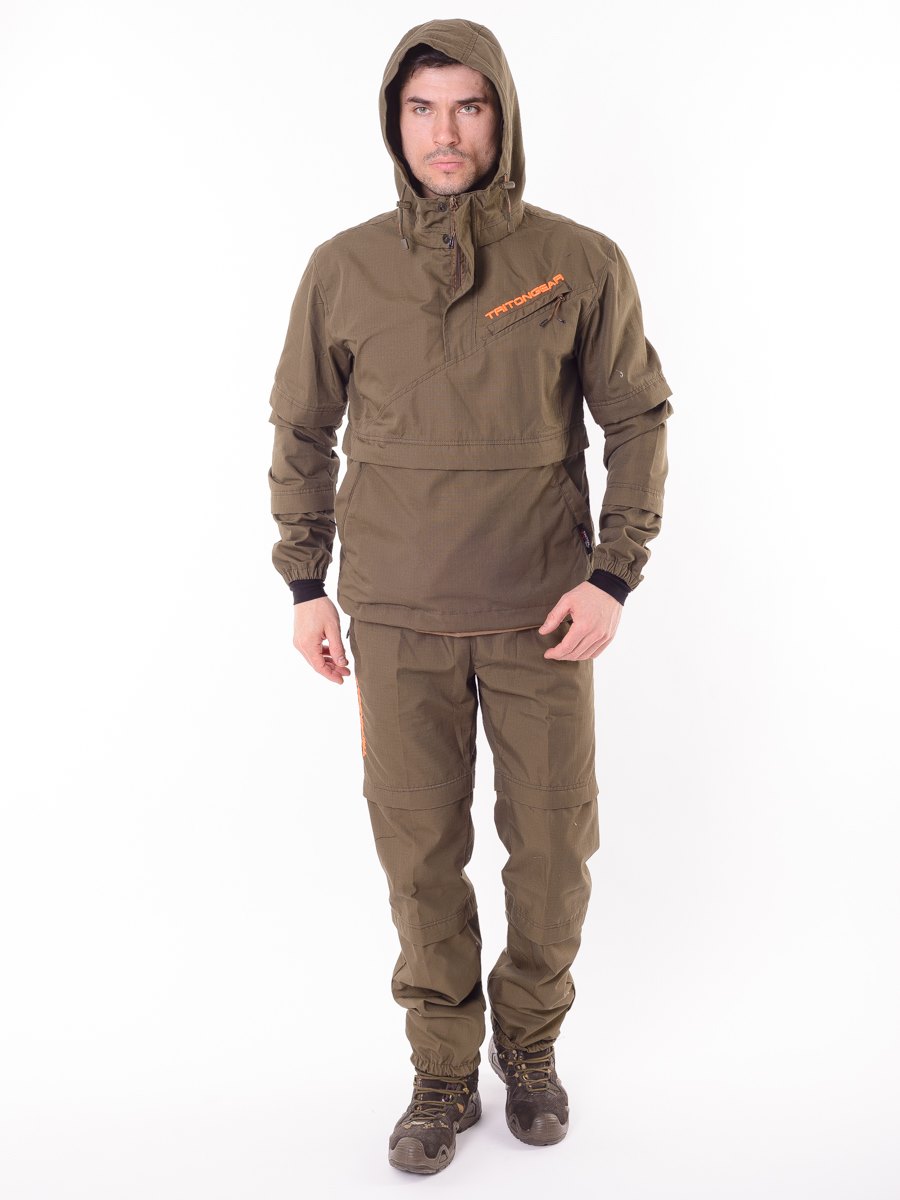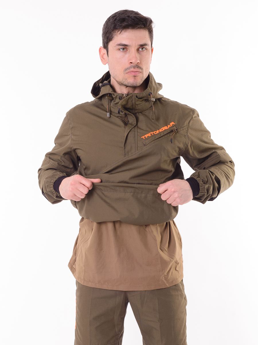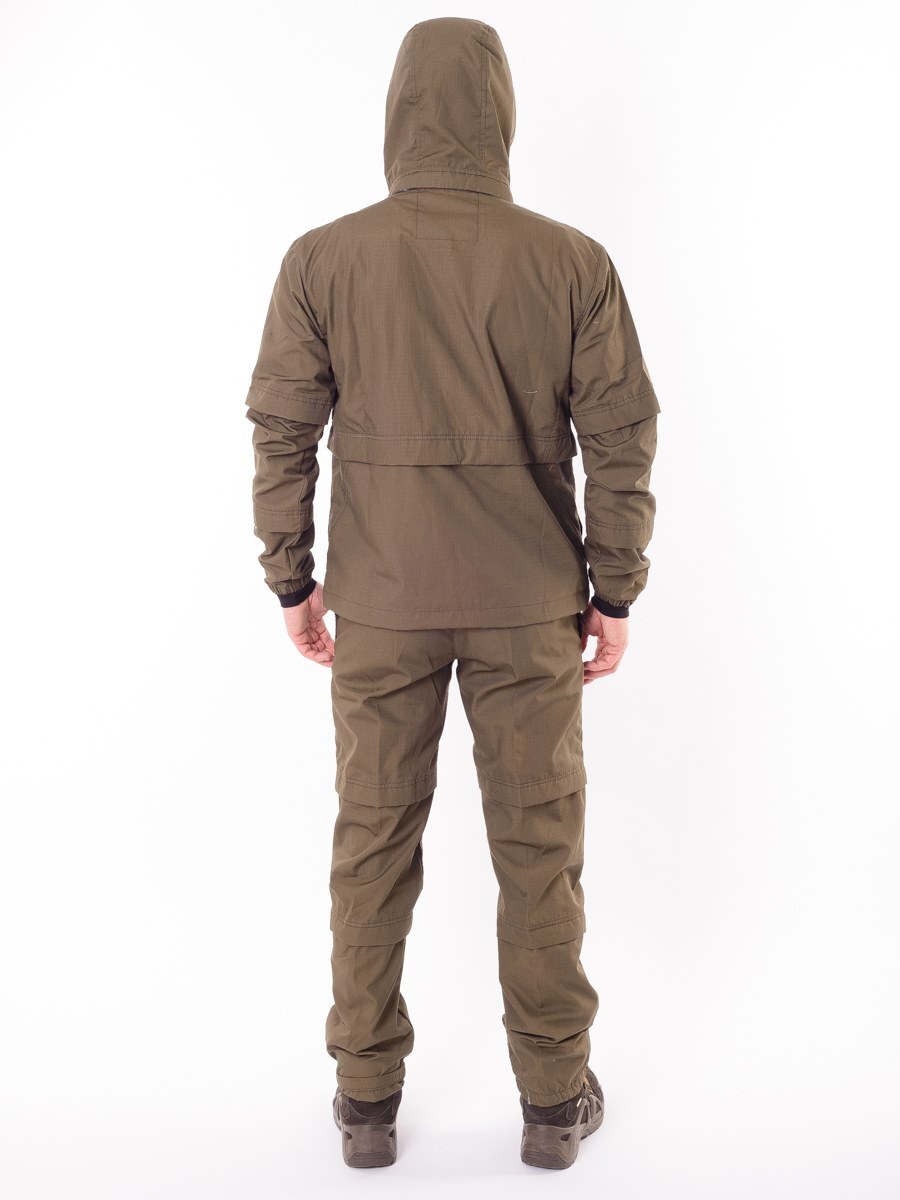 Состоит из куртки-анорак и брюк. Изготовлен из ткани особого плетения РипСтоп с включением армированных нитей и содержанием хлопка, благодаря чему он легкий, комфортный, но при этом очень прочный и надежный в использовании. Цвет коричневый.