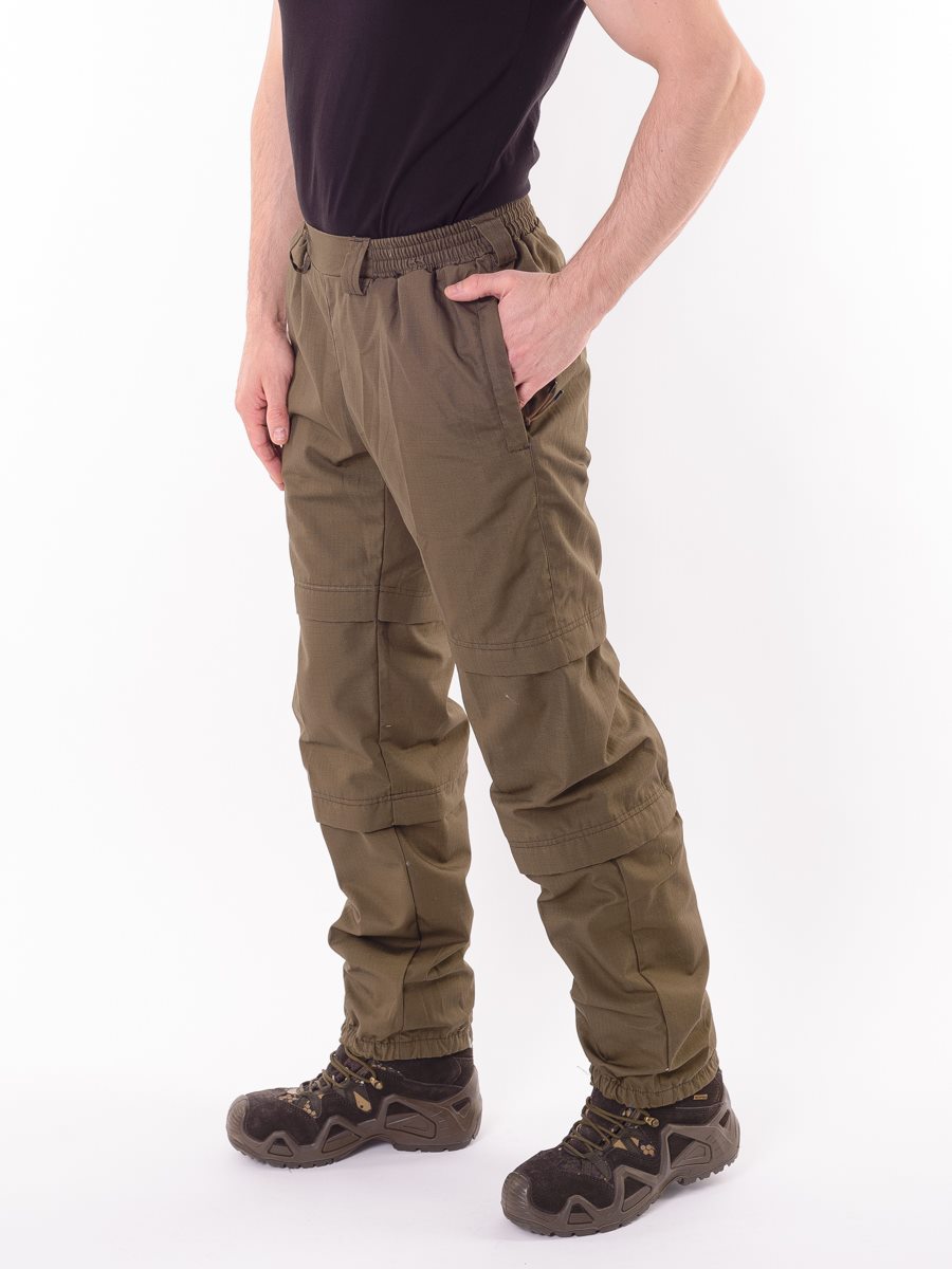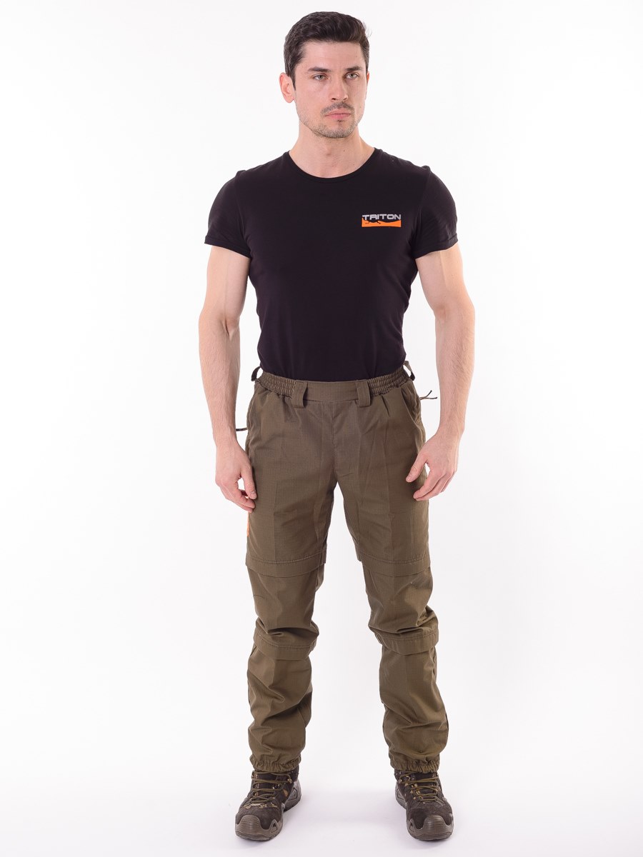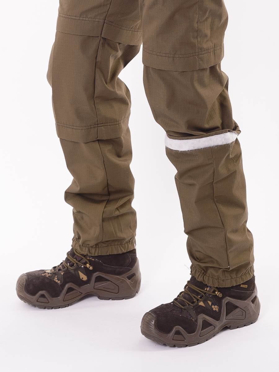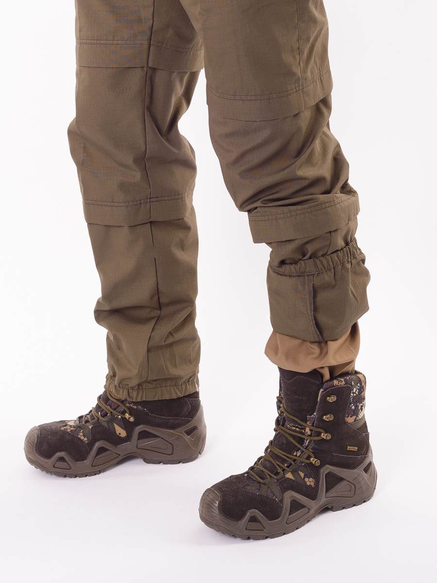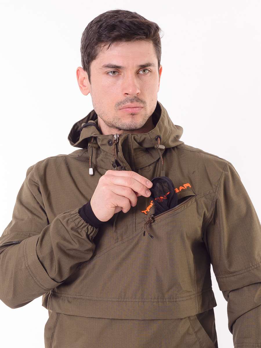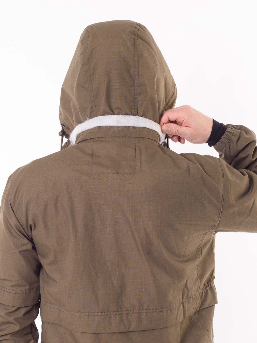 Состоит из куртки-анорак и брюк. Изготовлен из ткани особого плетения РипСтоп с включением армированных нитей и содержанием хлопка, благодаря чему он легкий, комфортный, но при этом очень прочный и надежный в использовании. Цвет коричневый.