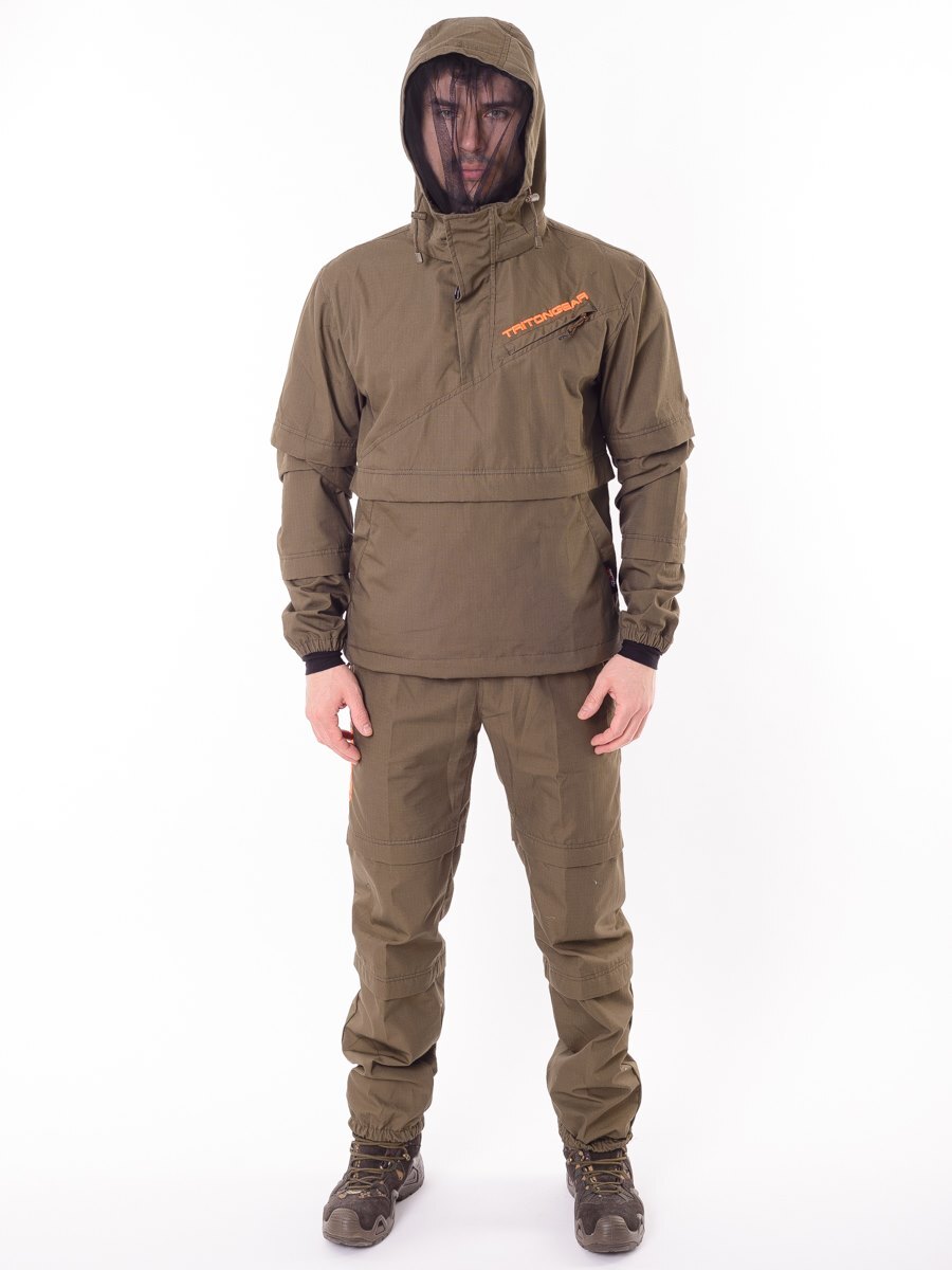 Костюм снабжен регулируемым по объёму капюшоном с фиксаторами и съёмной антимоскитной сеткой с мелкоячеистой структурой, которая прекрасно пропускает свет и не мешает обзору, хорошо защищает от мошек, комаров, гнуса и клещей.