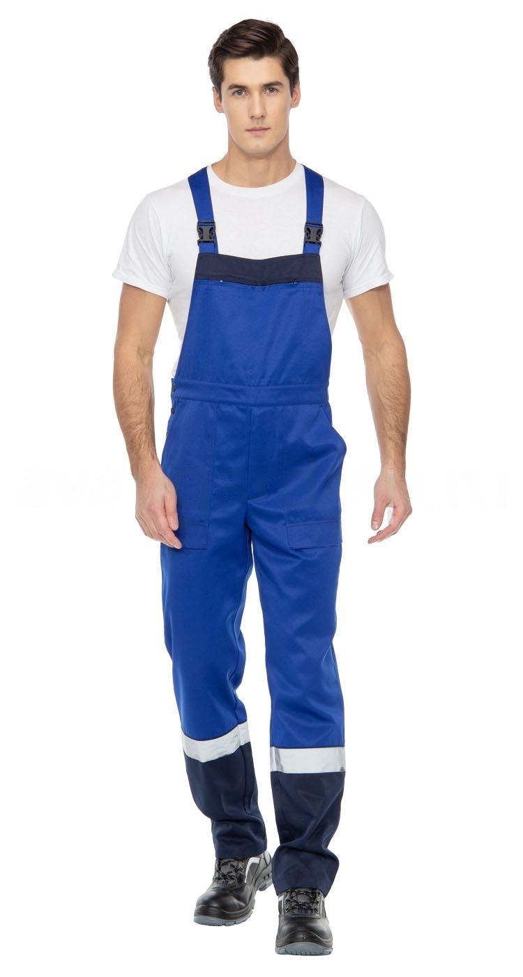 Полукомбинезон с застежкой на пуговицы в правом боковом шве и с гульфиком на молнии. Бретели с регулировкой длины и с застежкой на фастексы. На грудке вместительный карман на молнии. На передних половинках накладные карманы с усилением и скрытым объемом по низу. На спинке кулиса с резинкой для регулировки объема по талии. На задней правой половинке накладной карман со скрытым объемом по низу, карманы для различных мелких инструментов, а также петля из стропы для фиксации крупных инструментов.