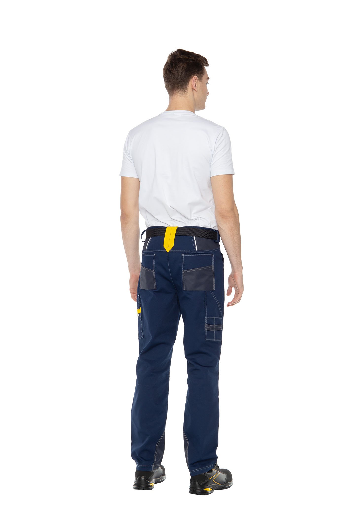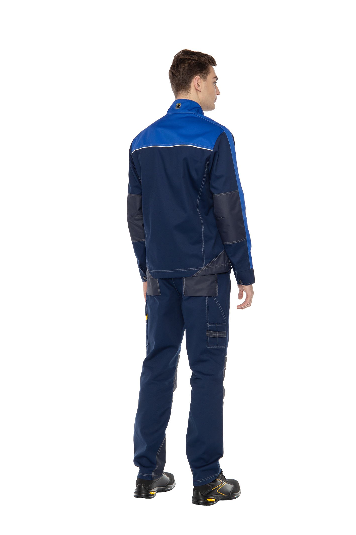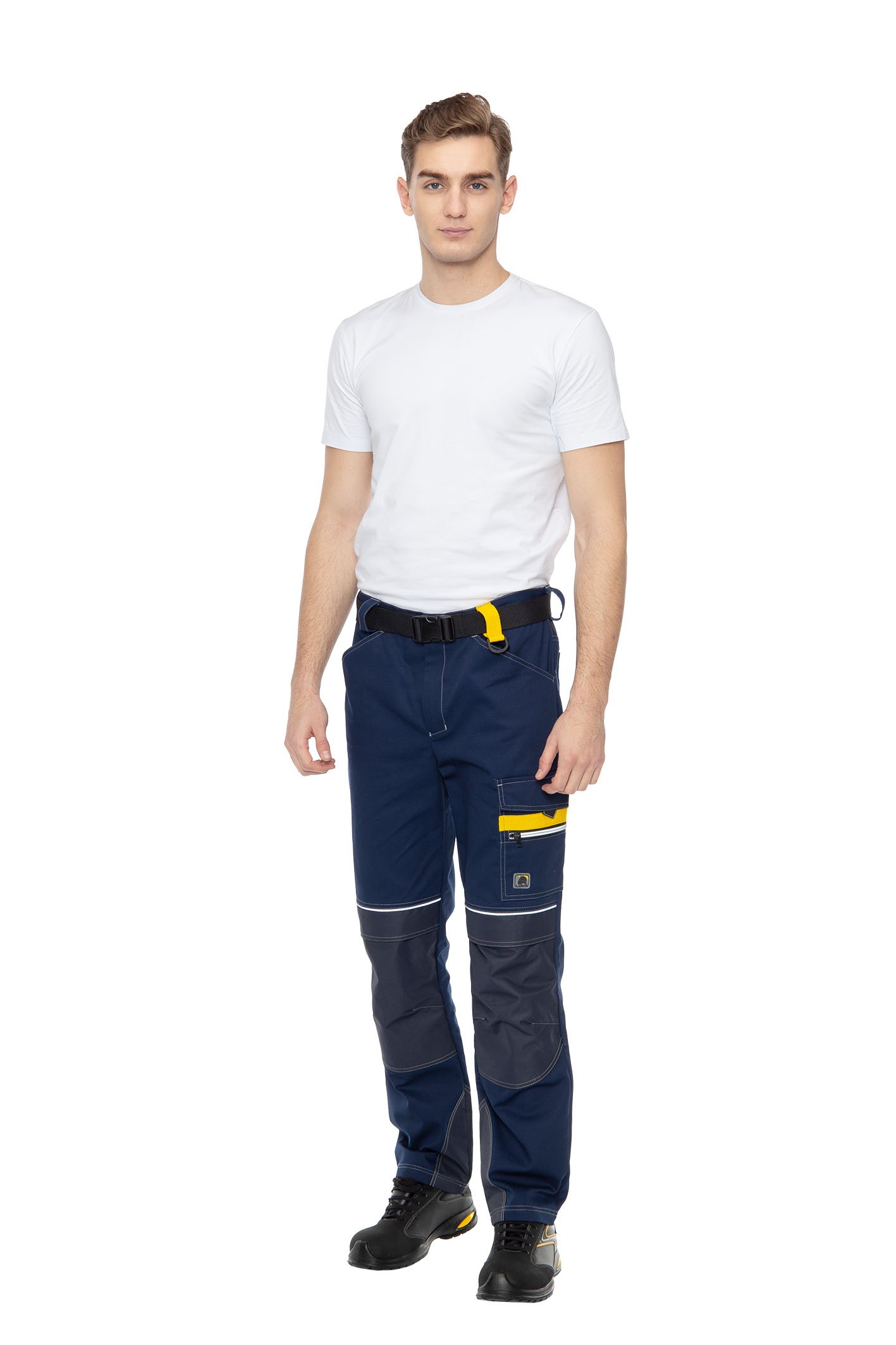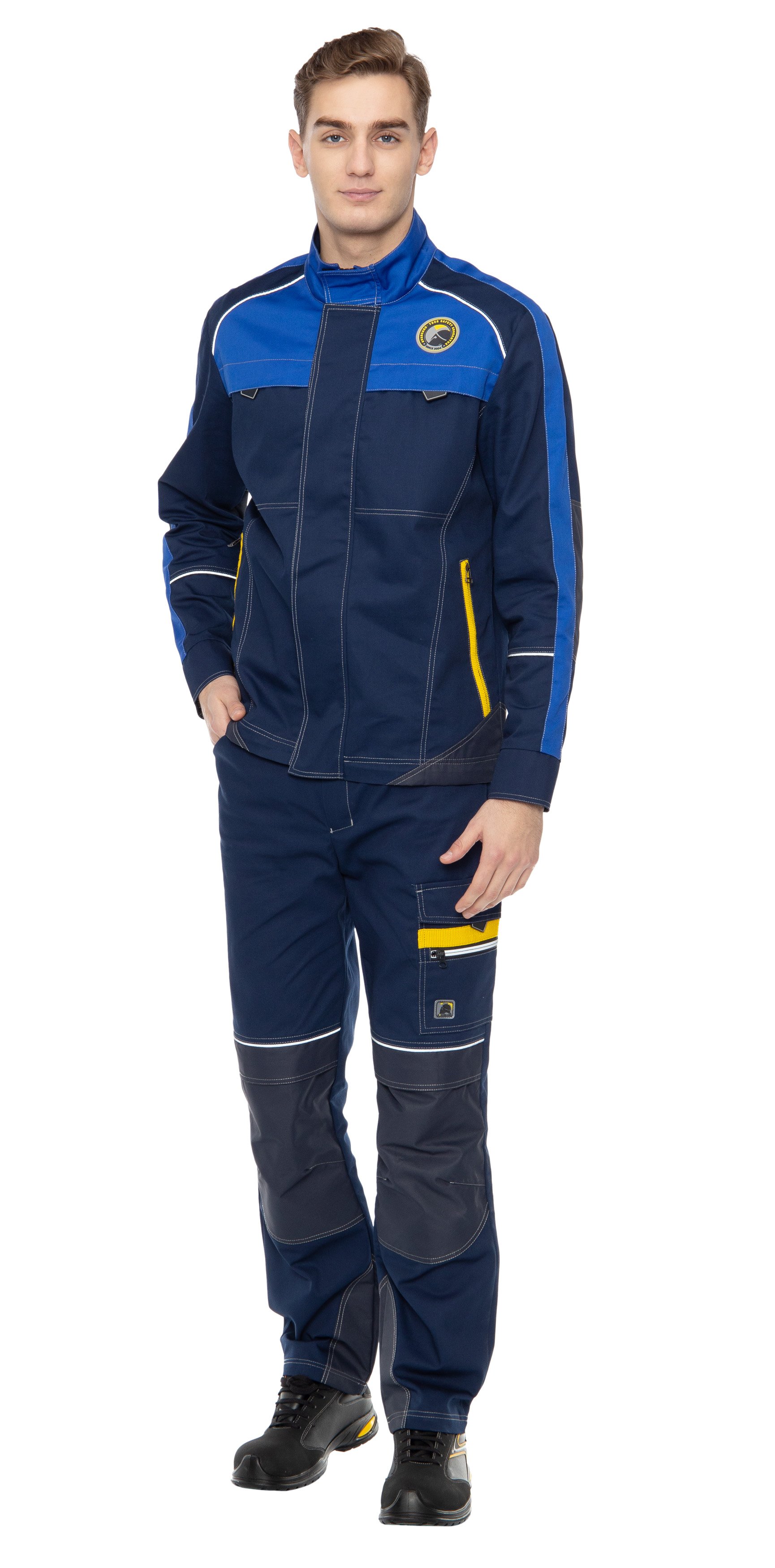 Брюки эргономичной формы с застежкой на молнию и металлическую пуговицу. Пояс с широкими шлевками, в том числе из стропы, и с полукольцом. На передних половинках верхние боковые карманы и карманы на коленях для амортизационных вкладышей. На задних половинках сложная кокетка, верхние накладные карманы и карманы для инструментов. На левой брючине в области середины бедра накладной карман с клапаном и отделом на молнии. Съемный пояс из ременной стропы на пластиковой пряжке. Световозвращающие канты на рукавах и кокетках куртки. В области коленей, задних карманов и низа брюк усилительные накладки из прочного материала.