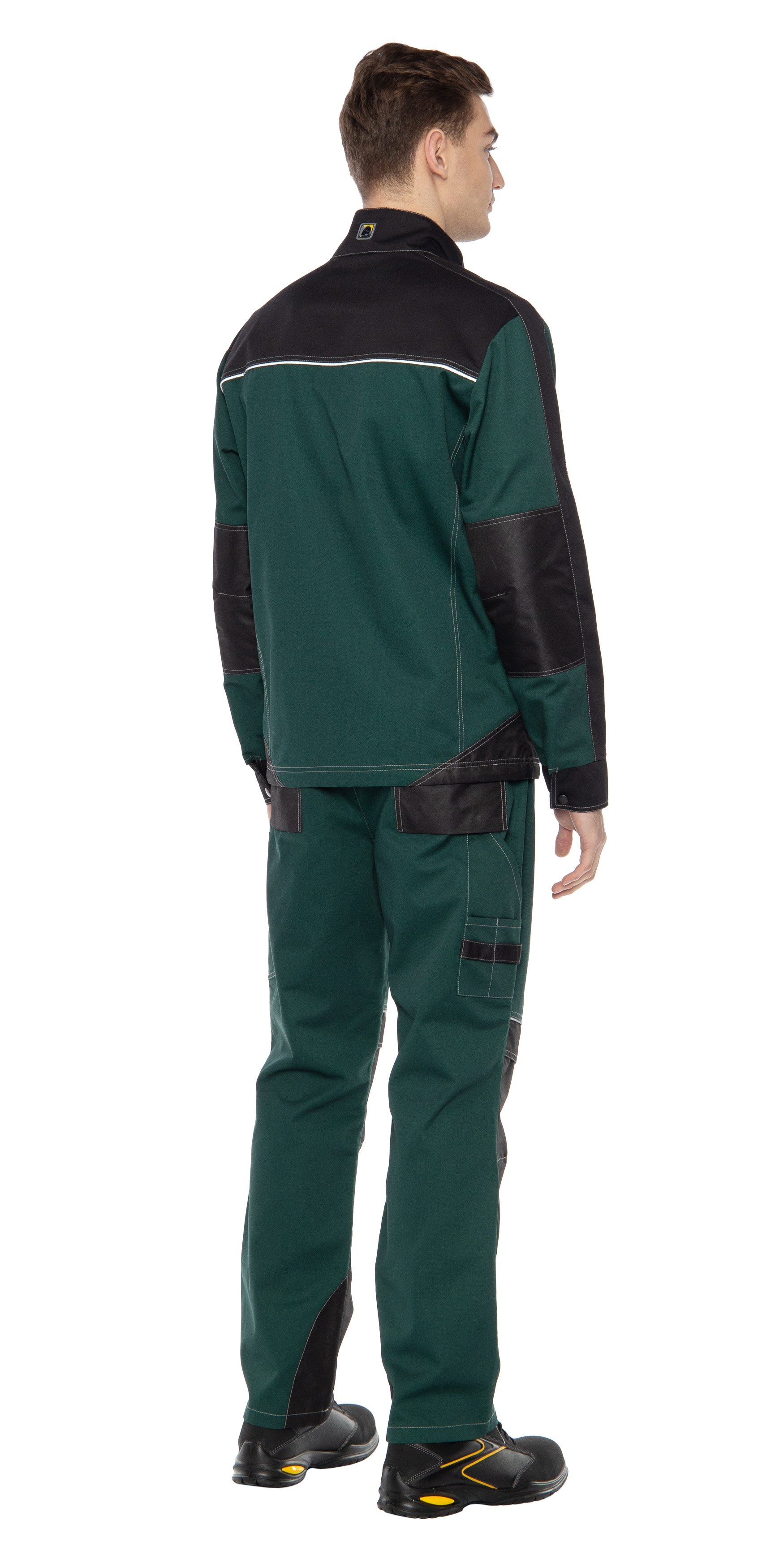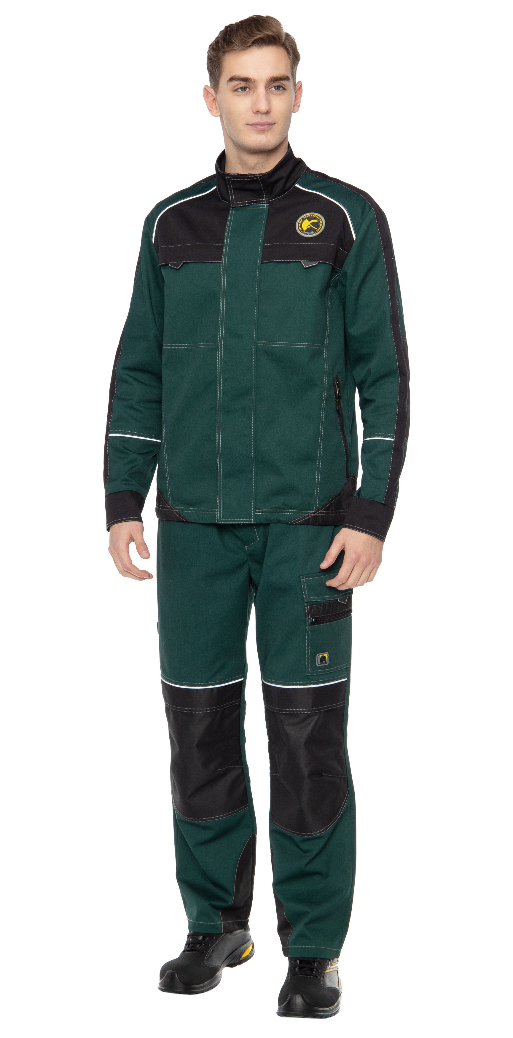 Куртка полуприлегающего силуэта с застежкой на молнию под планкой на липучках. Нагрудные карманы под кокеткой. Нижние карманы на молнии с отделкой из стропы. Спинка с кокеткой и вертикальными рельефами. Воротник - стойка. Объем куртки регулируется по низу потайной кулисой. Рукава втачные с манжетами на кнопке. Вентиляционные отверстия под проймой. Световозвращающие канты на рукавах и кокетках куртки. По низу боковых частей и в области локтей куртки усилительные накладки из прочного материала.