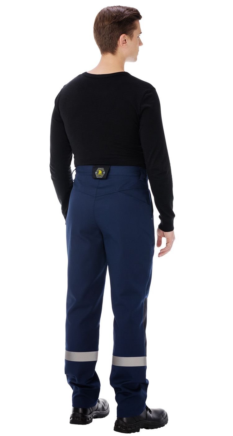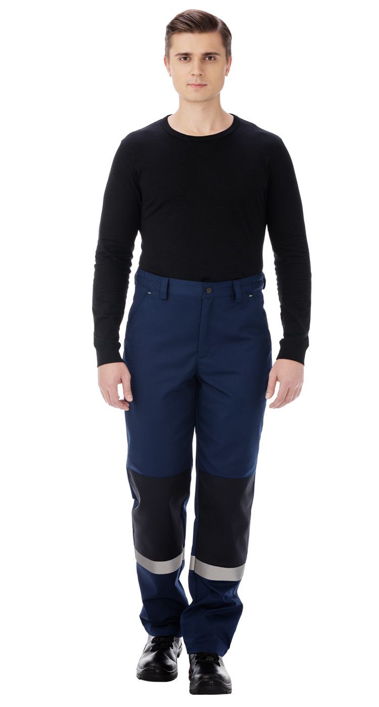 Брюки с застежкой на гульфик с молнией и пуговицу на поясе. Пояс со шлевками для фиксации ремня и эластичными вставками по бокам для регулировки объема. На передних половинках верхние боковые карманы. Усилительные накладки в районе колена. На задней половинке верхний карман с наклонным входом от бокового шва.