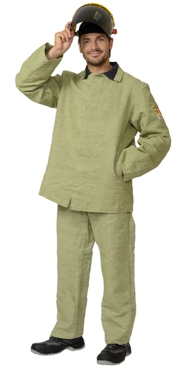 Брезент с ОП пропиткой, Куртка с потайной застёжкой на пуговицы, каманами в боковых швах. Воротник отделан бязью. На кокетке спинки и под проймами рукавов-вентиляционные отверстия для воздухообмена. Брюки с застежкой на пуговицы в боковых швах. ГОСТ 12.4.250-2013 ССБТ