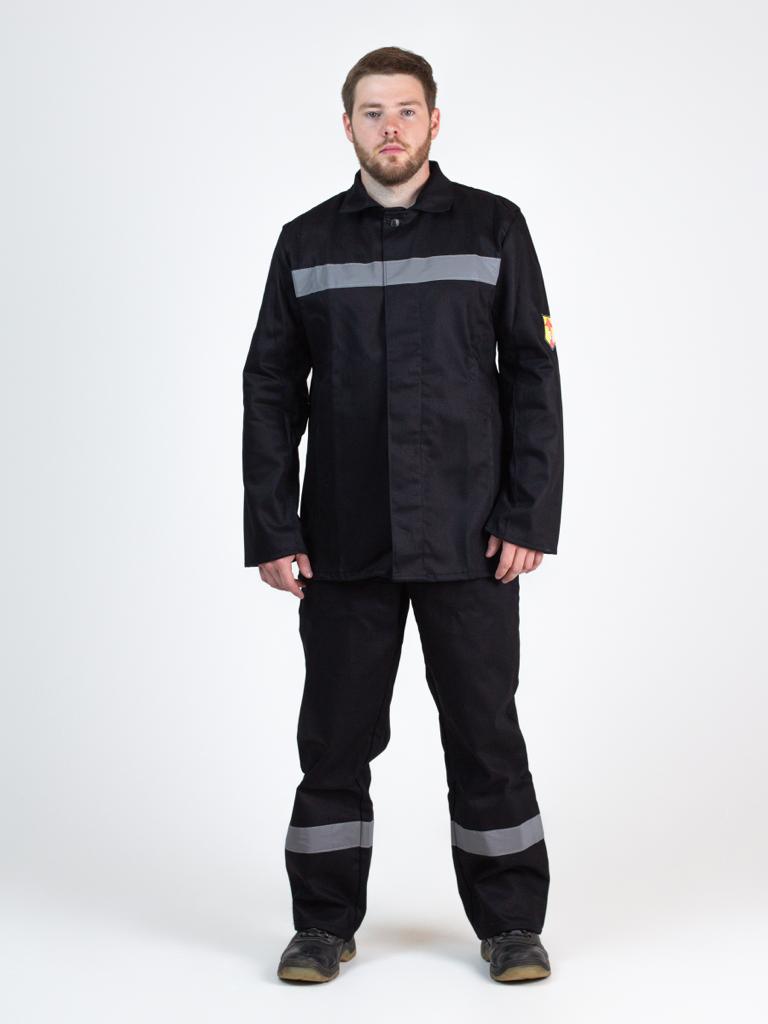 Куртка с супатой застежкой на петли и пуговицы. Полочки с усилительными накладками, с нижними карманами в швах притачивания усилительных накладок. Спинка с кокеткой, с вентиляционными отверстиями по шву притачивания кокетки. Рукава втачные, с усилительными накладками на верхних частях рукавов. Воротник отложной. Брюки с усилительными накладками на передних половинках брюк. И по линии груди и на спинке куртки, на передних и задних половинках брюк ниже колена располагается светоотражающая полоса.