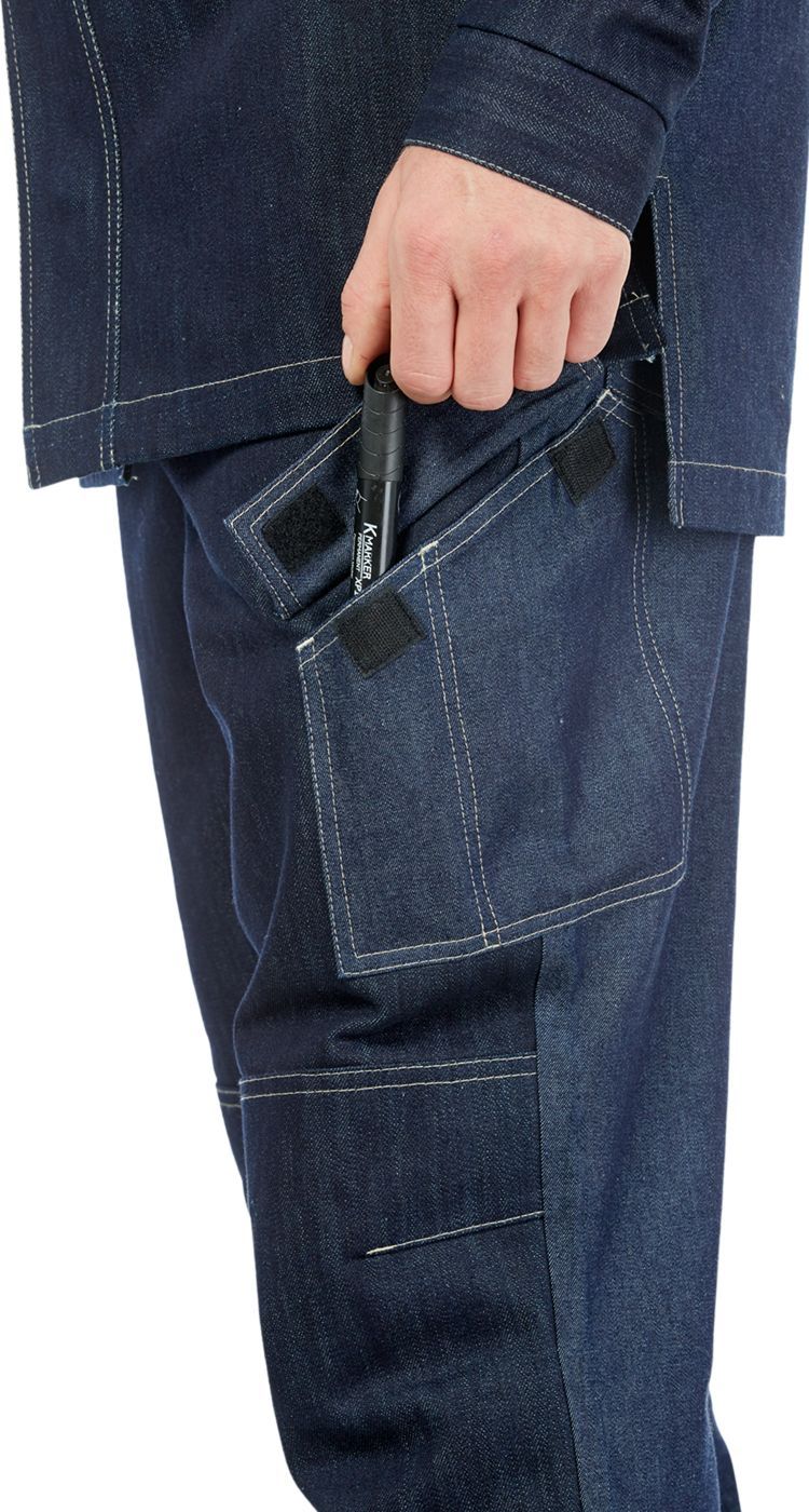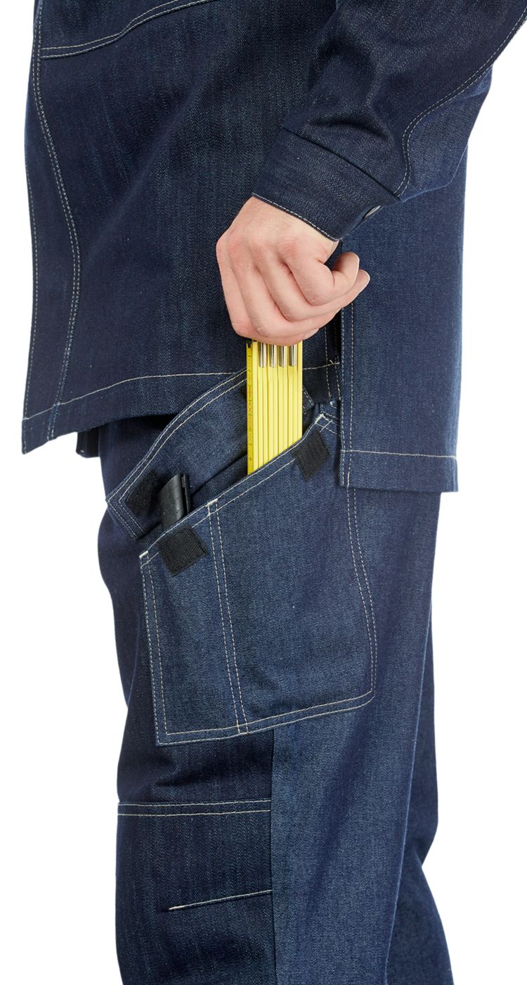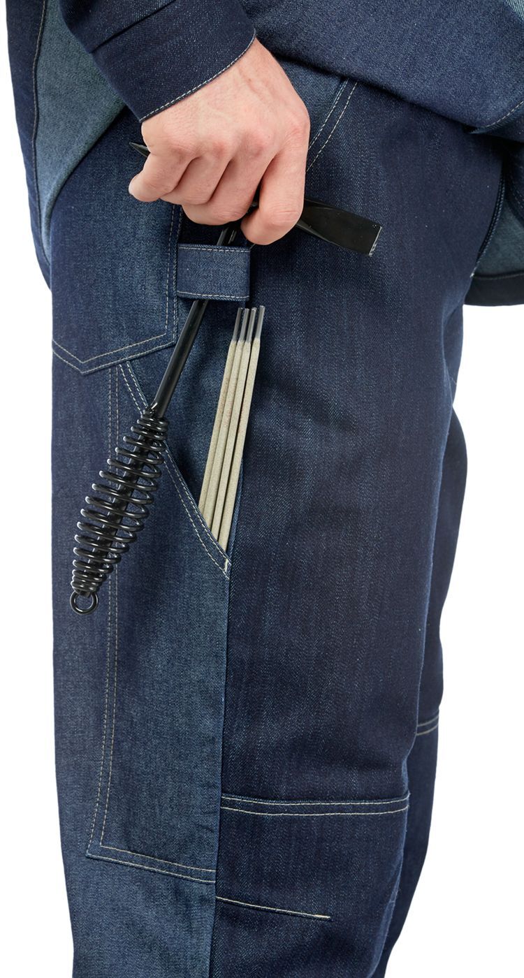 Верхние карманы с наклонным входом. В области коленей - усилительные накладки и карманы для амортизационных вкладышей. Боковой накладной карман, в области середины бедер слева, с широким клапаном и с отделом для маркера. На задних половинках - верхние накладные карманы, петля для молотка и карман для электродов справа. По низу брюк усилительные накладки.