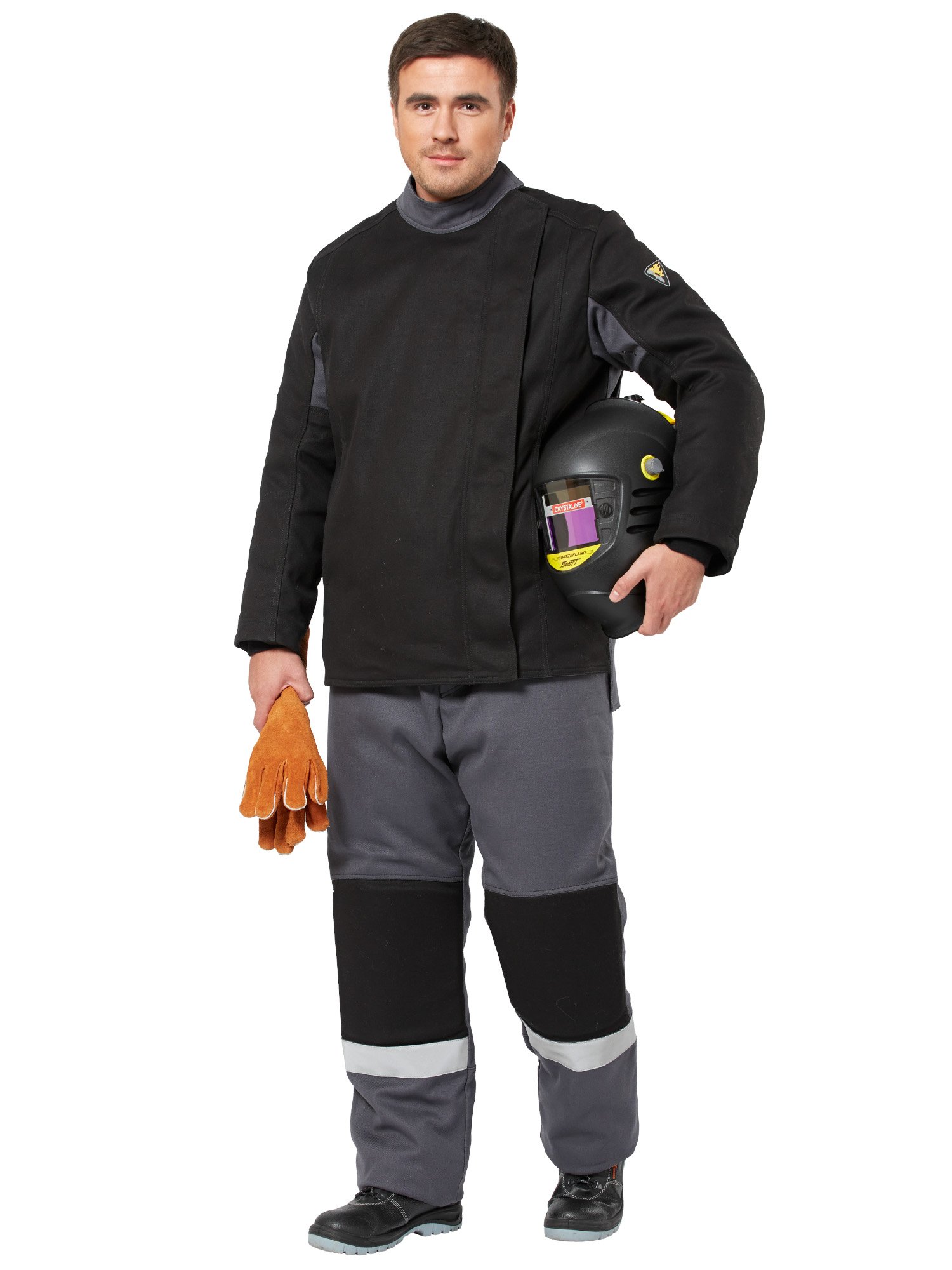 - куртка прямого силуэта, со смещенной в сторону левого борта супатной застежкой на молнию и кнопки (для исключения попадания искр и брызг металла под одежду), с удлиненной спинкой,
