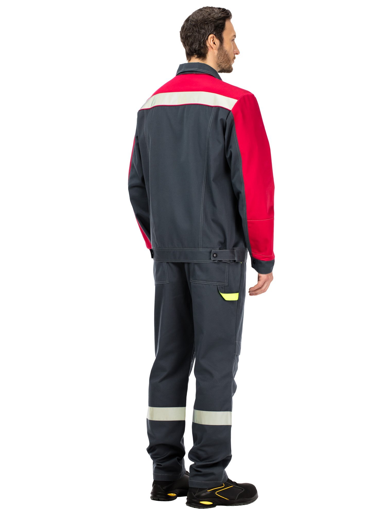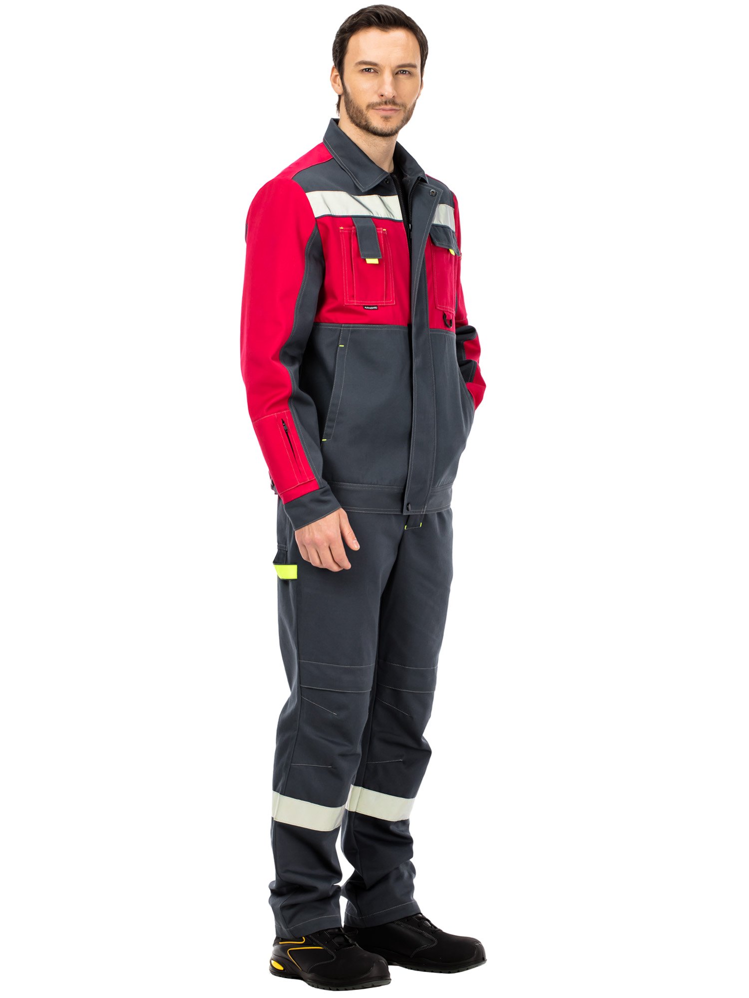 По низу кокеток куртки и по низу брюк расположены широкие световозвращающие полосы для безопасной работы в условиях плохой видимости.