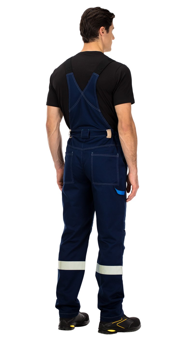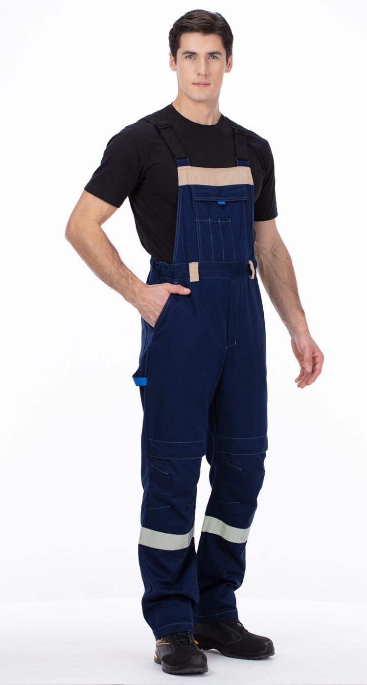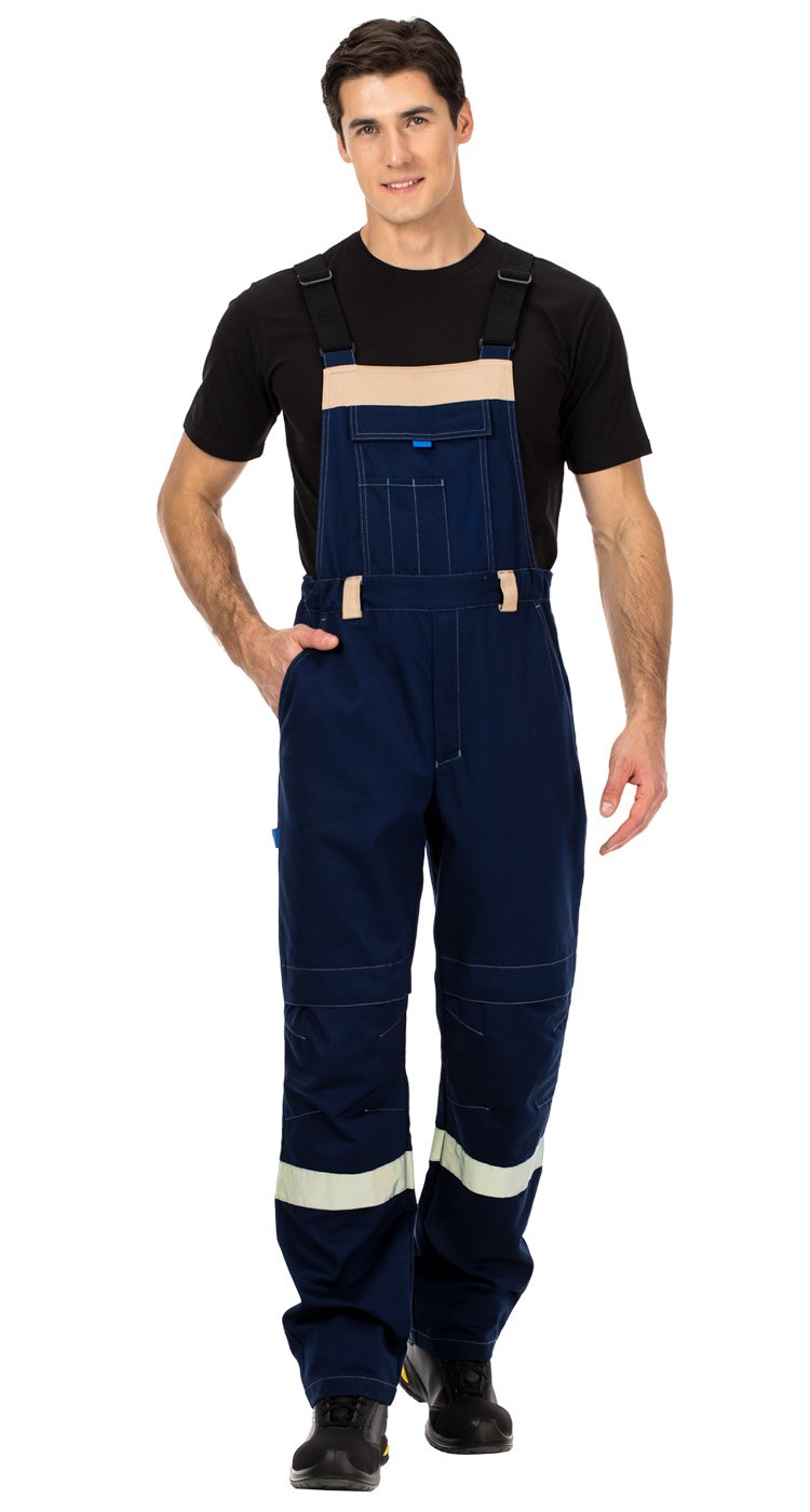 Полукомбинезон с застежкой на гульфик с молнией. Бретели с регулировкой длины из помочной резинки с пряжками. Спереди вместительный накладной карман с широким клапаном на липучке с отделами для тонких инструментов или ручек. Пояс со шлевками. Регулировка объема по талии за счет боковых вставок с эластичной тесьмой. На передних половинках - верхние карманы с боковым входом и карманы для амортизационных вкладышей в области колен на липучках. На задних половинках верхние накладные карманы, а также хлястик для инструментов.