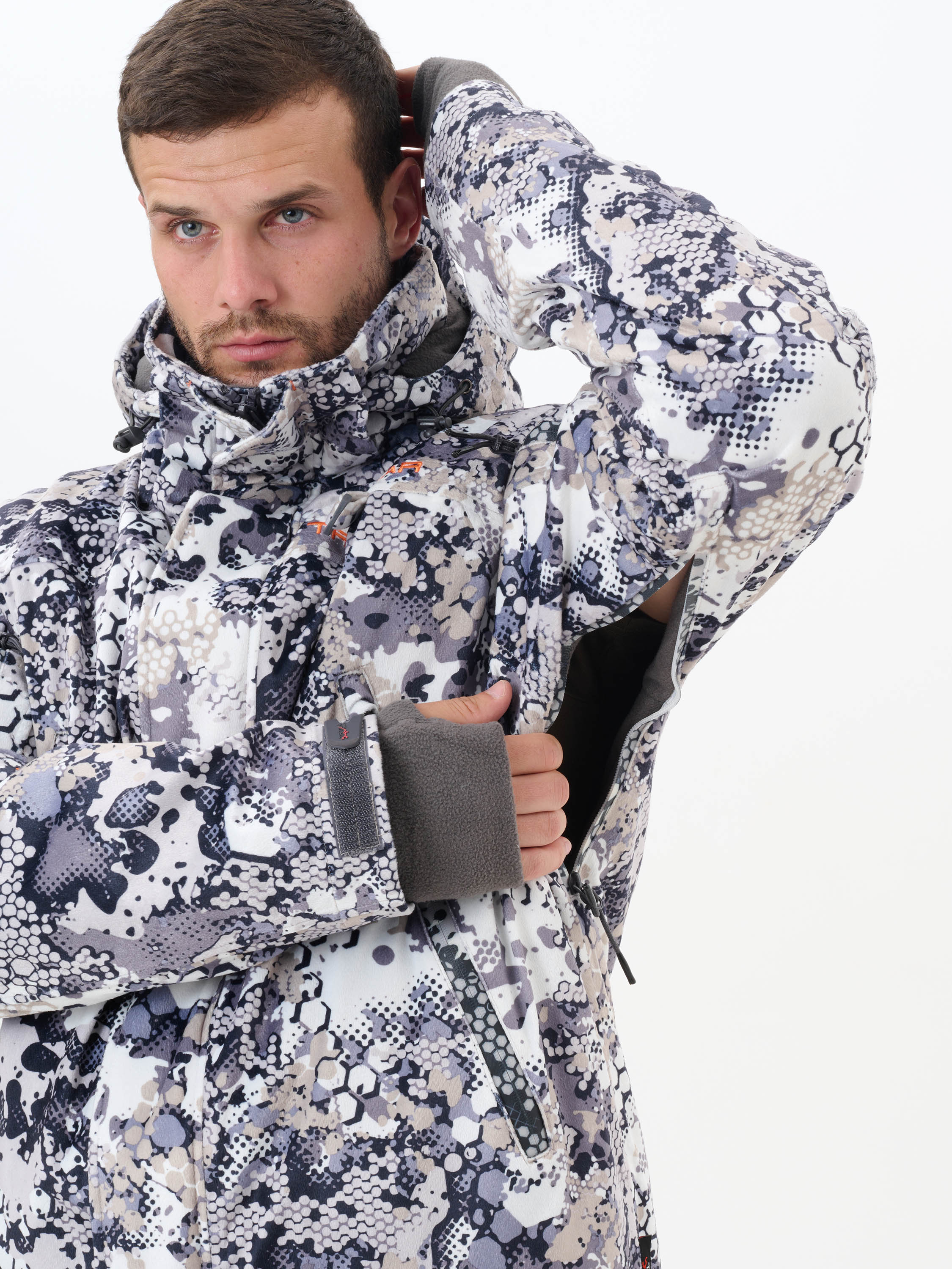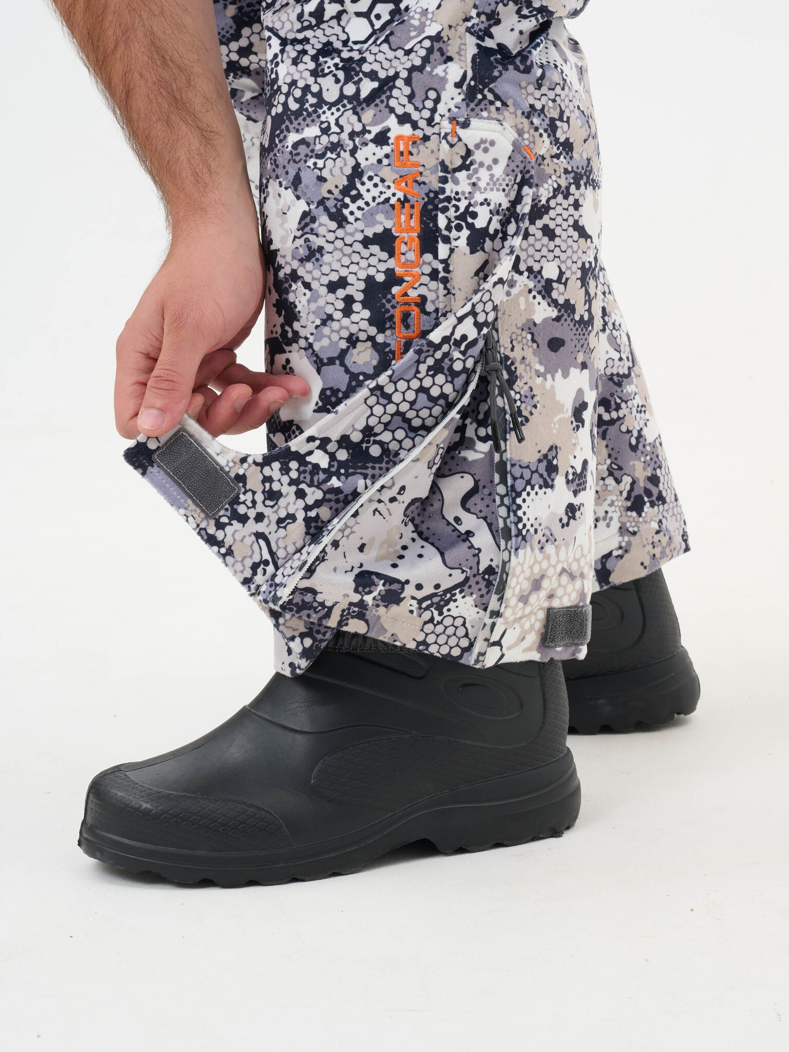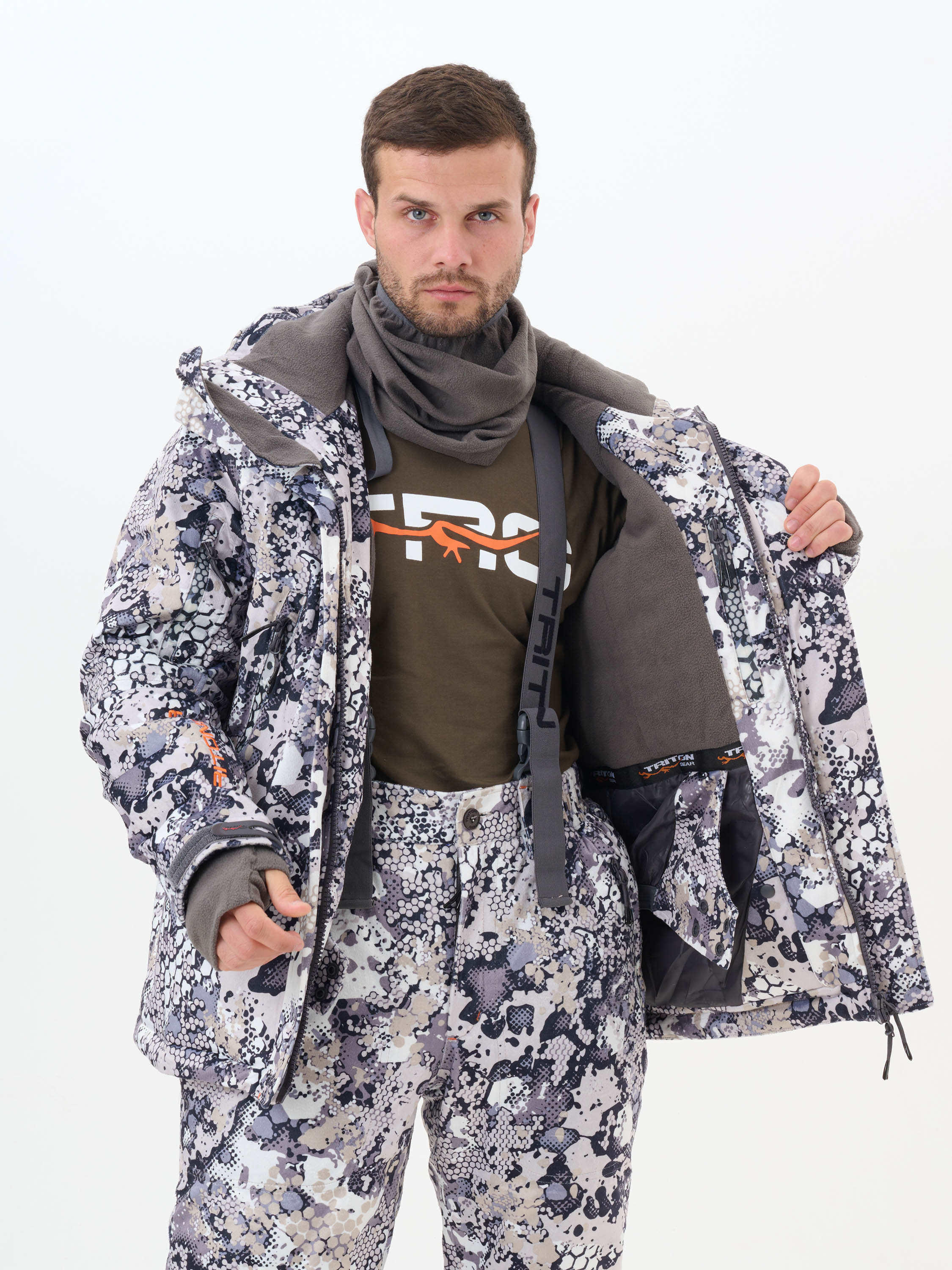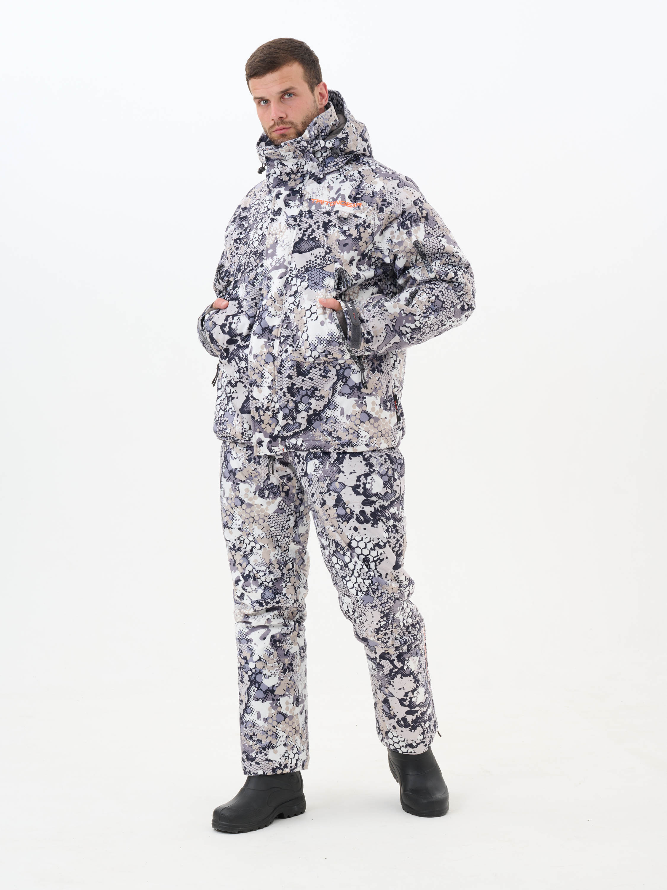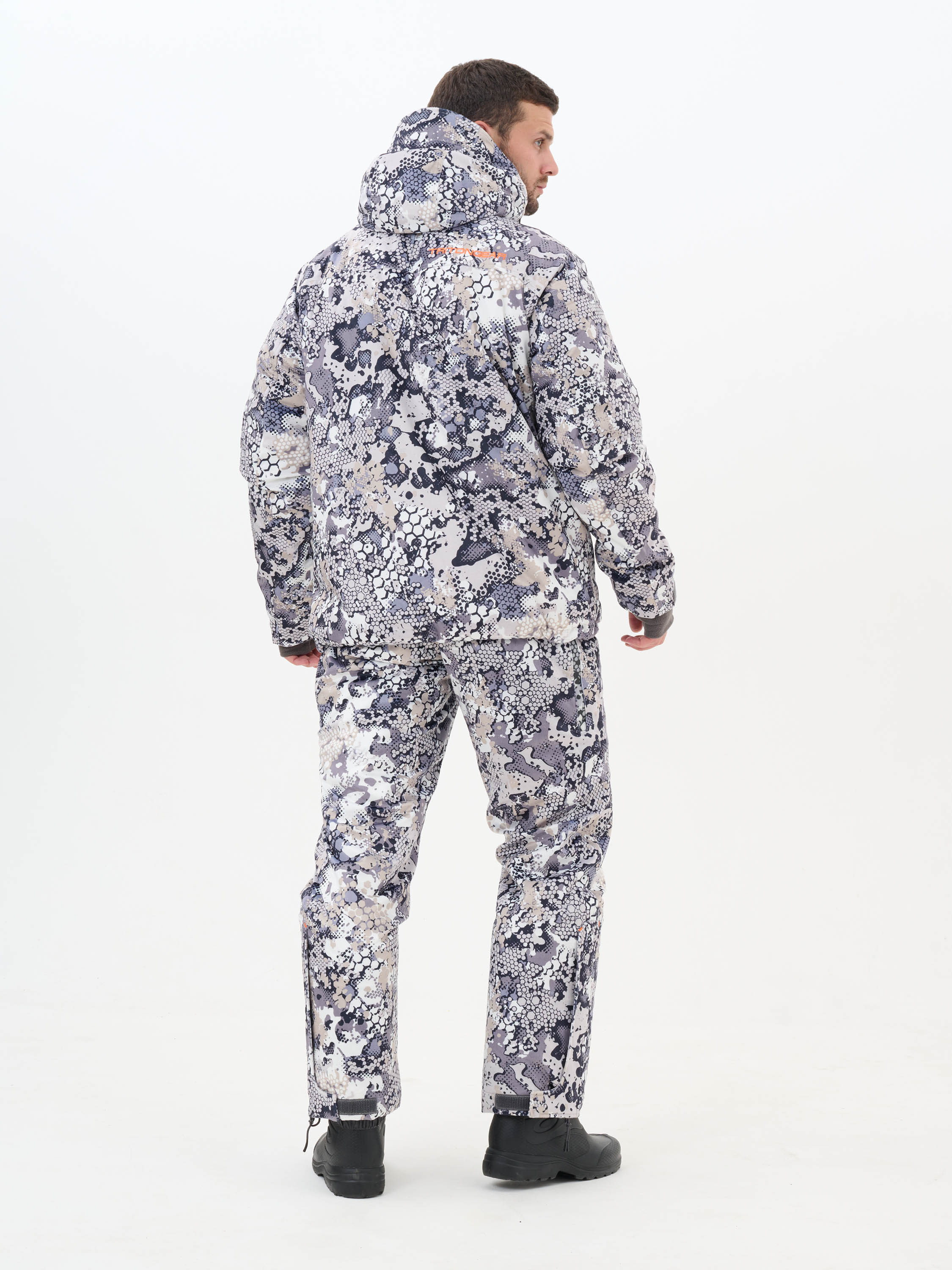 Подклад: Флис. Состав: 100% полиэстер. Костюм изготовлен из мягкого и прочного материала Вельбоа на основе тонких полиэстеровых волокон, имеющим бархатистую и очень приятную на ощупь поверхность, которая абсолютно не шуршит. Костюм имеет съемный спинник на брюках. Шарф-труба во внутреннем кармане куртки. Съемный капюшон. Ветрозащитная ""юбка"". Вентиляция на молнии в зоне бедер. Съемные подтяжки."